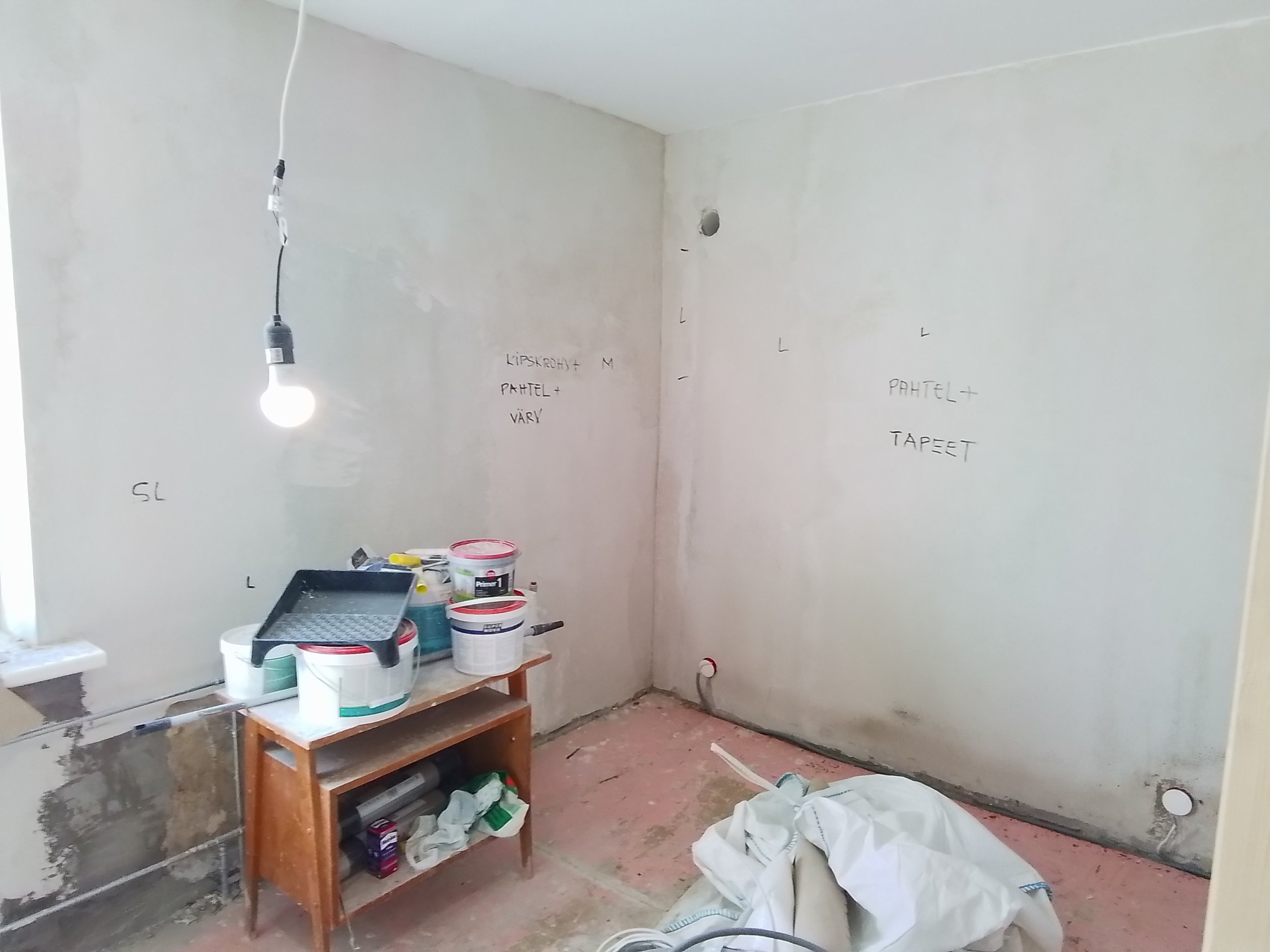 Soovin saada hinnapakkumist korteri siseviimistlustööde tööde teostamise (tööraha) hinnale. Kipskrohv, pahtel, värv ja vesi tellija poolt, töövahendid ja töö tegemine töö teostaja poolt. Magamistoas ja elutoas on seinad juba kipskrohvi ja pahtliga osaliselt tehtud ning pinnad kuni aluskrohvini puhastatud. Laed on vajalikes kohtades pahtliga tasandatud ja korra värvitud. Olukord nähtav lisatud piltidelt
