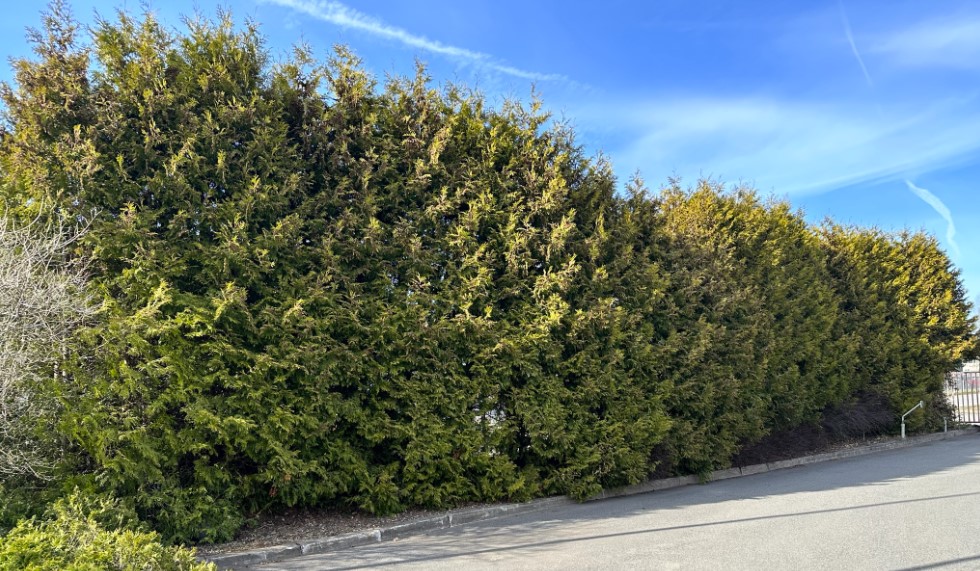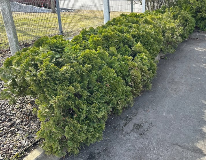 1. Suur hekk, täna ca 5m kõrge ja 25m pikk. Võiks pügada vähemalt meetri lühemaks samuti külgedelt kitsamaks.