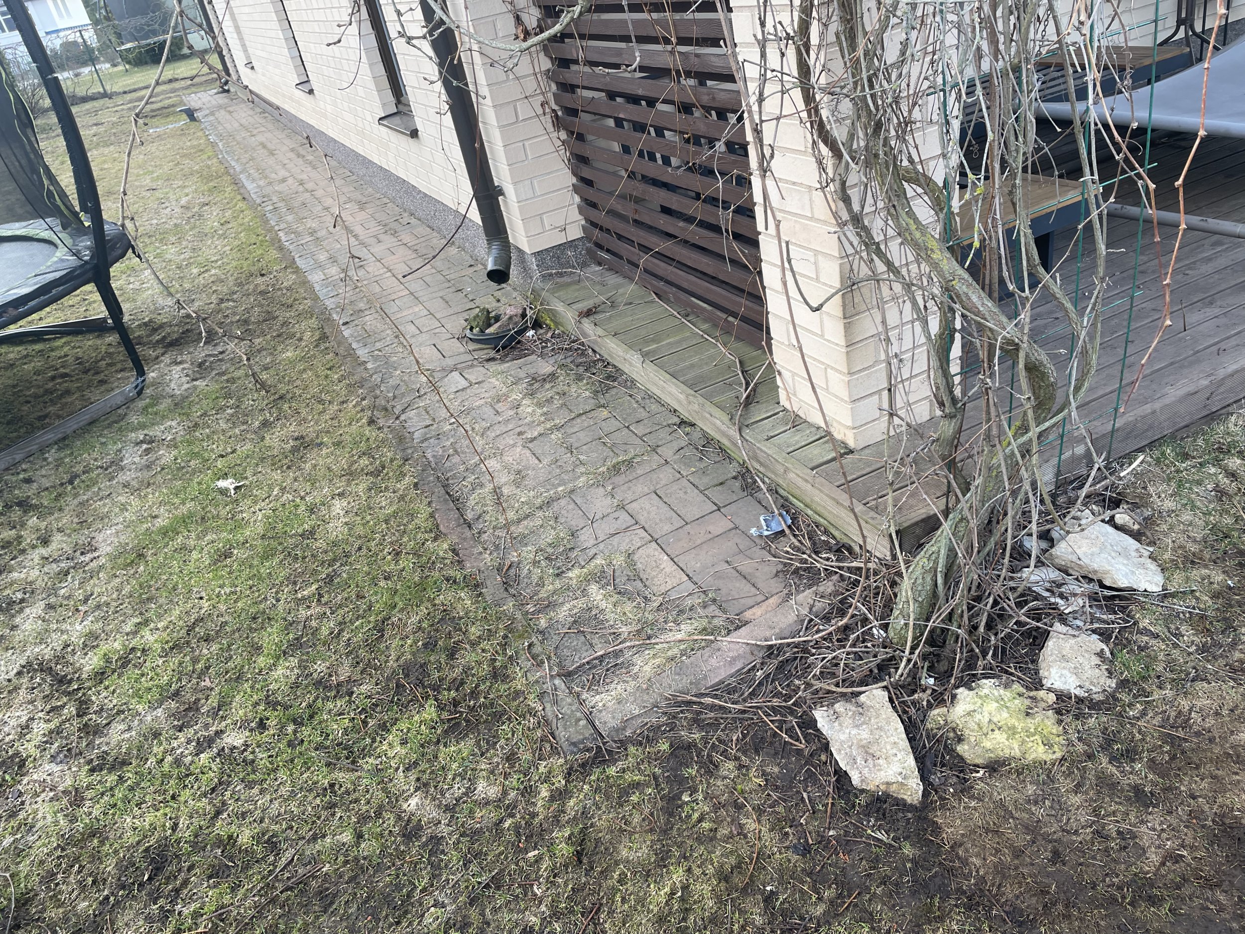 Mõõdud on laius 245cm, pikkus hetkel 1020cm. Variant A oleks olemasoleva terassi samal kujul uuesti ehitamine. Variant B näeks ette terassi tagaosas oleva puidust võreseina eemaldamist ja terassi pikendamist maja taha ja ümber nurga. Äärekivide osa on 80cm, terassi võiks samuti ulatuda 2.5m majast ning vähemalt 2m ka ümber nurga.