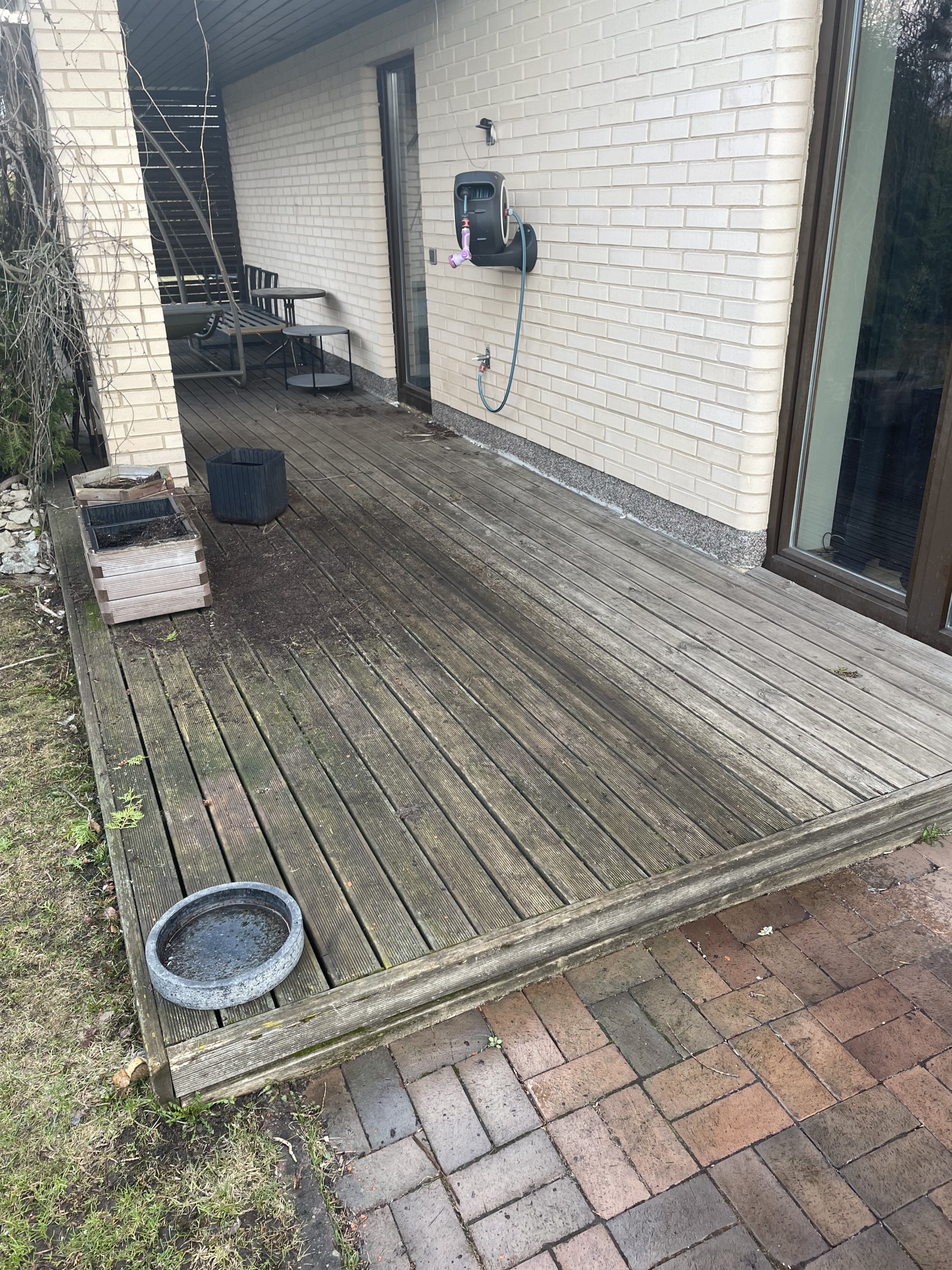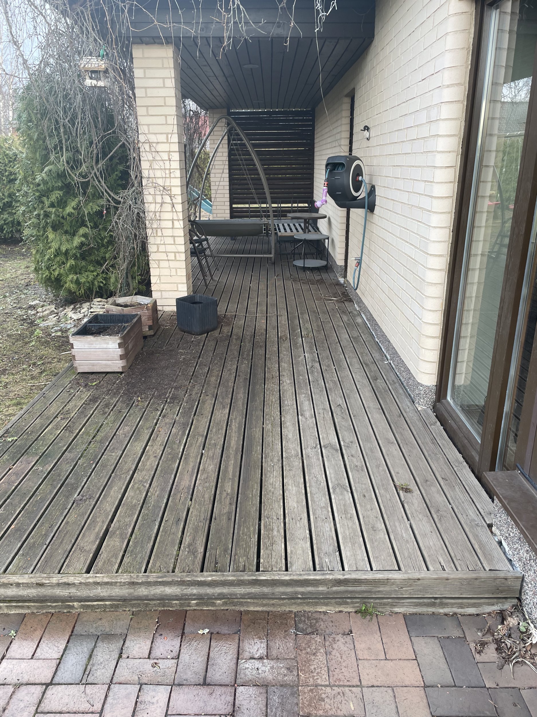 Olemasolev terass on ajaga ära väsinud ja osadest kohtadest katki, puhtalt puhastamise ja värvimisega seda tõenäoliselt enam korda ei tee. Sellega seoses sooviksime terassi ära värskendada. Kahjuks ei oska öelda mis seisus ja kuidas on tehtud aluskarkass (võimalus tulla kohapeal üle vaadata).
