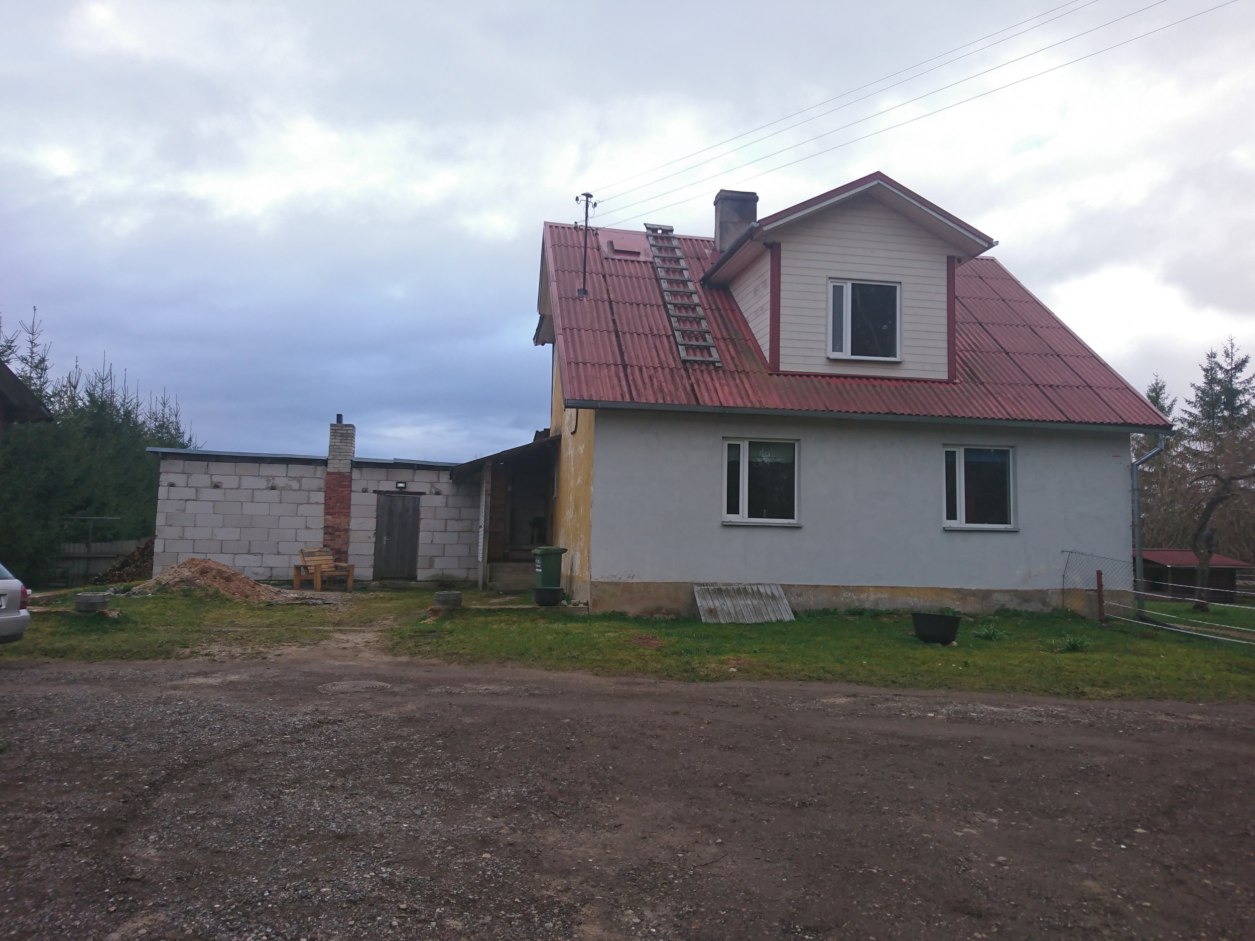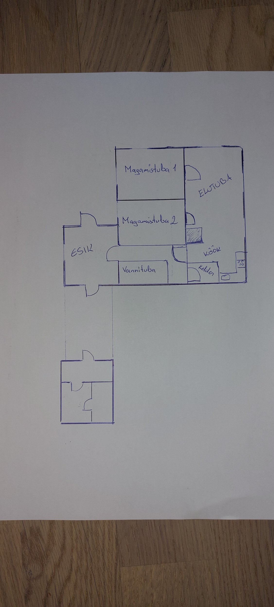 Majast niipalju, et esimene korrus on püstpalk, teine karkass. Soojustuseks saepuru, fassaad TEP-plaat vms. Põrandad on tuulduvad. Pool maja alusest on kelder, mille lagi on 5-10cm betooni(kehvas seisus), sellepeal linaluu/saepuru , puittalad ja põrandalaud. Kohati on vundament pude ja mõrades. Plaan teha kahekordsest majast ühekorde(Uued vermid, katus, soojustus jne), teha uued põrandad betoonist ja ümber ehitada esimene korrus nii, et seal oleks olemas koridor, vannituba, 2 magamistuba, köök ja elutuba. Tegin ka mingisuguse visandi. Pakkumise võib teha arvestusega, et seintes püstpalgid on korras ja aluspalke/aknaaluseid läheb vahetusse ~40jm.