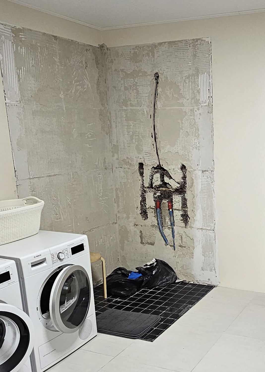 Enne plaatimist vaja seina sisse paigaldada dušisüsteem. Vana süsteem eemaldatud. Seina sees auke vaja ümber teha, et uus süsteem sobiks. Fibo 5 seinad. Uued tooted Axor. Seinasisu basic box 45710180. Torud kõik tulevad aluplex 16mm ning pressitavate otstega. Materjalid pakkuja poolt. Kõik toruotsad, põlved jne. Ehk siis seinasisu box ning üladuši väljund ja käsiduši väljund. Töö alustamine esimesel võimalusel. Sisu olemas. Töö peaks olema tehtud hilisemalt 23.04