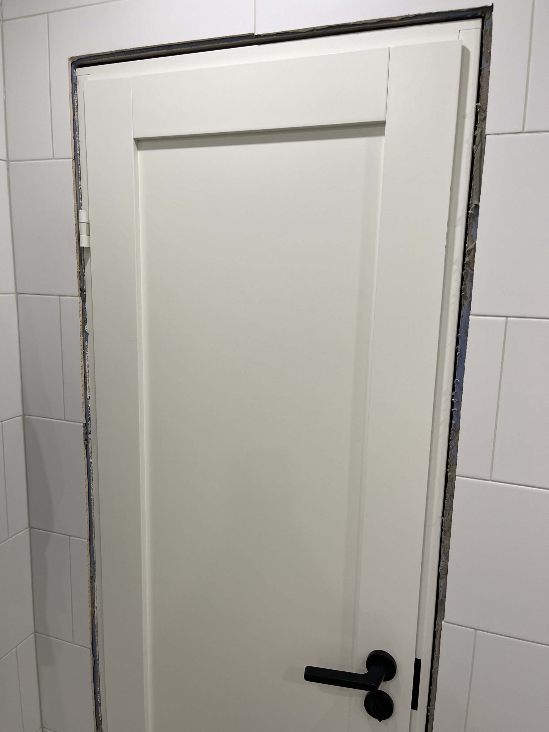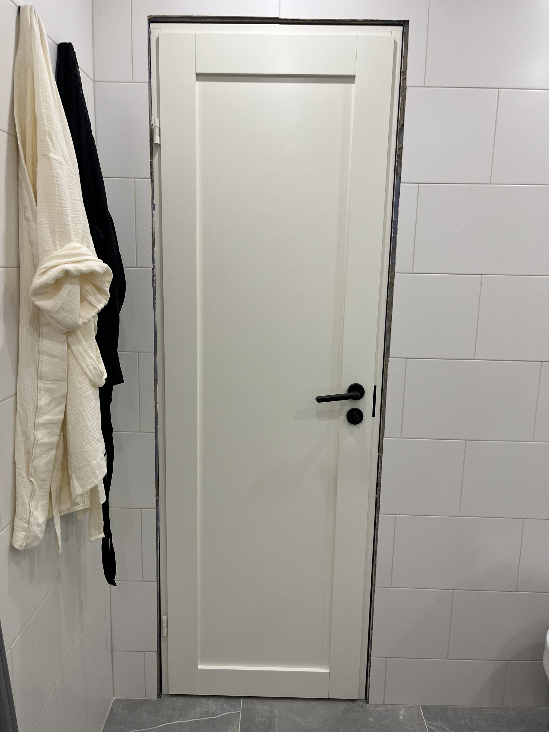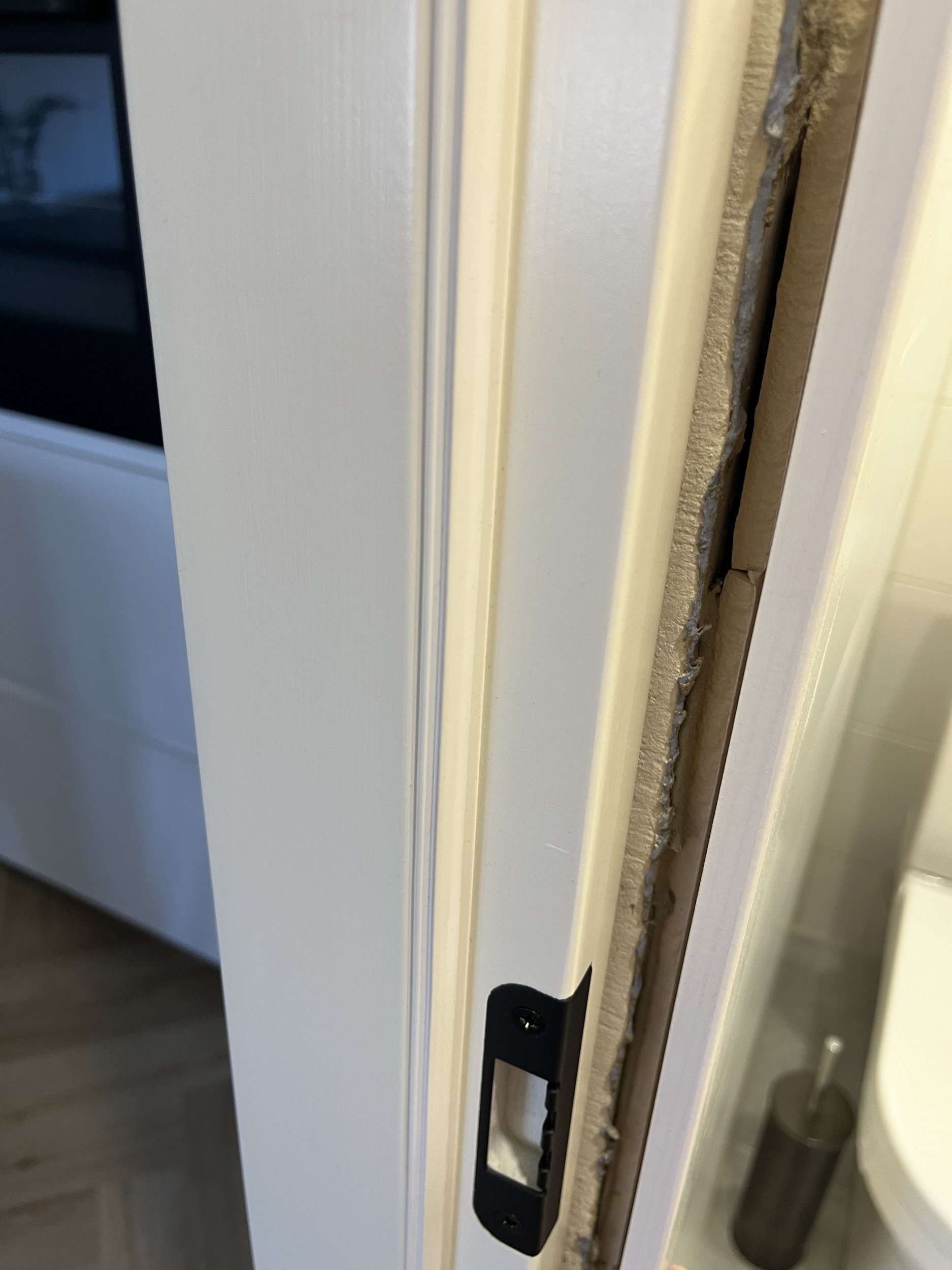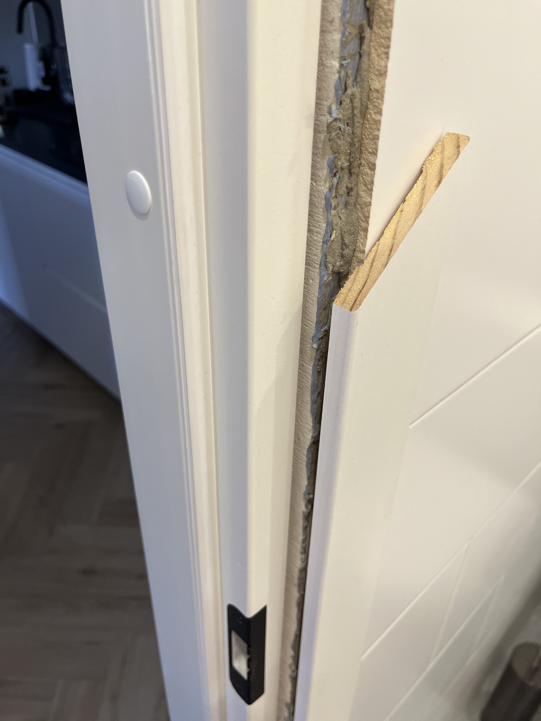 Vannitoauksele piirdeliistude paigaldus ühele poole. Vaja oleks olemasolevad liistud mõõtu lõigata ja paigaldada visuaalselt analoogselt teisel pool ust tehtud tööga, samuti leida lahendus nn vaheliistu jaoks (sein on ukseraamist keraamilise plaadi jagu paksem, tekkiv vahe oleks vaja katta ilmselt väikese lisaliistuga - vt pilte). Eelmine töömees kahjuks väsis enne tööga lõpule jõudmist ära.