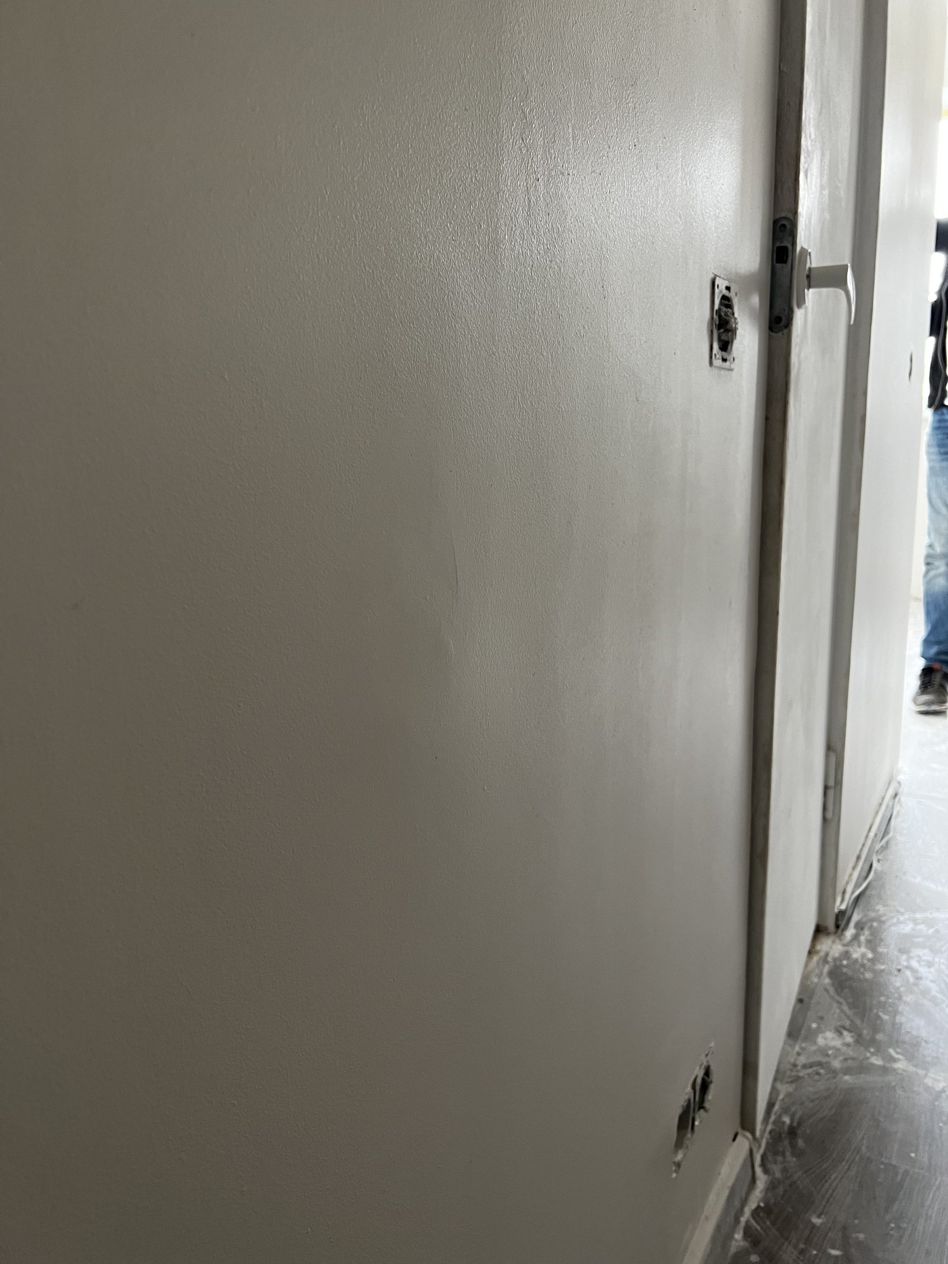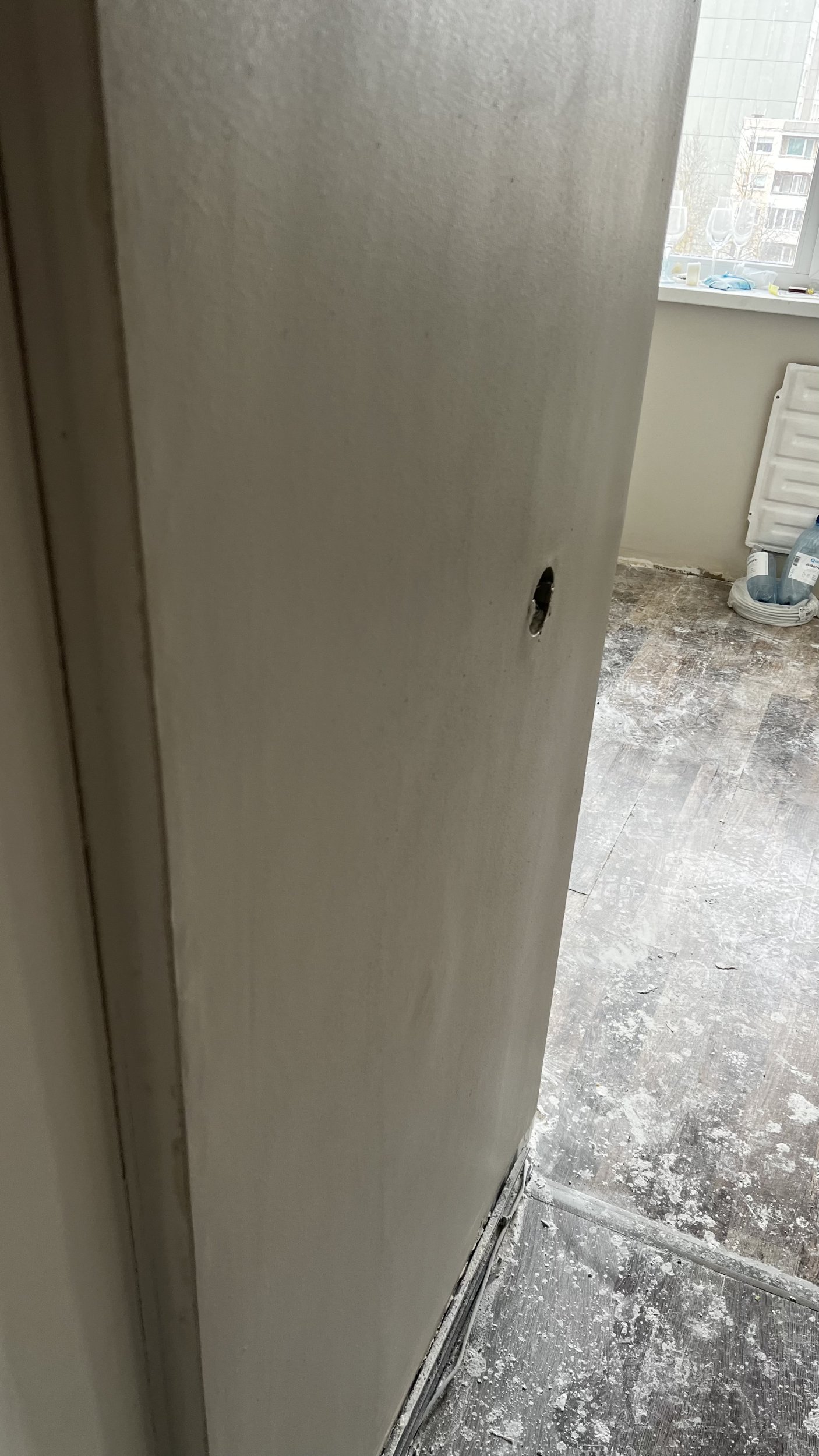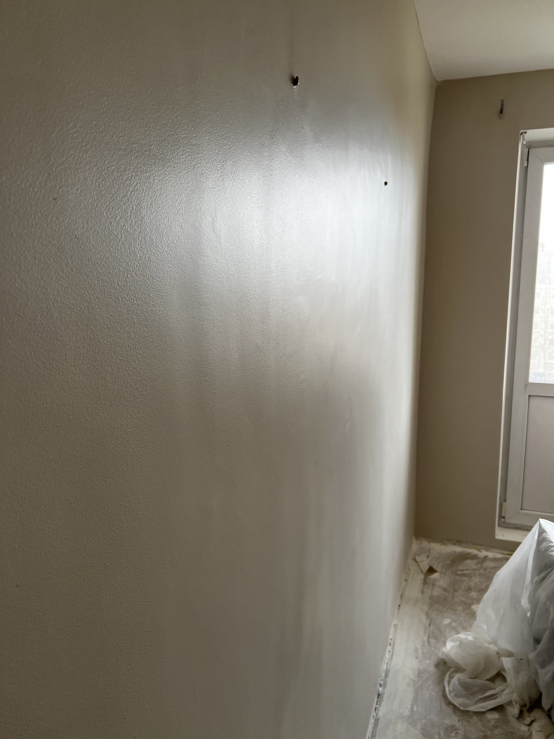 Väga saamatu töömees tasandas ja värvis seinad. Tulemus on väga halb. Mõnes kohas on mullid. Vaja on ebakorrapärasusi parandada ja mullid eemaldada, ukseavasid joondada. Ning kõik uuesti värvida.