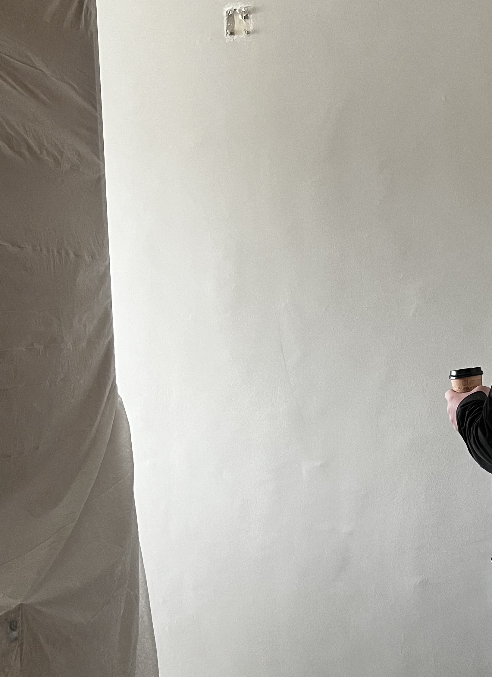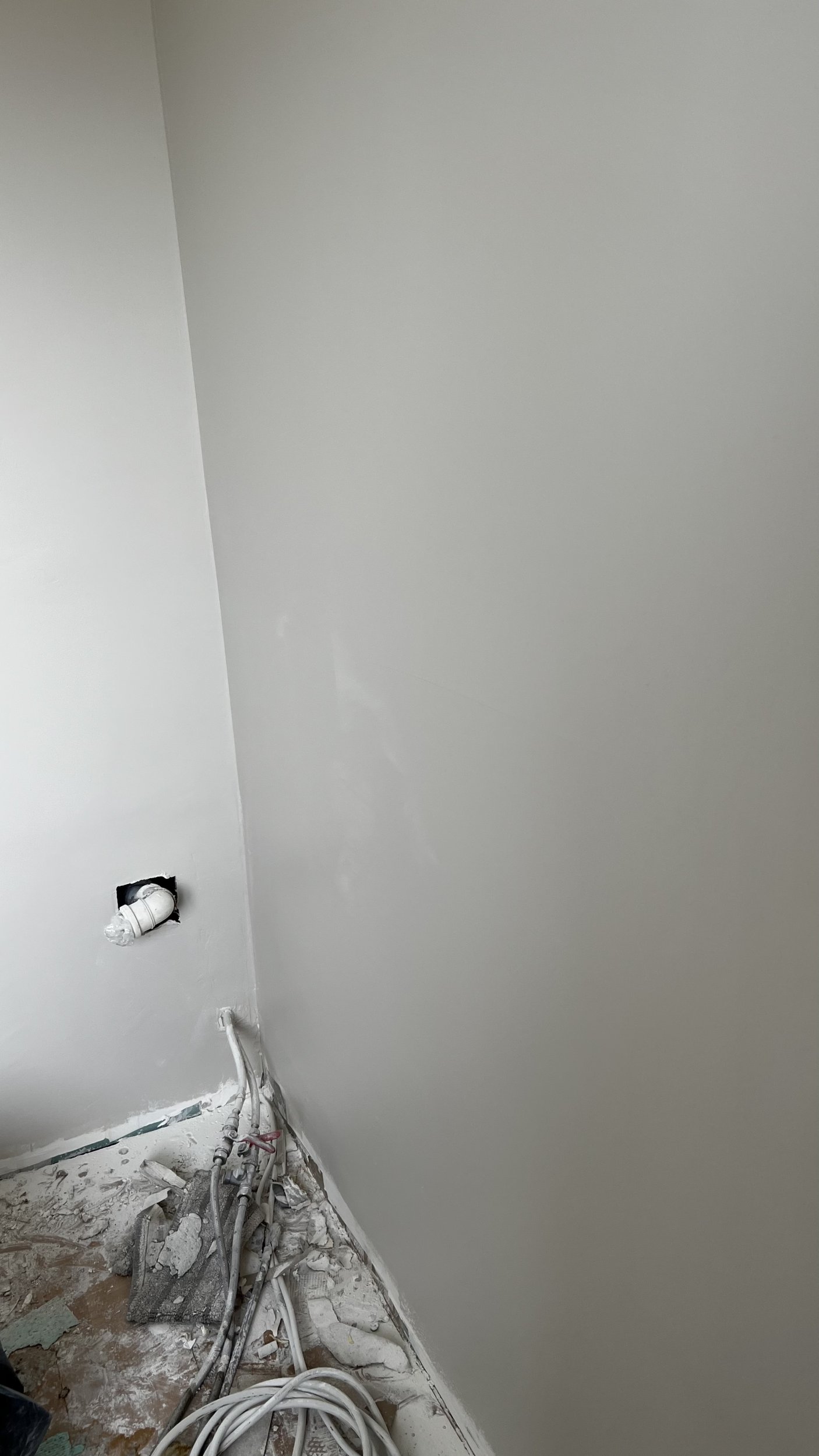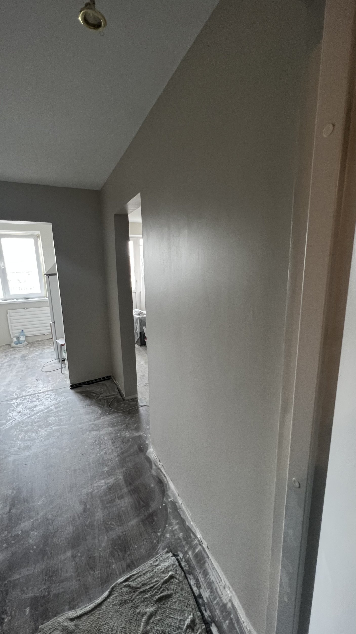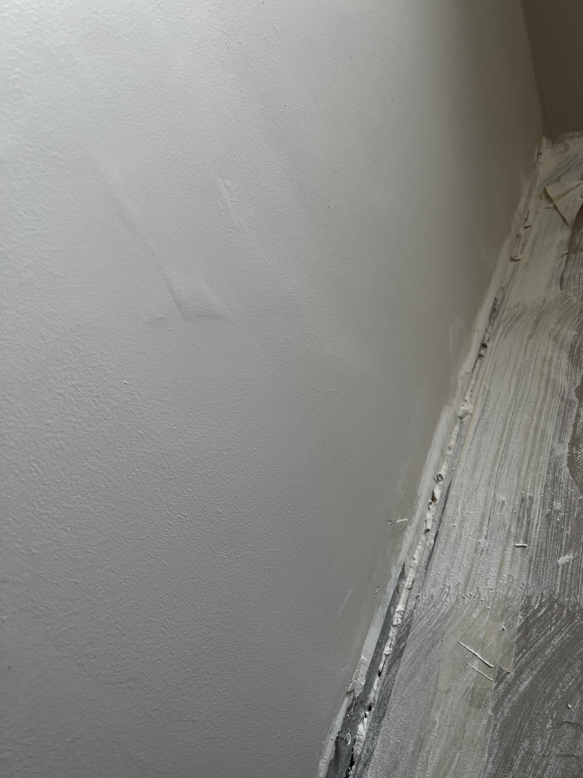 Väga saamatu töömees tasandas ja värvis seinad. Tulemus on väga halb. Mõnes kohas on mullid. Vaja on ebakorrapärasusi parandada ja mullid eemaldada, ukseavasid joondada. Ning kõik uuesti värvida.