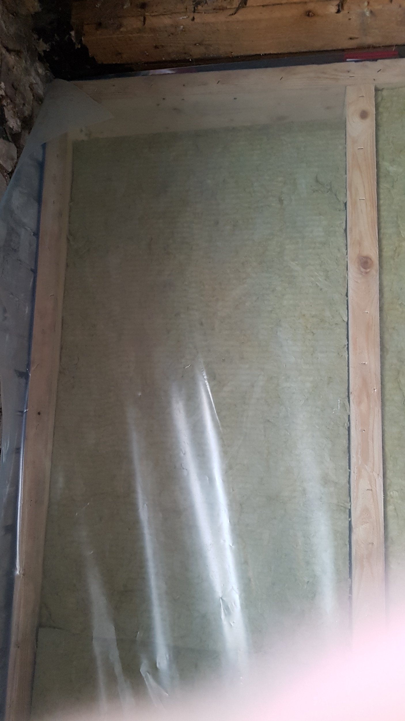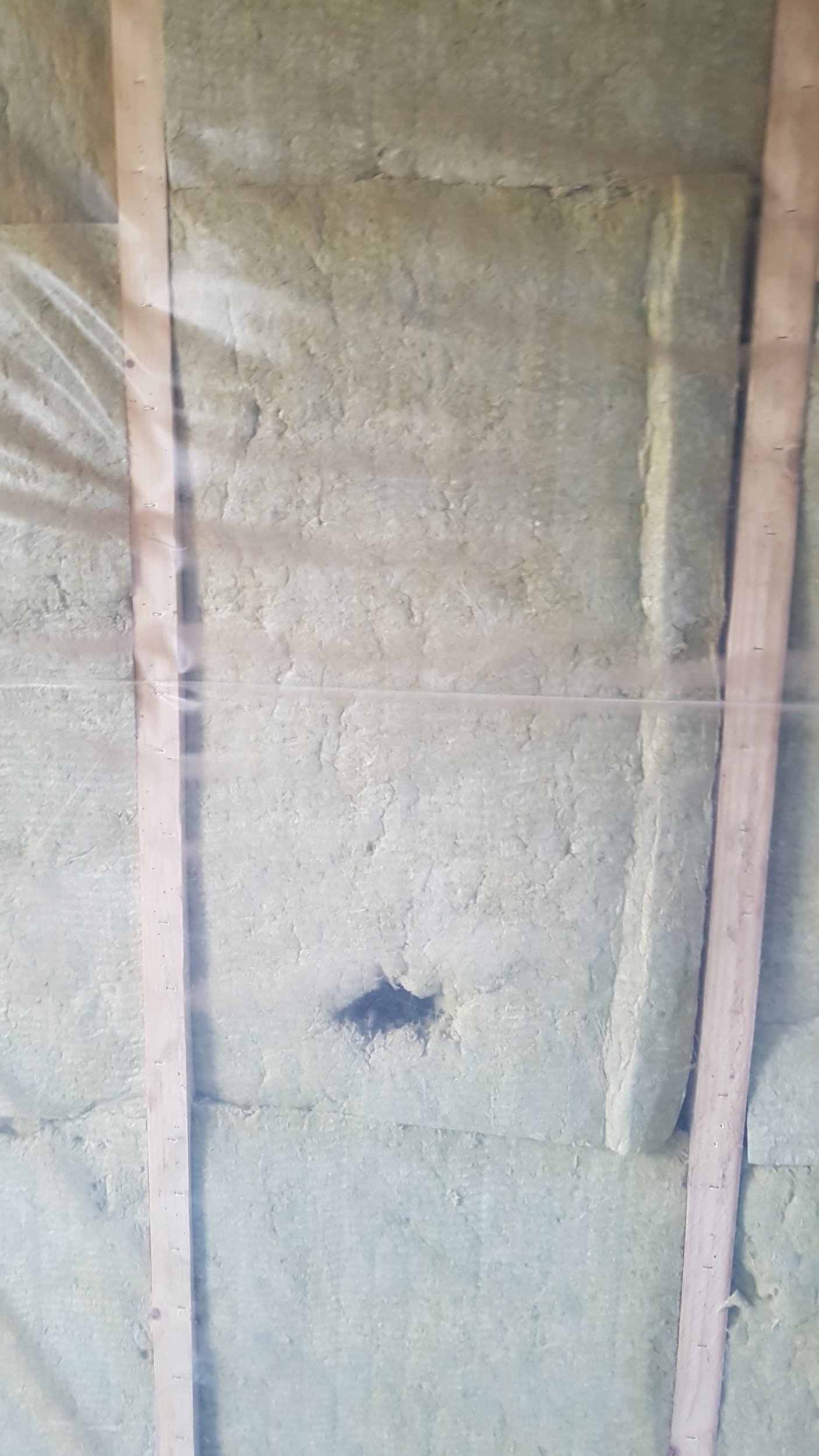 Kahe korteri vaheline sein on juba uuesti ehitatud, aga vajab vähest parandamist - vahetada välja kaks praaki villaplaati paksusega 150mm ning sättida/täita üks ~15x60cm avaus vaheseinas (villaplaadid on ära vajunud). Teipida/kinnitada seinal olev kile korralikult.