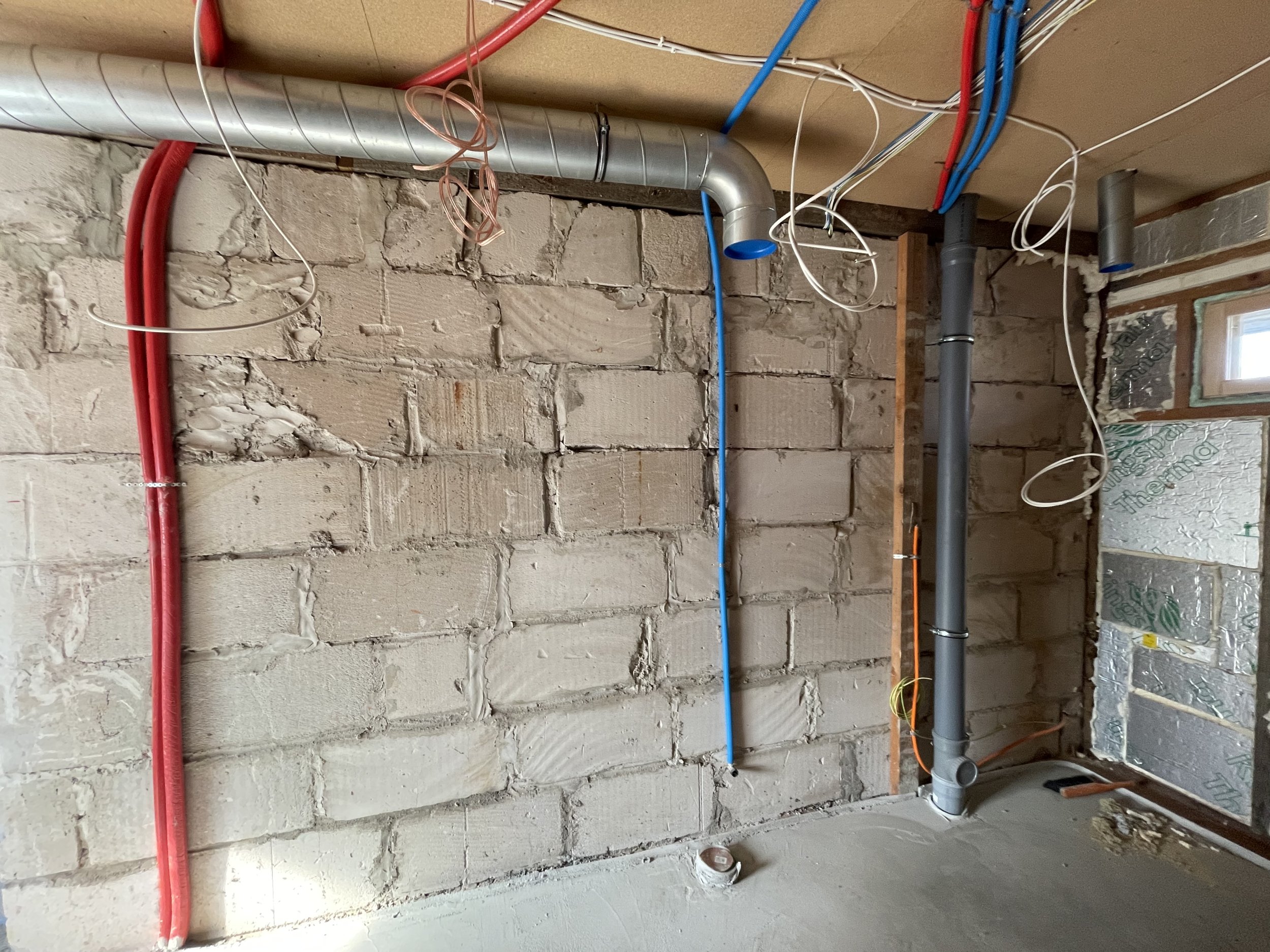 Olemasoletele seintele tuleb rajada karkass 42 mm horisontaalprofiilidest, 45x45 ja 70x45 puidust (kuusk) ning niiskuskindlast kipsplaadist (Kipsplaat niiskuskindel H2/GKBI 12,5x1200x2600mm). Karkassi vaja rajada kokku 5,7 jm. Puidust seina osale pole vaja uut karkassi ehitada.