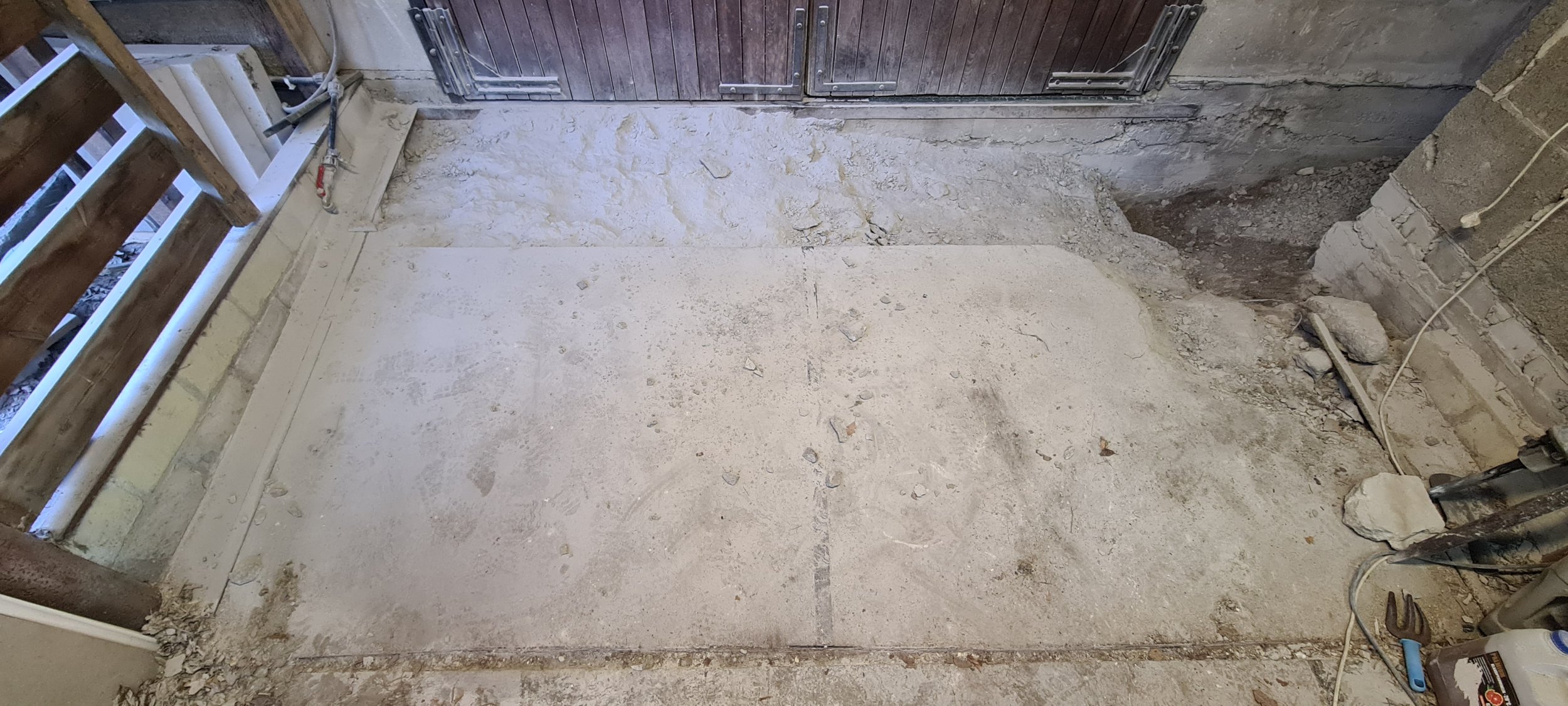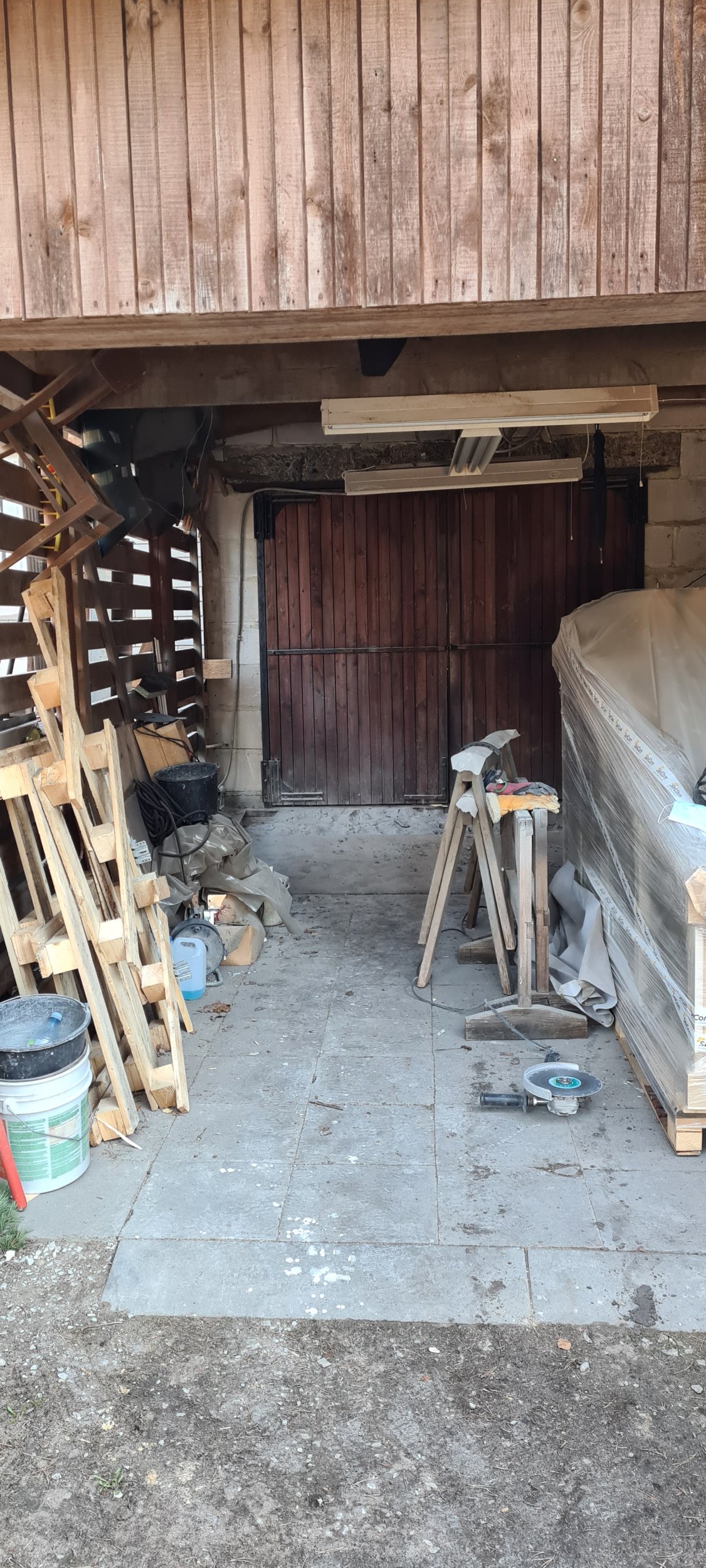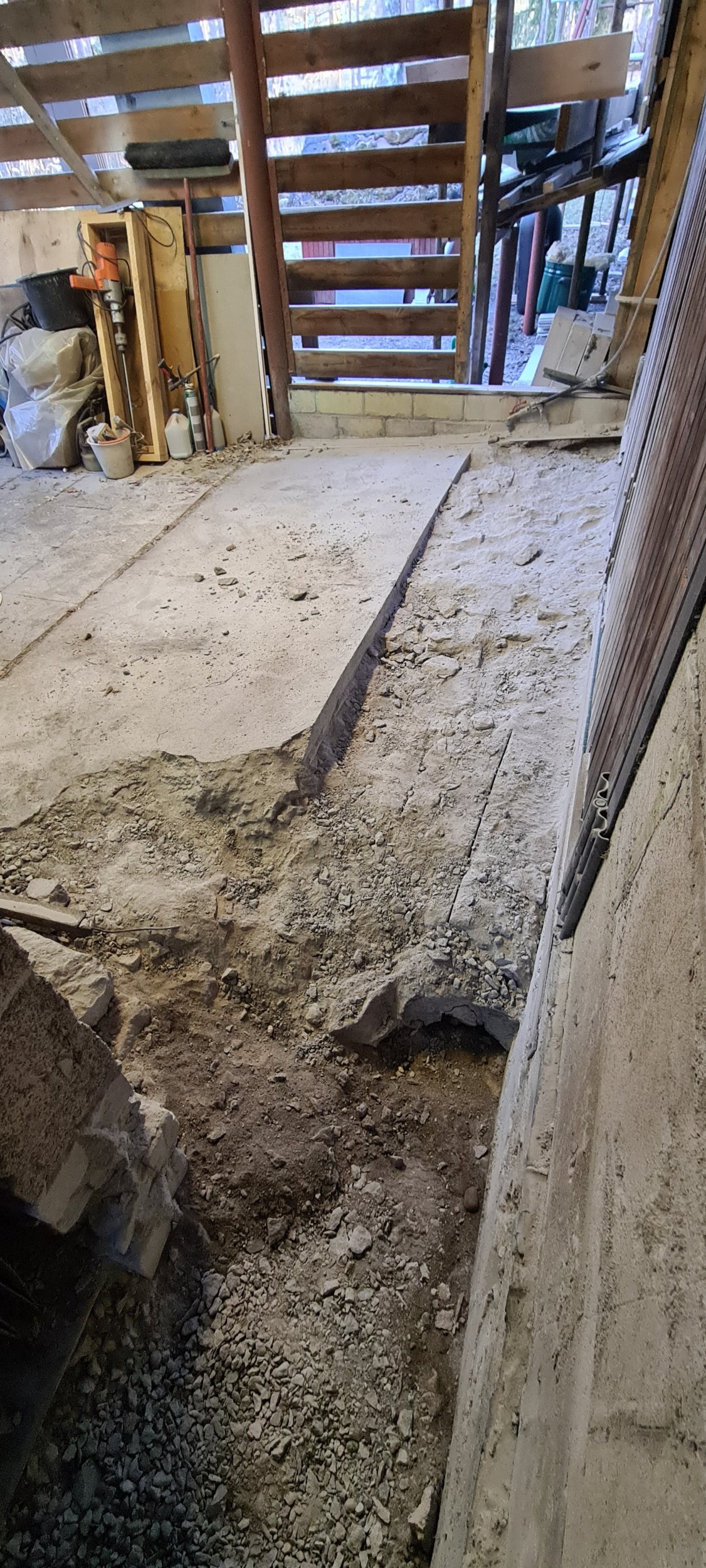 Garaaži esine panduse lammutamine. Täis ala 1,9x3,3m. Betoon, täidetud paekiviga, ilma sarruseta. Vundamendipoolsest küljest kõrgus ca 40 cm. Tehnikaga ligipääsuks ukseni vaba ruumi kõrgus 2,1m ja laius 2m.