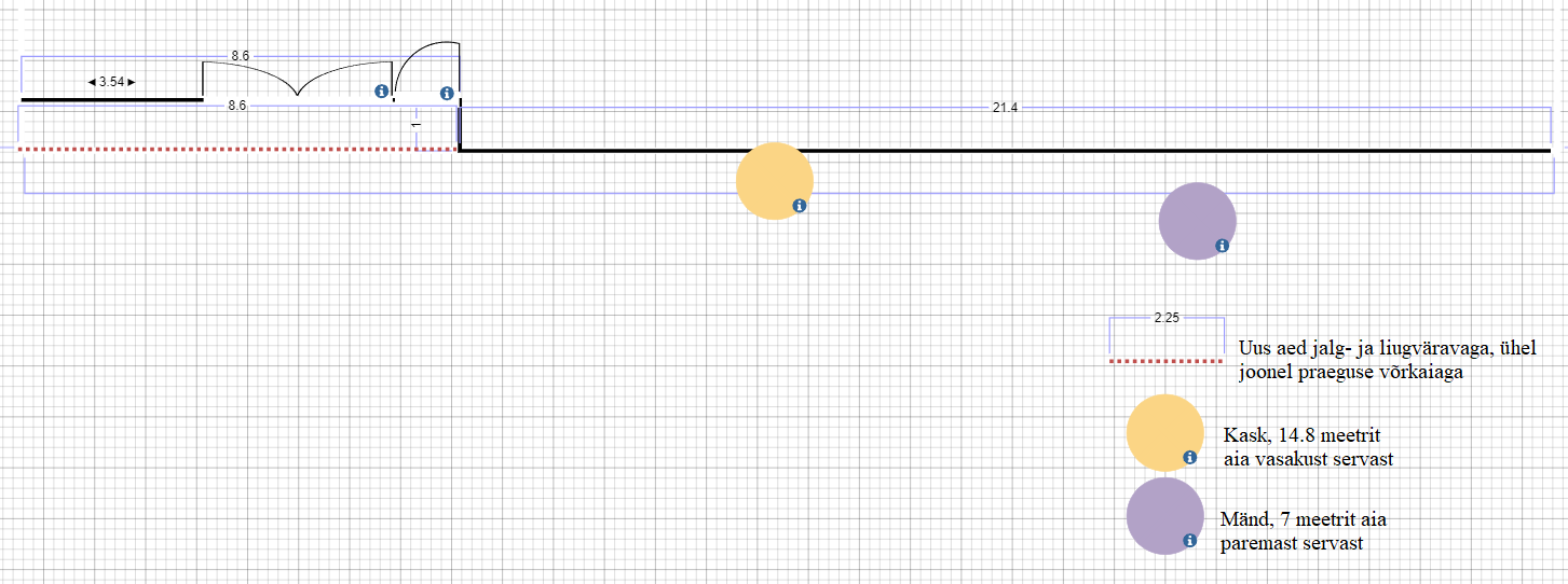 - Tõenäoliselt tuleb uuel aial jalg- ja liugvärava asukohad ära vahetada (jalgvärav vasakule ja liugvärav paremale). Jalg- ja liugvärava läbitavus/laius võiksid jääda samaväärseks praeguse lahendusega.