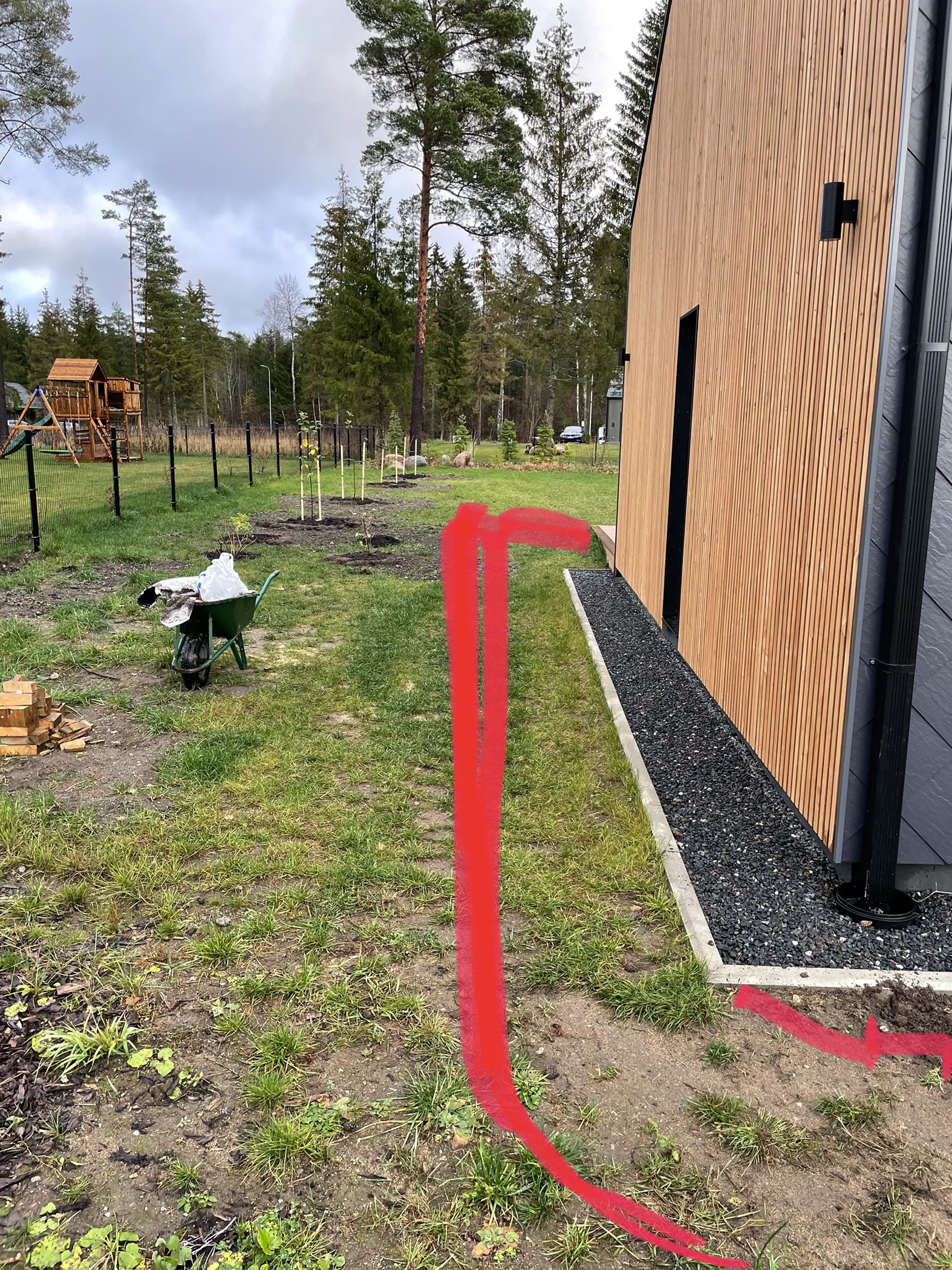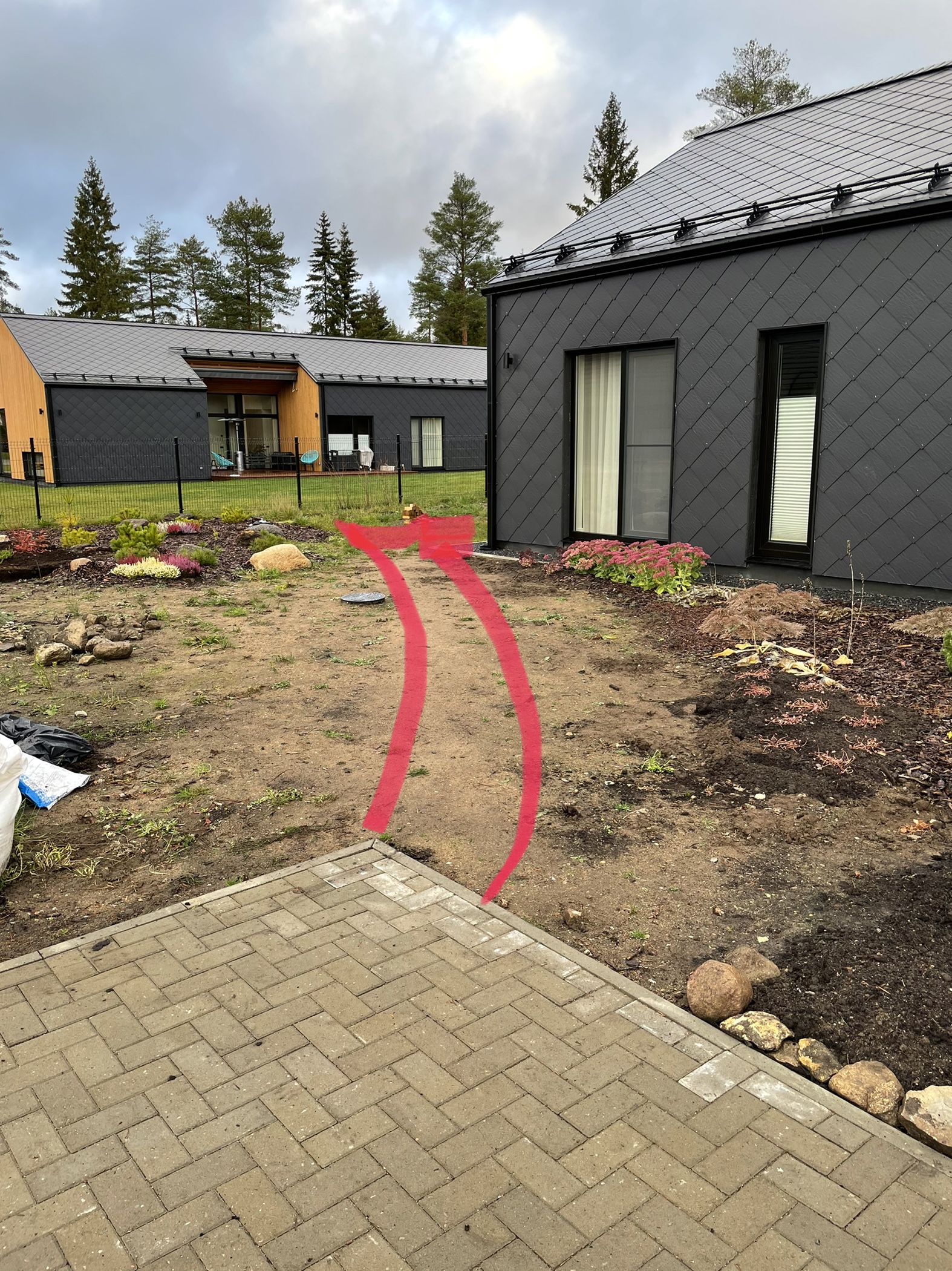 ~20m pikkuse, 1m laiuse killustikust jalgtee rajamine koos ääristega. Tee viib maja eest maja taha terrassini (looklev). 20-25cm suuremat paekillustikku ja peale ~5cm dekoratiivset musta killustikku.