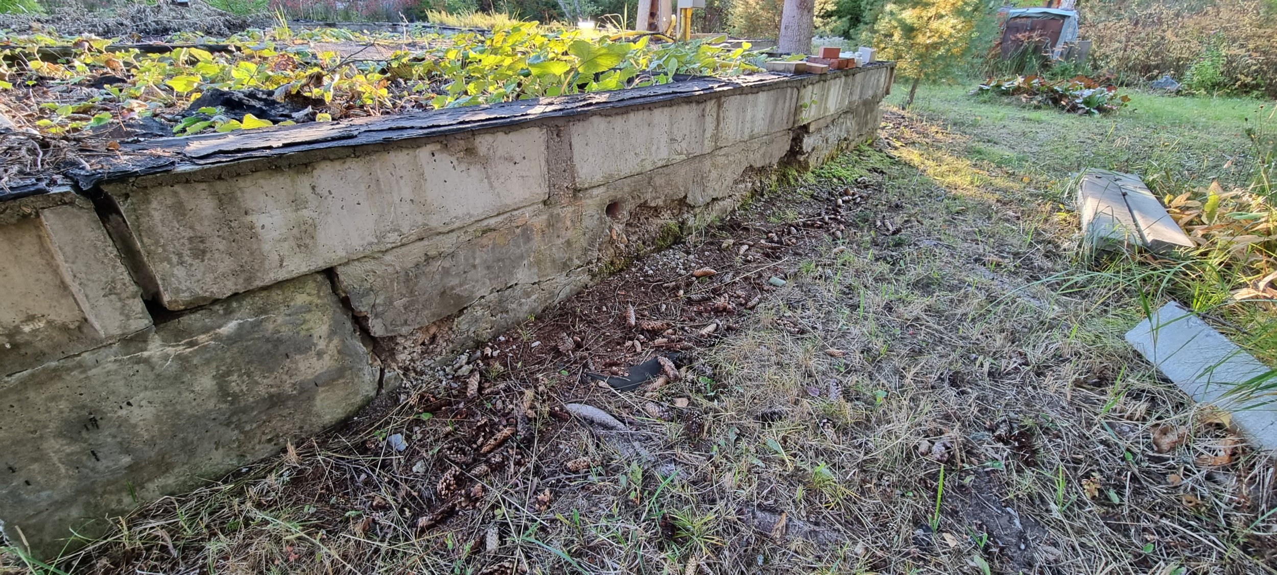 Need seinad mis lagunevad- plokkide alla oli kasutatud madalama kvaliteediga betoon, mis nüüd laguneb. Arvatavasti terve vundamendi alla oli kasutatud madalama kvaliteediga betoon (betoon oli segatud koos munakividega selleks, et oleks odavam), mis nüüd samuti arvatavasti laguneb. Vundament on sügav, keldriga.