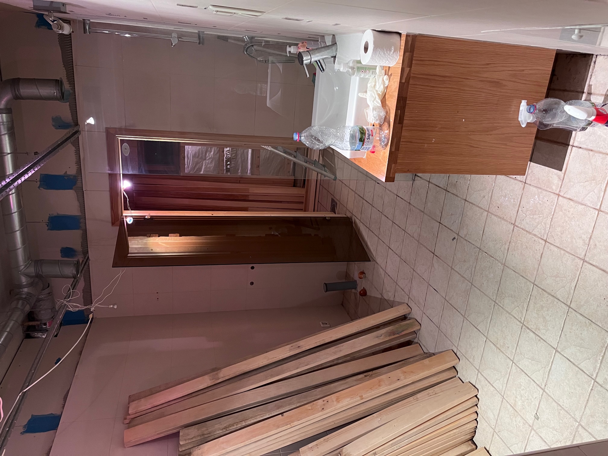 Vaja eemaldada 30 m3 põrnandaplaati ja puhastada pind segust. Lisaks vannitoa seintelt eemaldada 20 m2 seinaplaati koos kipskarkassiga. Jäätmed ladustada konteinerisse.