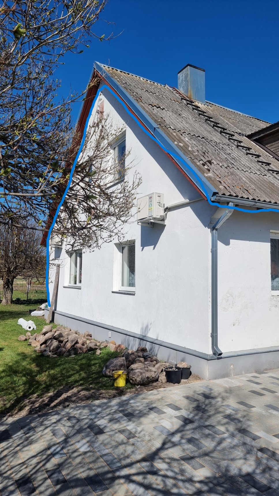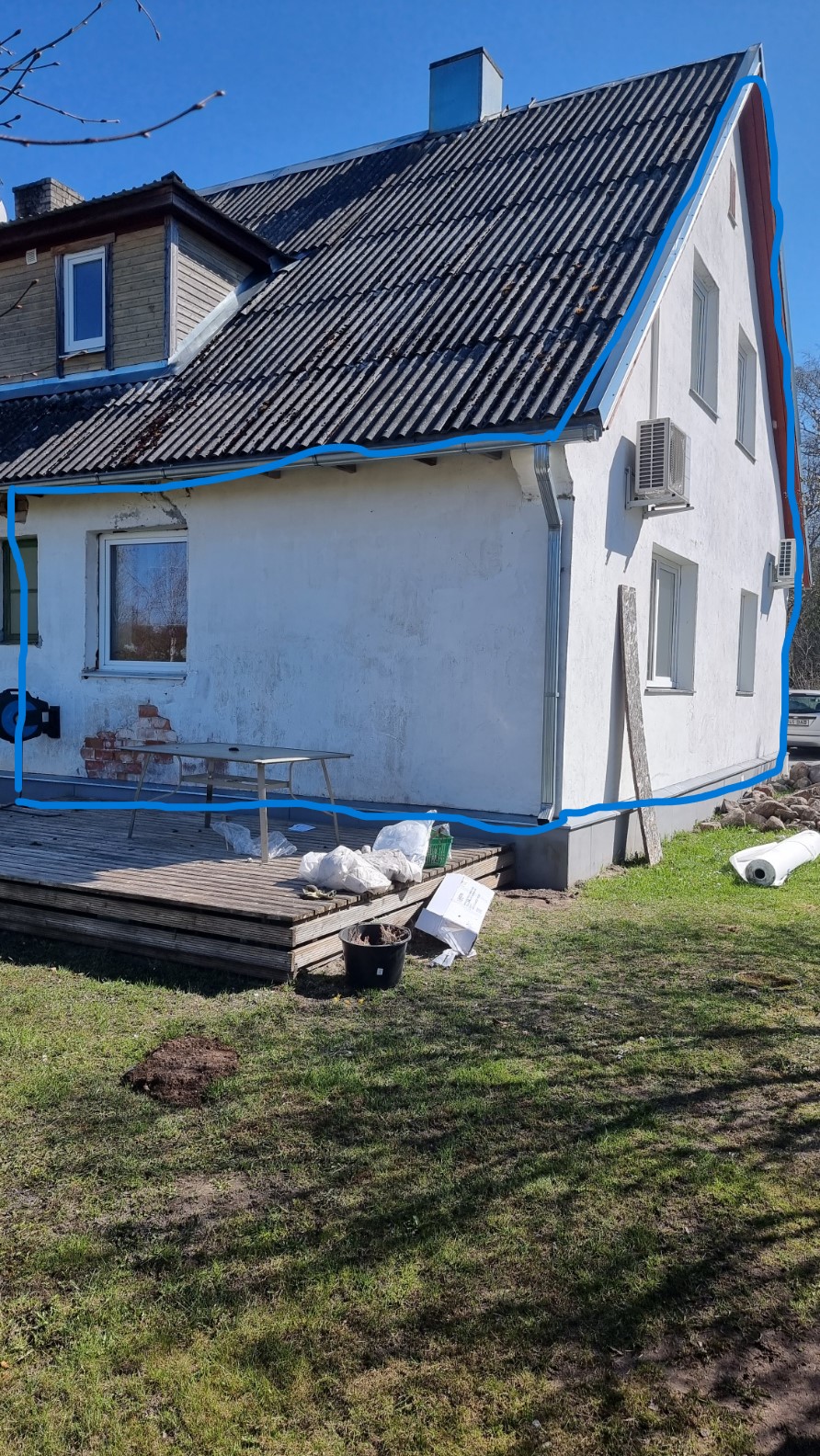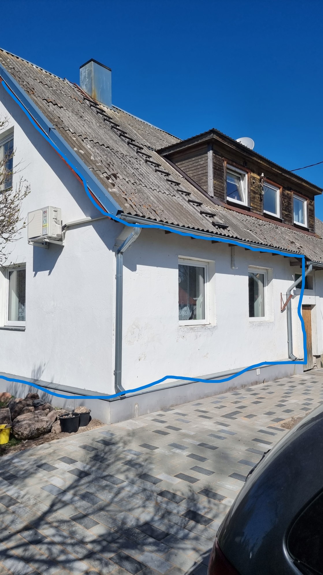 Oleks vaja soojustada välisfassaad. Hetkel pool maja (märgitud sinisega). Kokku 140m2 koos akendega. Samuti vahetada 7 akent.