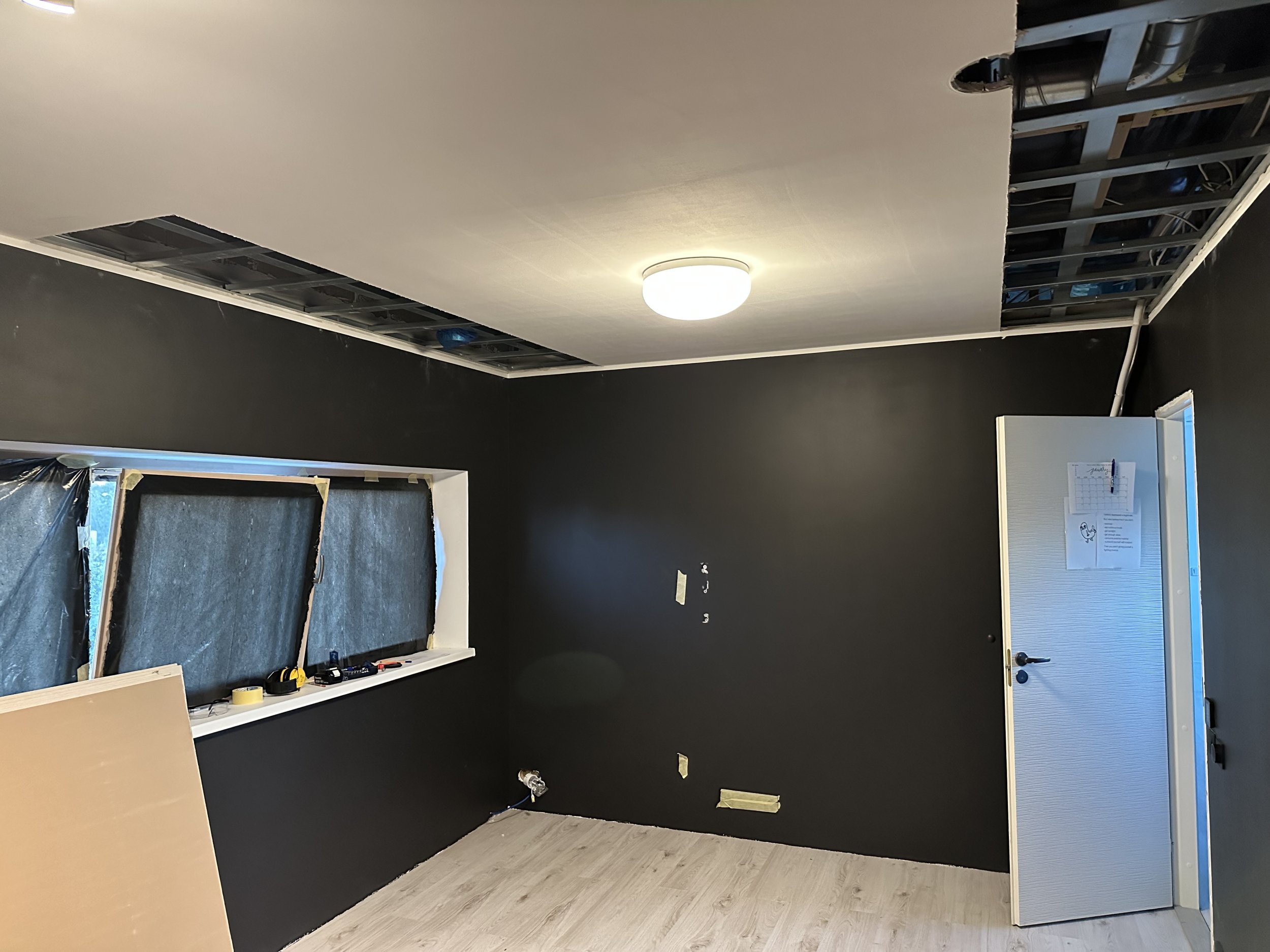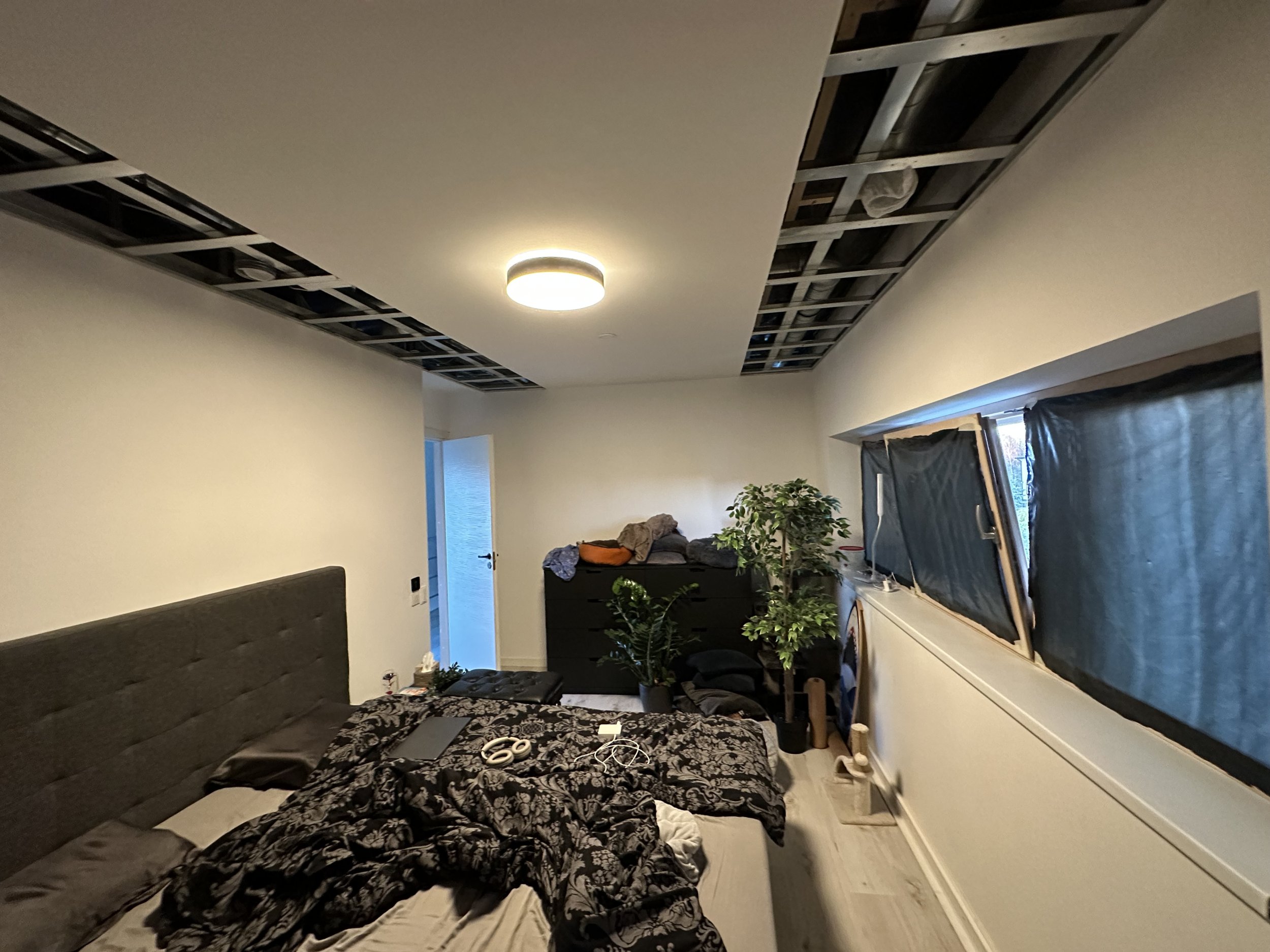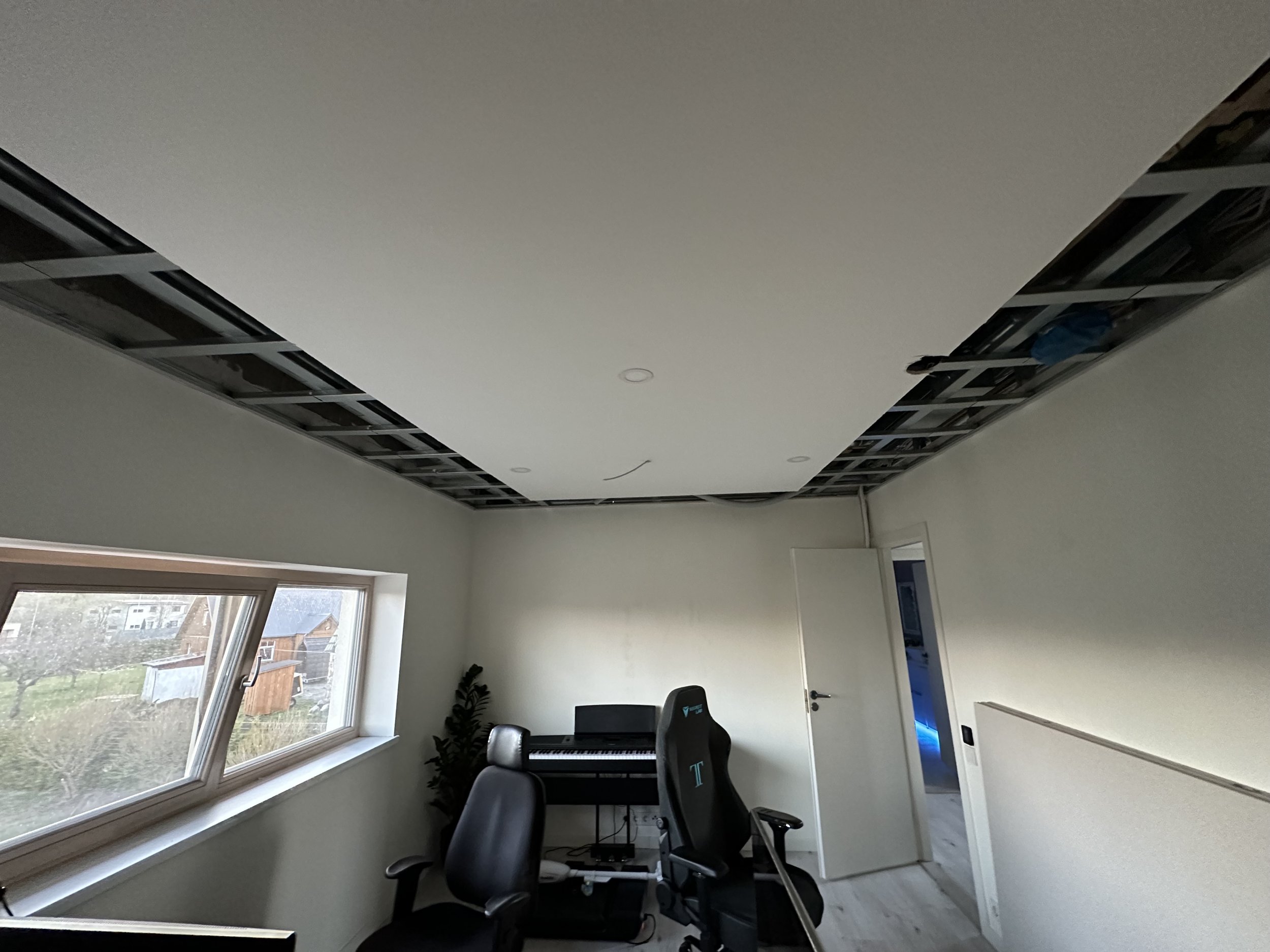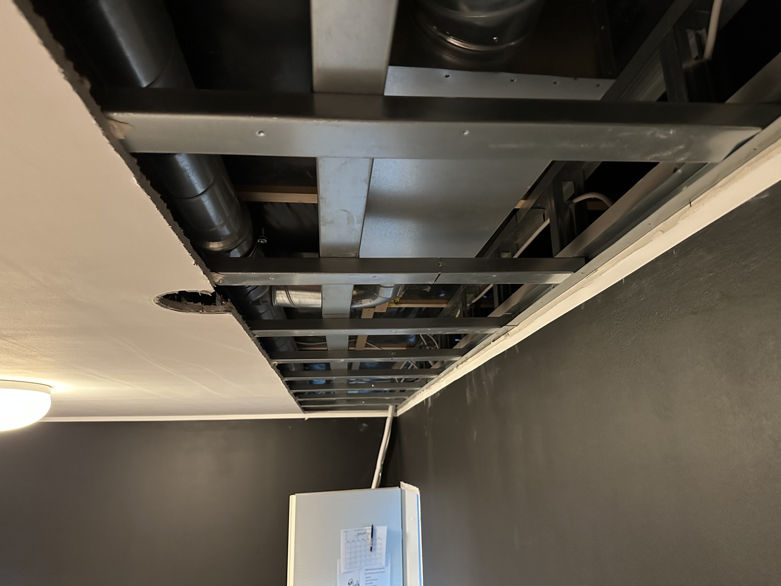 Ripplaed on osati lahti lõigatud, et vahetada ventilatsiooni. Tööks oleks lagi kinni panna ning sinna peale panna teine kiht kipsi heliisolatsiooni jaoks.