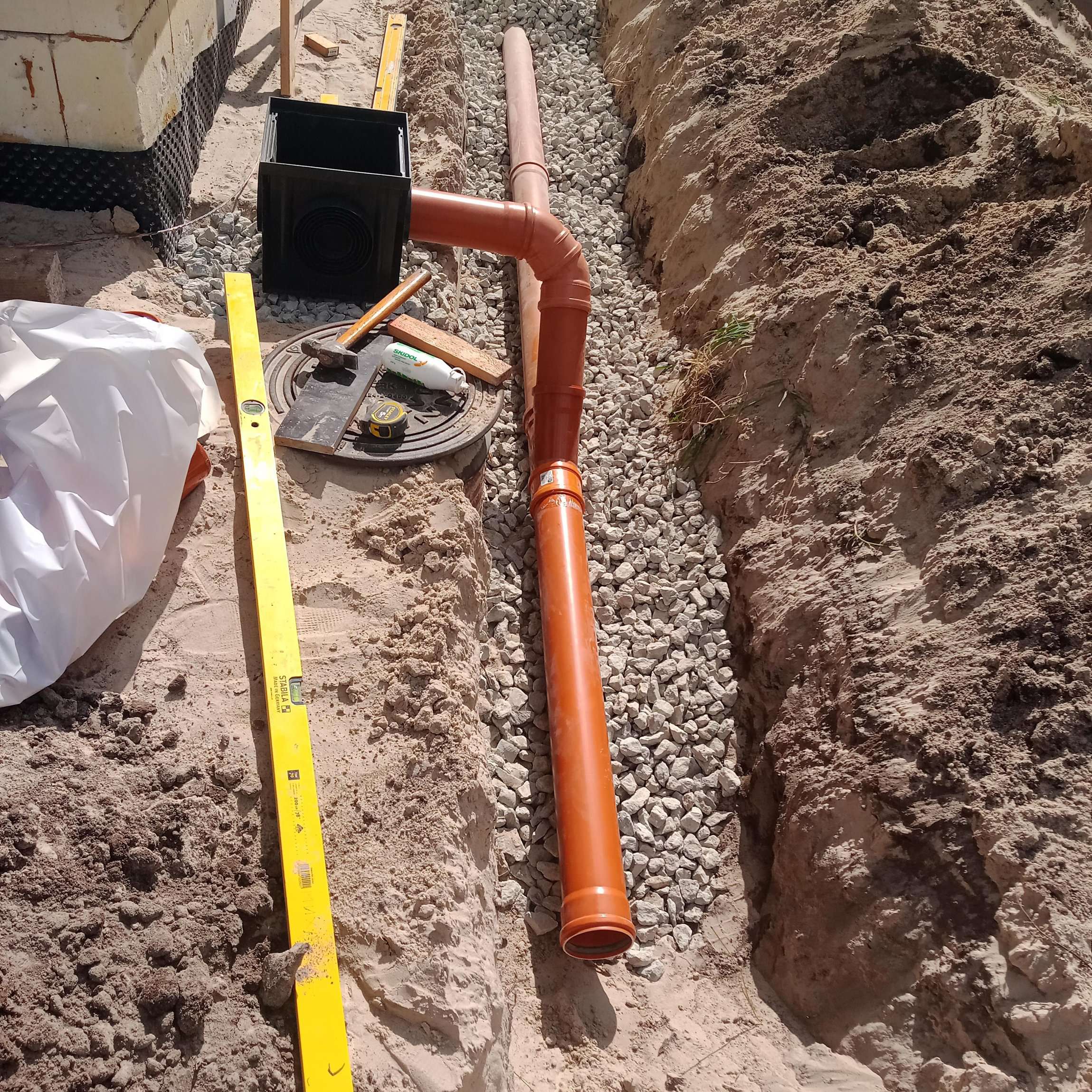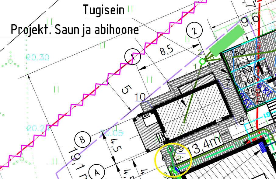 2. Paigalda drenaazikaev 400/315, kus plaanis sauna nurk ja paigalda toru. Vaata “Pilt saun” kollane ringis. Toru pikkus umbes 3,5m. Toru tuleb alates drenaazikaev D 1 -Pilt “mis praegu tehtud”.