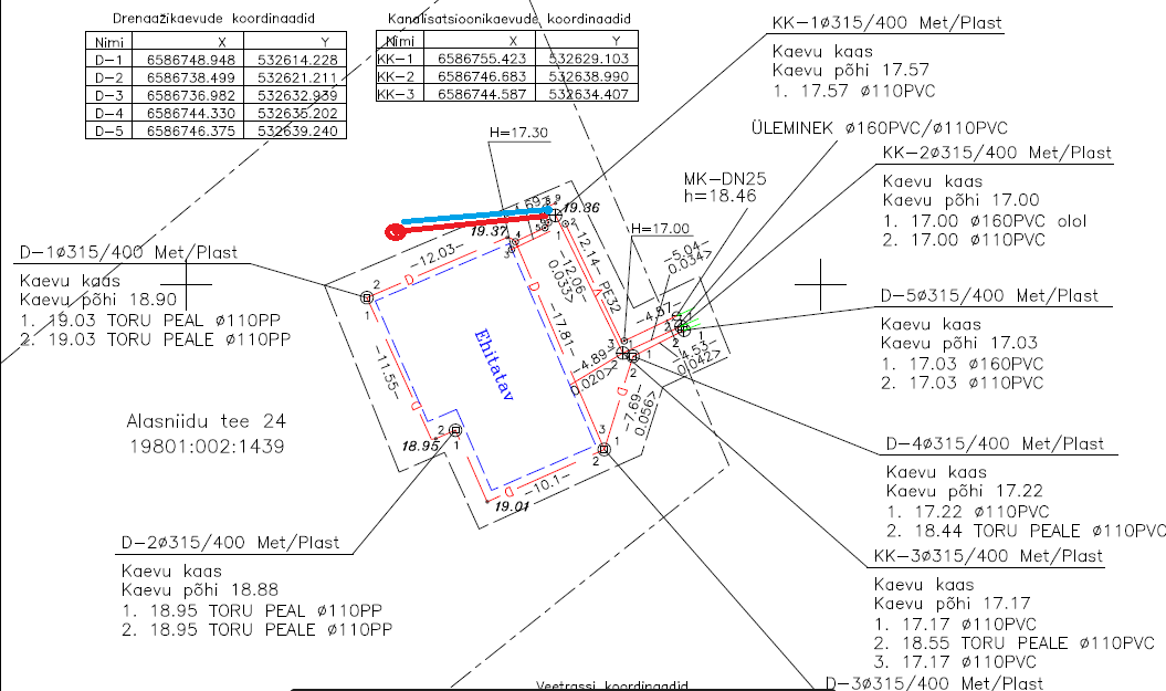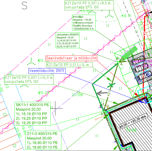 kaev 400/315, vaata pilt “asendus Plaan” SK11-1, pikendada kuni see kaev toru teine maja nurga poole. Veel K21 (aga ei ole otse kuni Jaotuskaev, on vaja nurga, sest sauna hoone plaanis ja kus on nurga veel üks kaev), Jaotuskaev ja immutuskastid (on vaja vee koguja)
