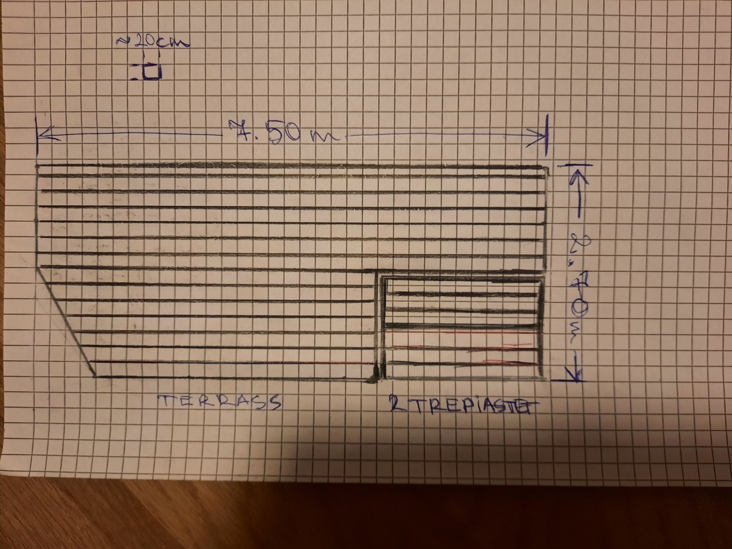 Pildid praegusest terrassist ja käsitsi joonistatud terrassist manuses. Terrassi lauad paigaldaks ühte pidi nagu joonisel, mitte nagu vana terrassi pildil. Terrassi suurus koos eraldi asetsevate astmetega on 7m50cm x 2m90cm. Puitkomposiit lauad võiksid olla tumehallid või tumepruunid. Piirdeid ei ole vaja.