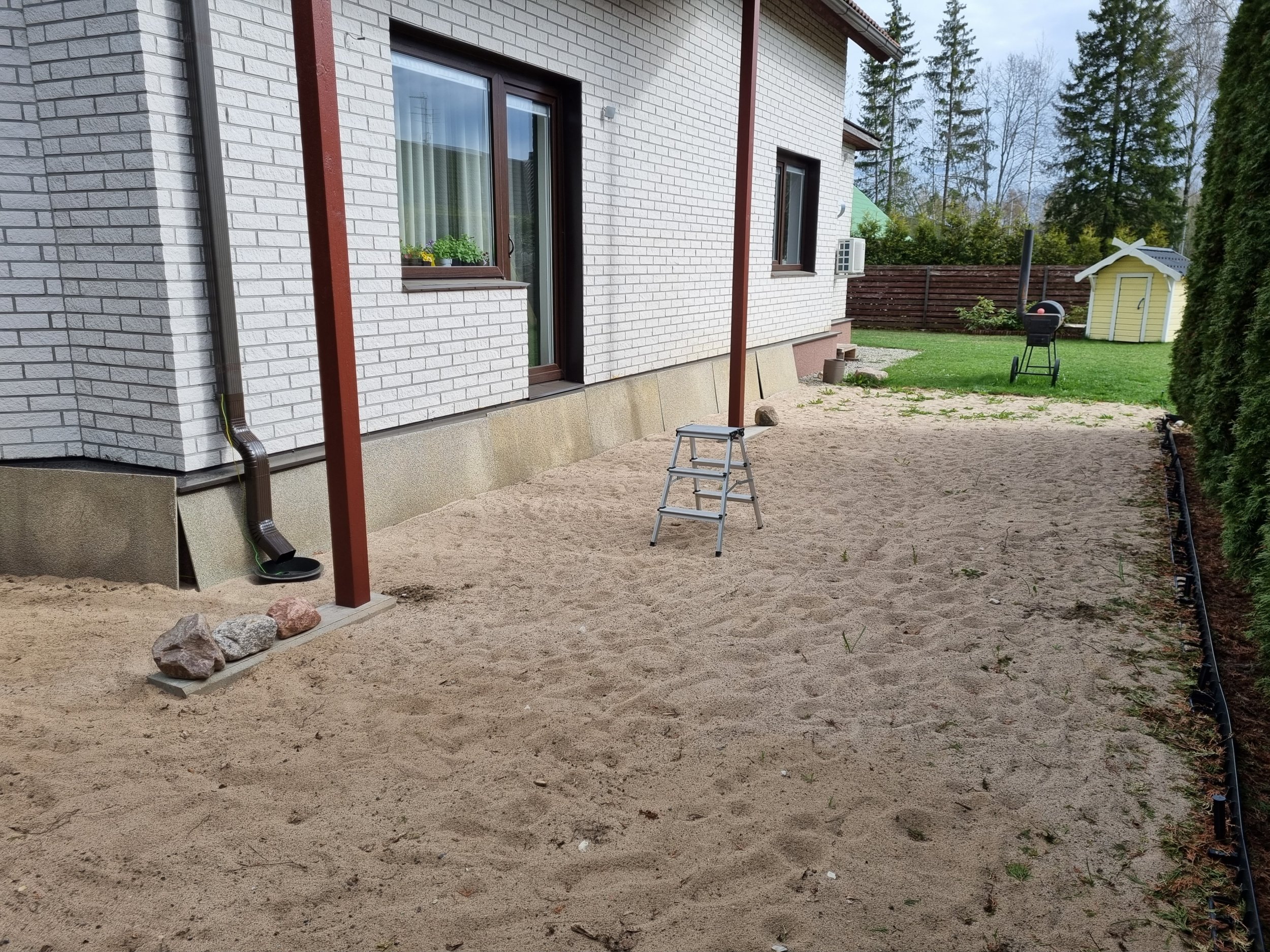 Kiviplaadid on tellitud, ja saabuvad mai kolmandal nädalal. Muud ehitusmaterjalid (killustik vms) töö tegija poolt. Maja ees on olemas 2 tonni peenliiva, niiet liiva eraldi objektile tuua pole vaja.