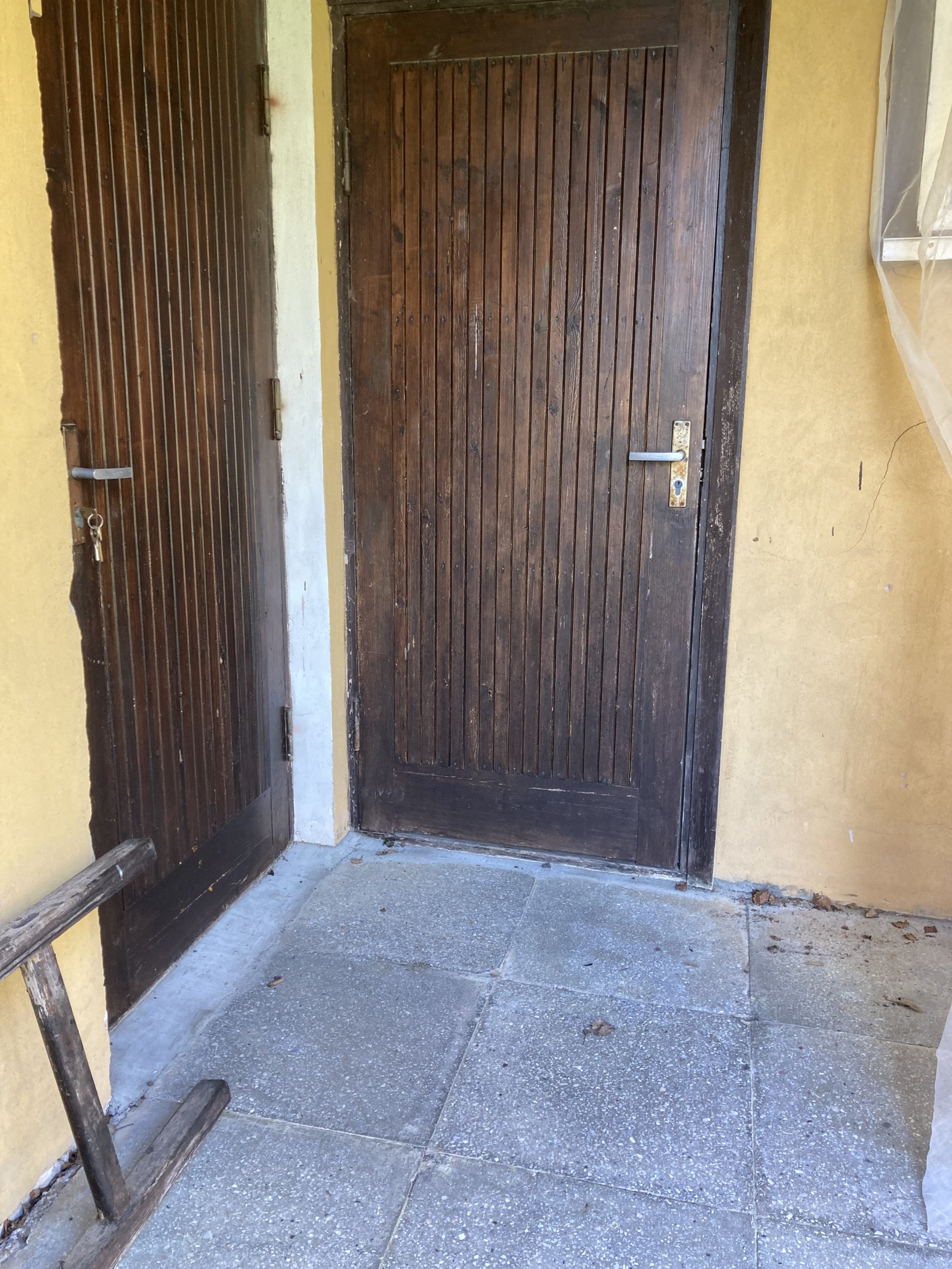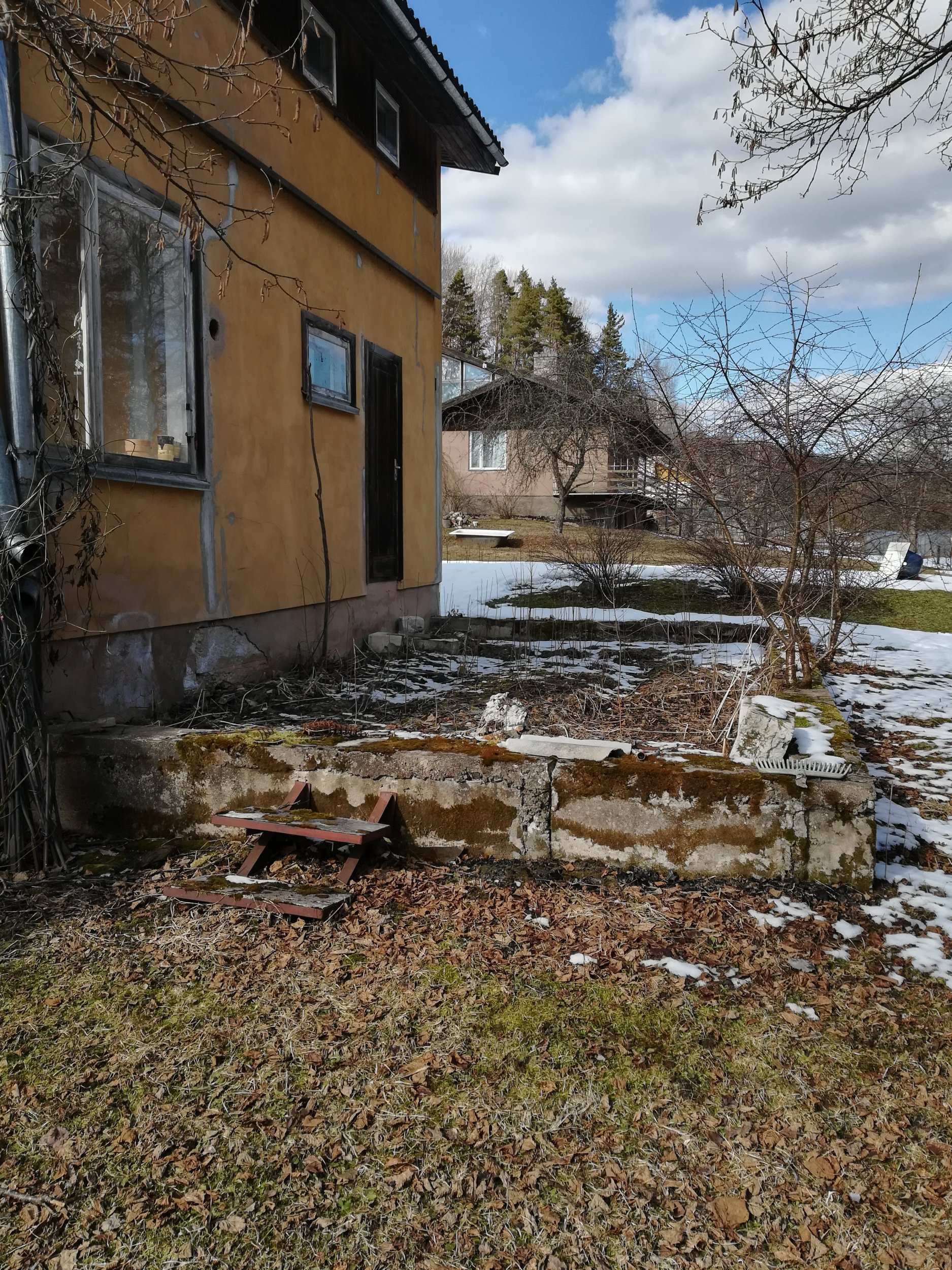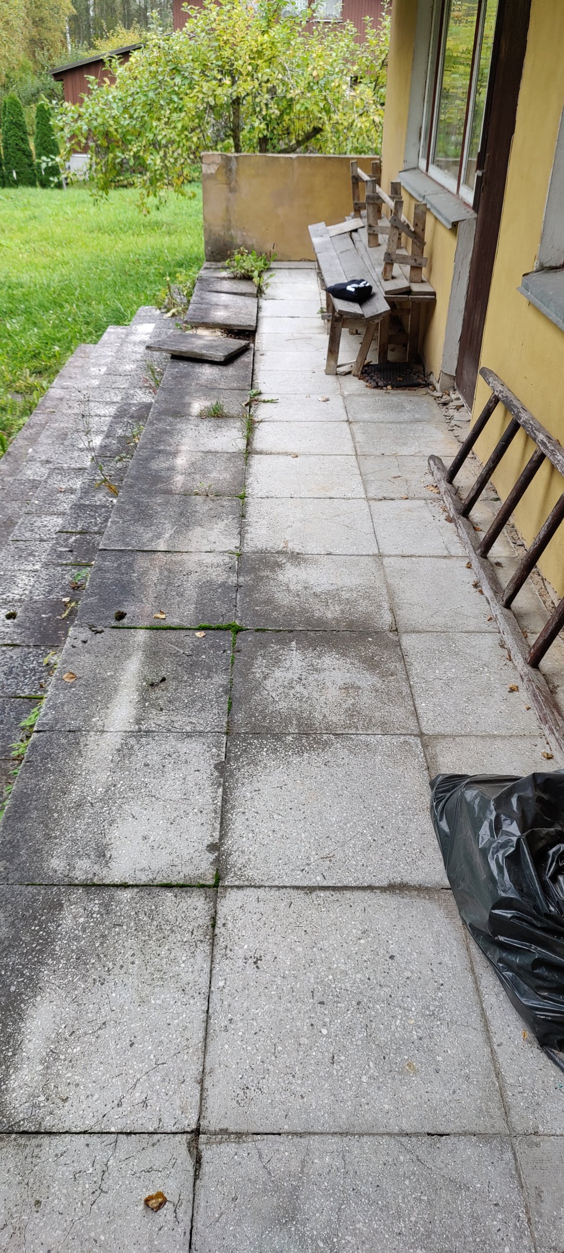 Treppi tuleks lammutada nii palju, et saaks terrassi peale ehitada ning tekkinud jäätmed utiliseerida. Kuna hetkel on uste alumise ääre ja plaatide vahe 2cm, siis kindlasti tuleb mingi osa pealt maha lammutada ning ka tellisest piirdeid pole enam vaja. Ma kahjuks ei oska öelda, mis täpsemalt trepi plaatide all on, aga näha on nii betoonplaate, telliseid, liiva ja betooni. Samuti vaja teha allesjäänud trepp veekindlaks, et see edasi ei laguneks.