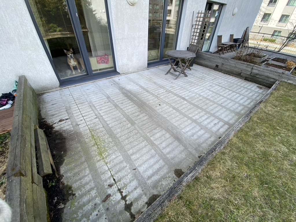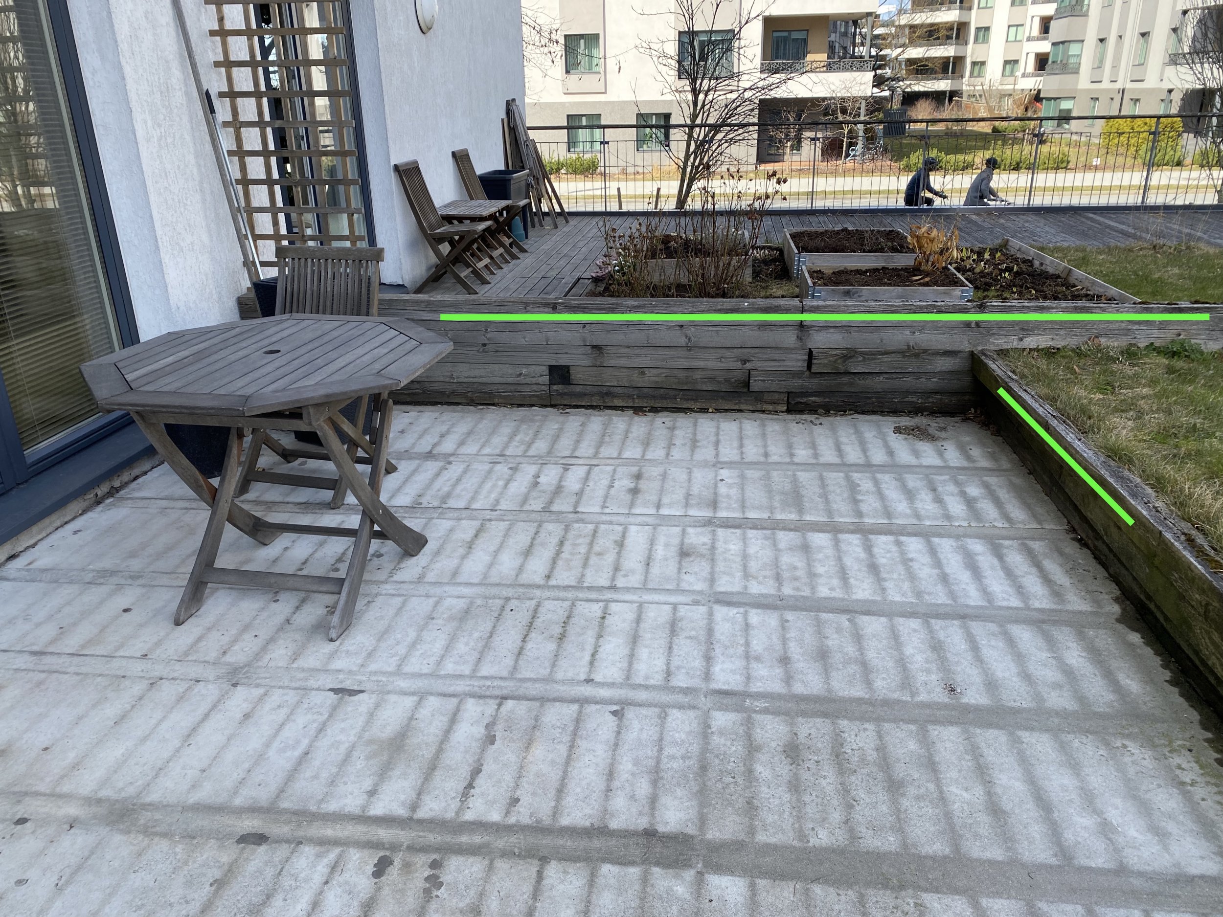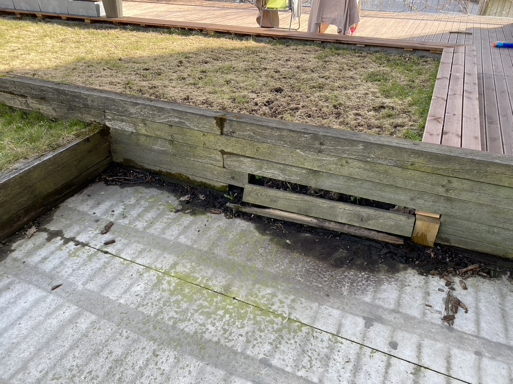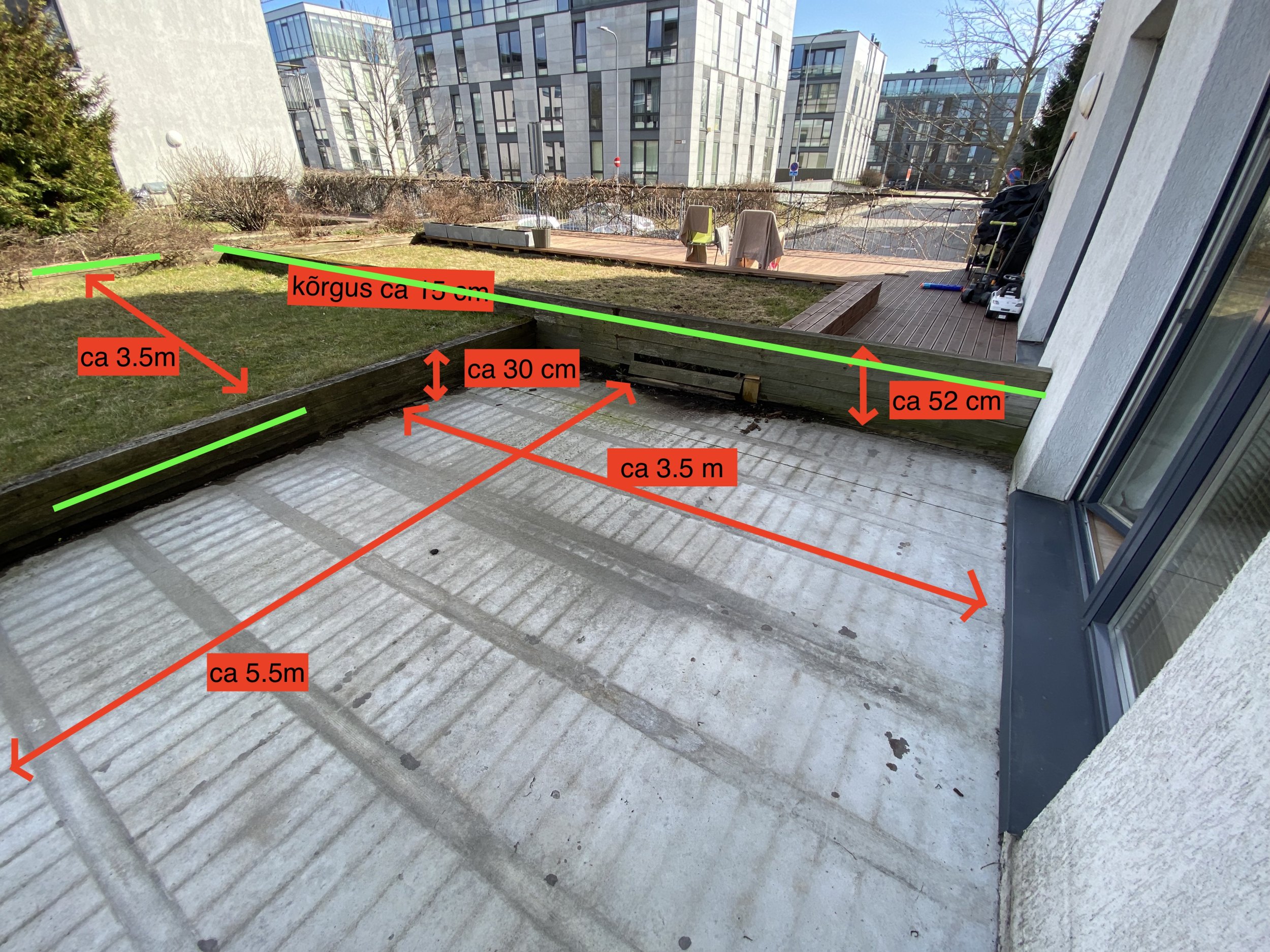 Terrassilaudise paigaldus 3.5x5.5m terrassile. Materjaliks eelistaksin termomändi (olen avatud soovitustele/muudele materjalidele). Lisaks tuleks vahetada ka terrassi piiravad lauad (kõik vahetusele minevad piirded on piltidel toodud välja rohelisega), sest vanad on läbi mädanenud.