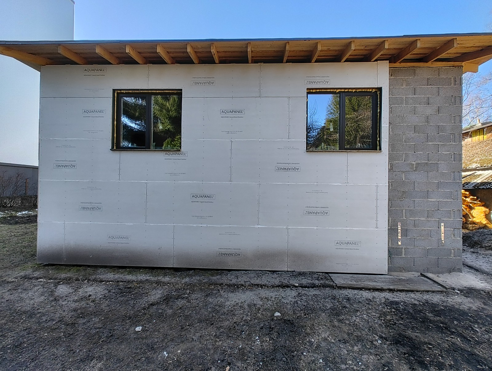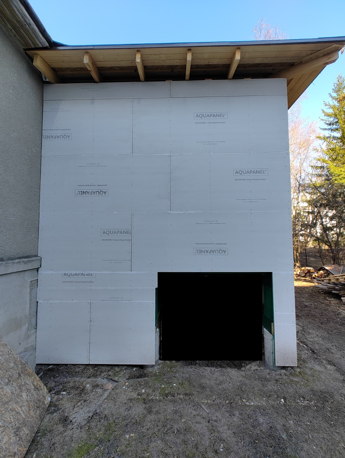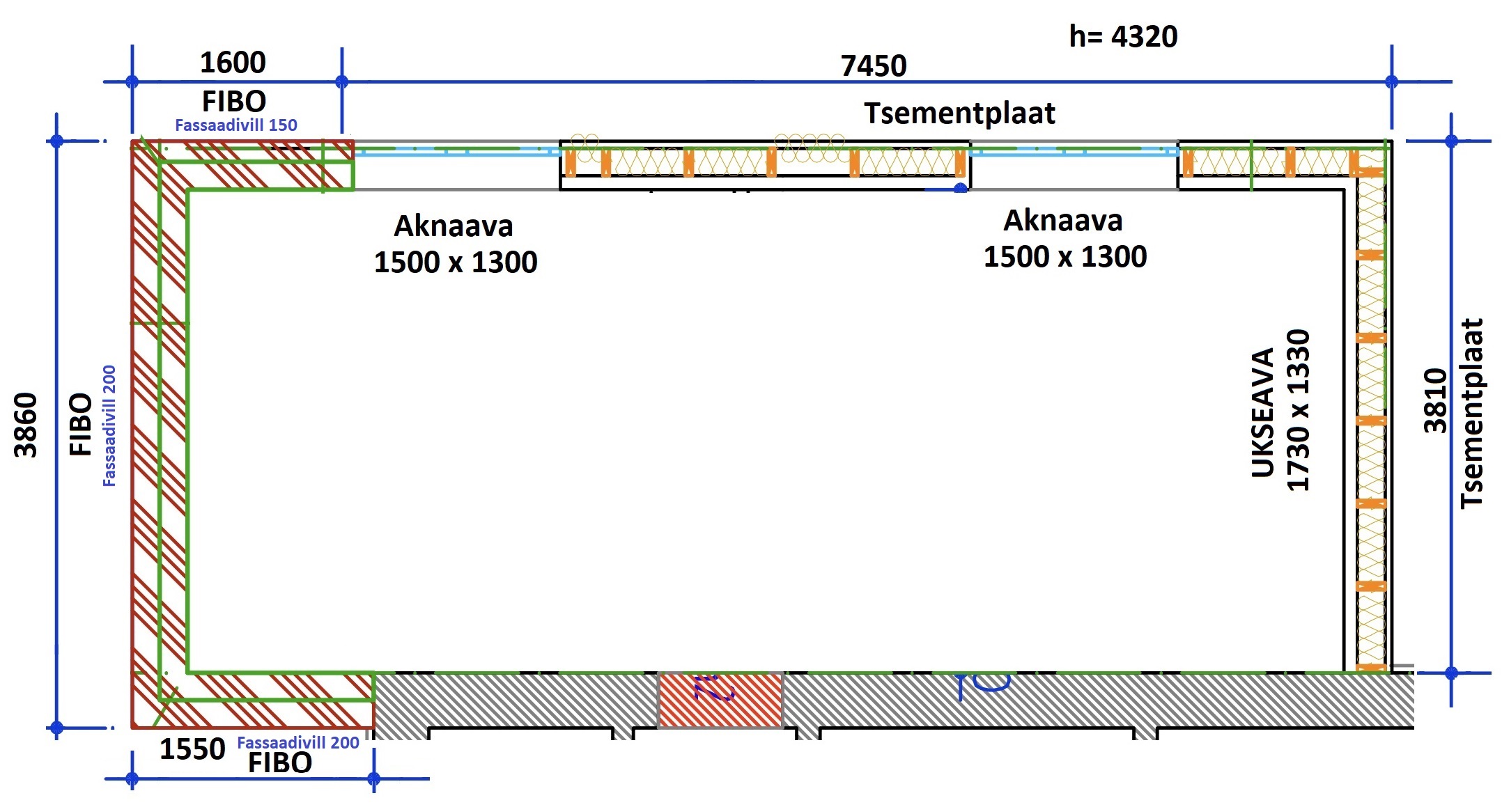 Osa seinast vaja õhekrohvida tsement plaadile (ilma ssoojustuseta) ca 46m2 , teine osa - paigaldada FIBO plokile Fassaadivill 150 paksusega ca 8m2 ja Fassaadivill 200 paksusega 25m2 (joonisel vastavalt tähistatud, kuna tuletõkke sein) ja siis õhekrohviga katta.