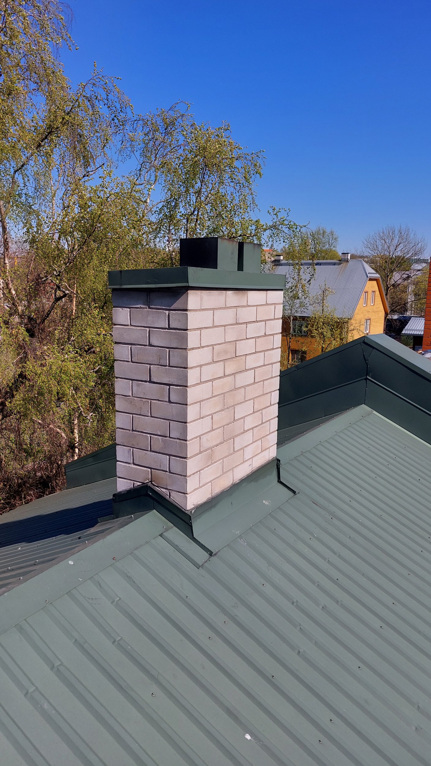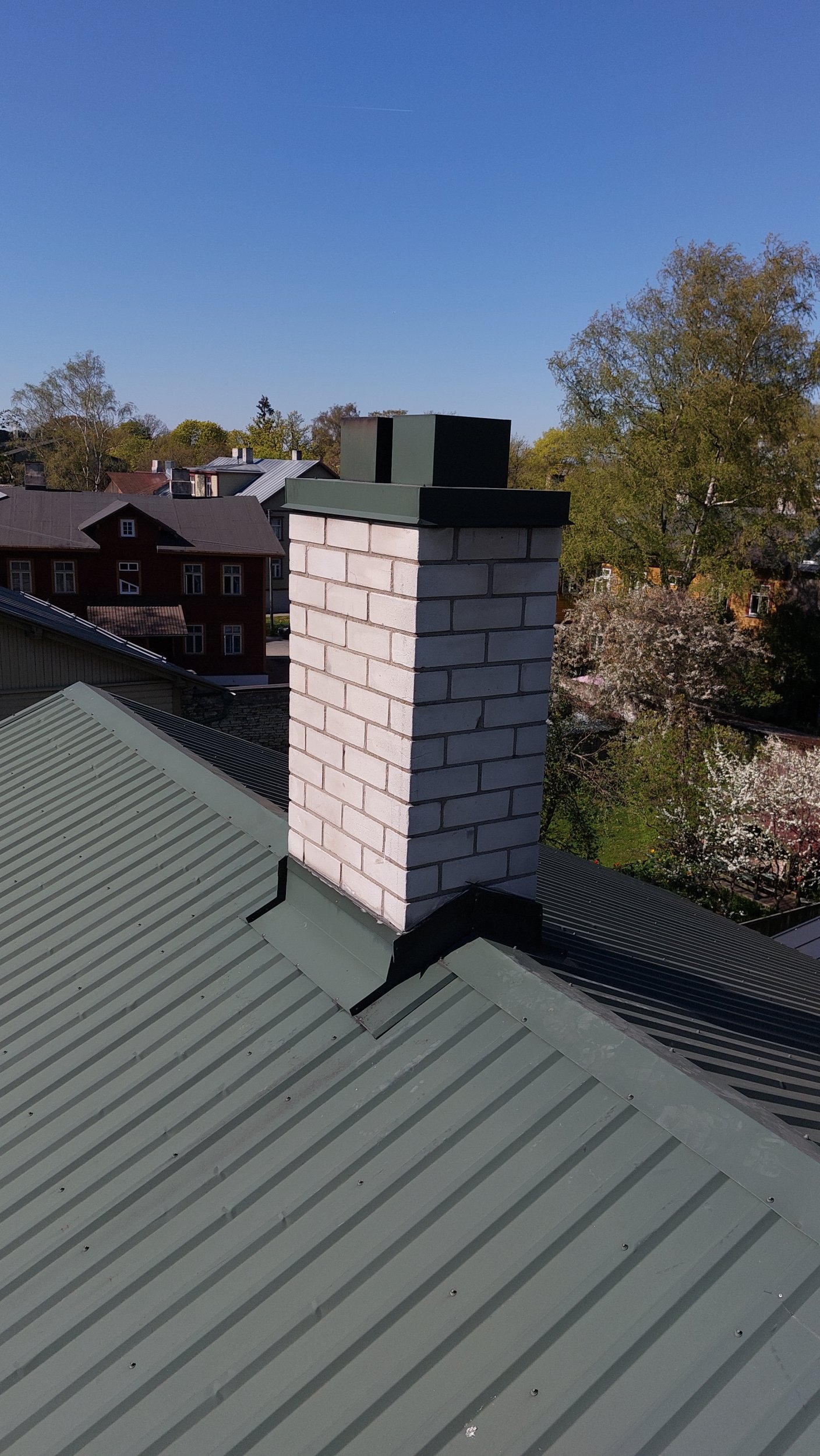 Mõlema korstna mütsid teha uued, korstna ja katuse vaheline ühenduskrae taaskasutada. Mõlema korstnapitsi najale hankida, paigaldada ja kinnitada katusele toetav kald-redel selliselt et redel ei kahjustaks katuseplekki.