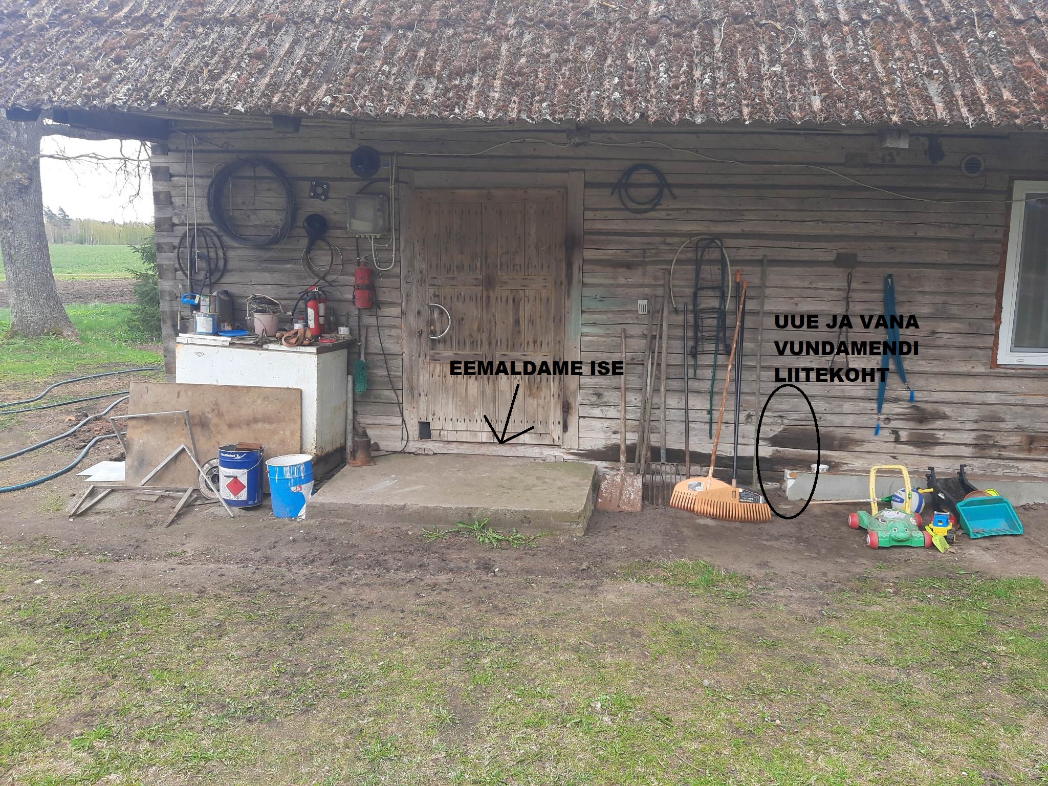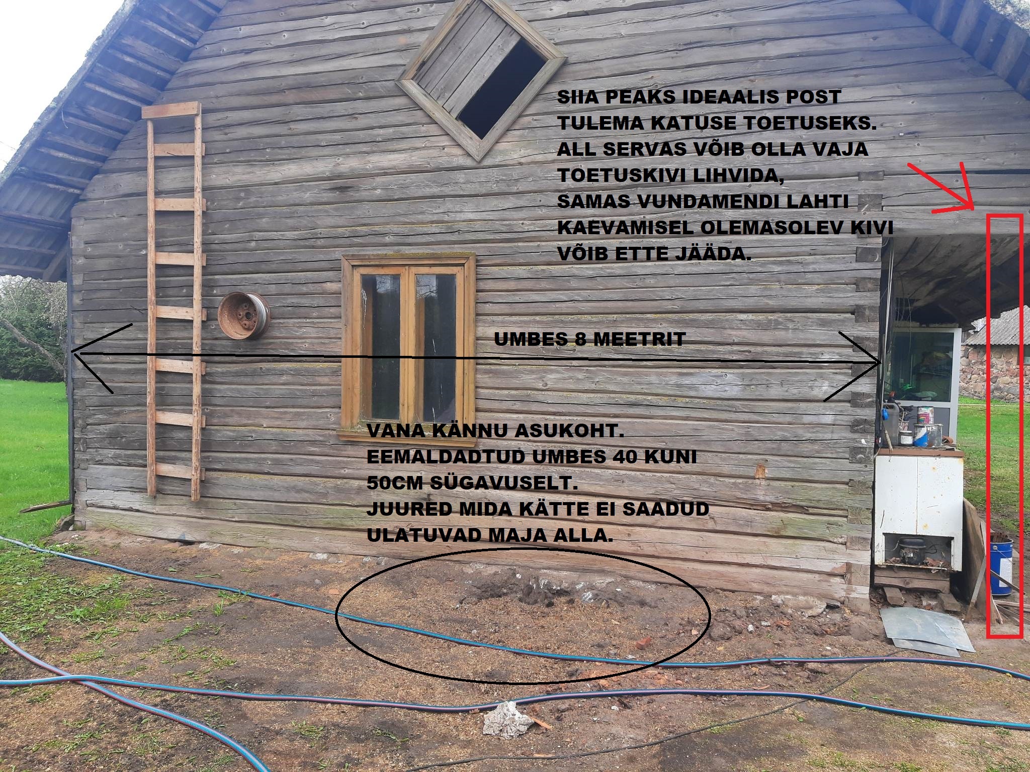 Vajalikud tööd - Seest vana põranda lammutus pluss väljavedu. Muldpõranda eemaldus ja väljavedu (majaosa kuhu vundamenti vaja, ei ole elamisruum). Maja toestus. Vundamenditööd, saalung, valamine jne. Palke alt eemaldada pole vaja, täitsa kobedad. Vundamendi soojustamine.