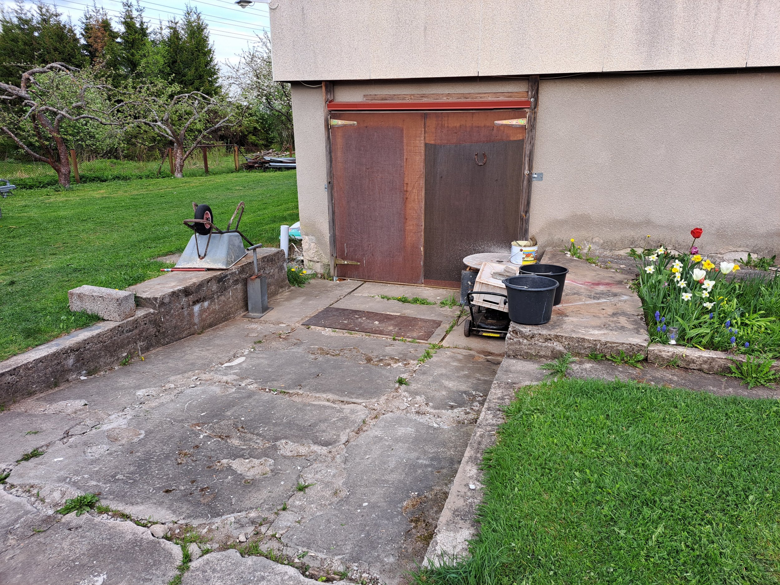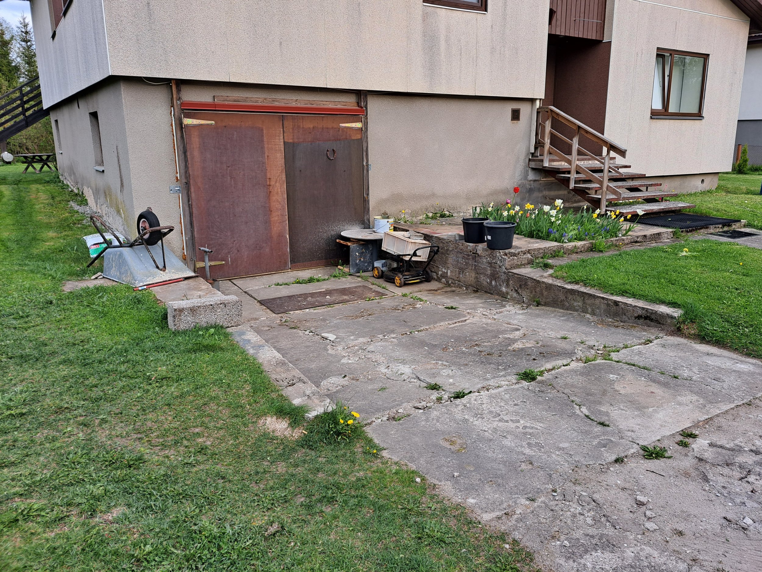 Vanade betoon- ja tsementplaatide eemaldamine ja utiliseerimine. Garaaziesise tee plaadid on ca. 10-15 cm paksused, kunagi ise valatud ja osaliselt lagunenud. Kopa või bobcatiga saab kätte.