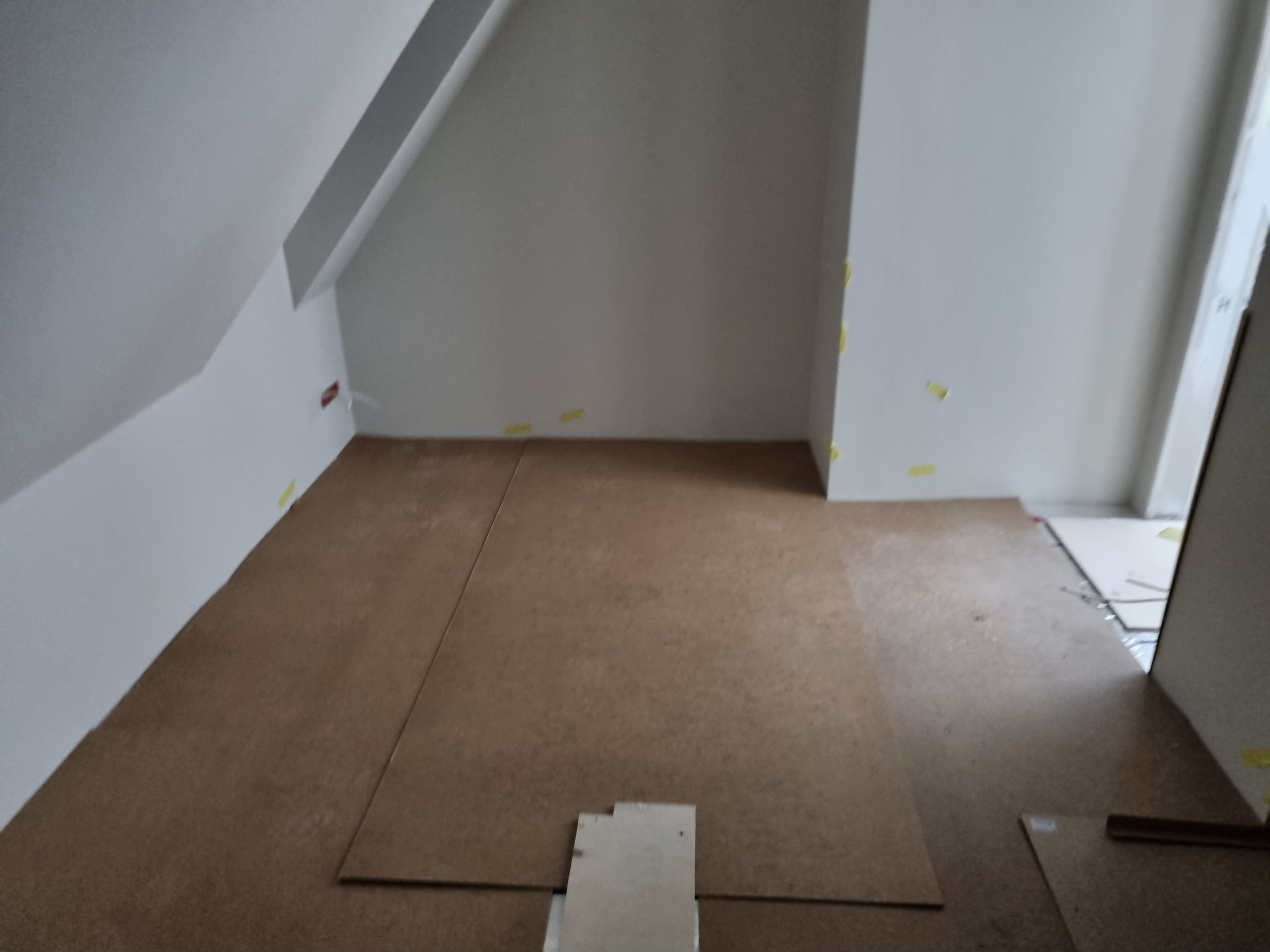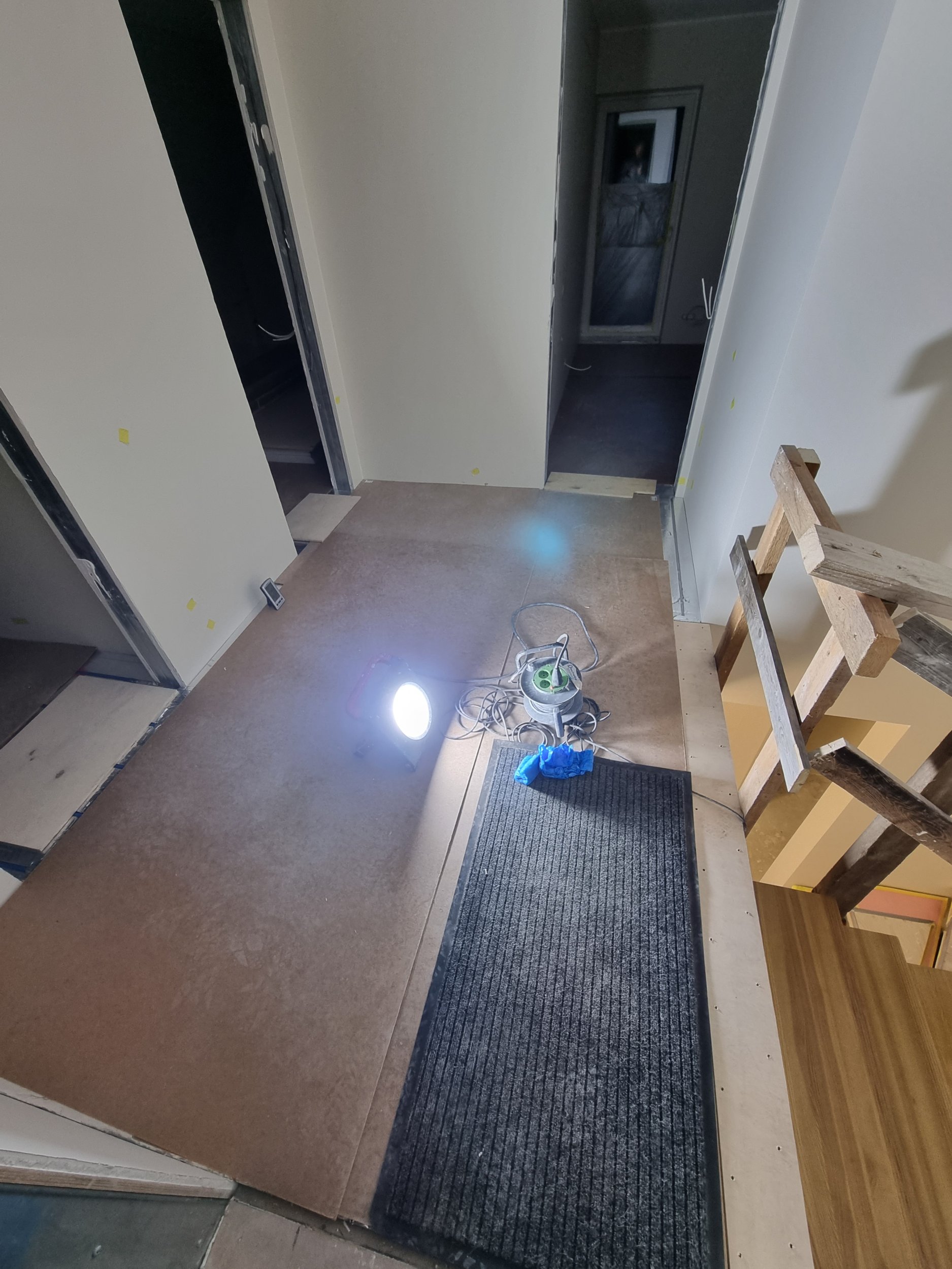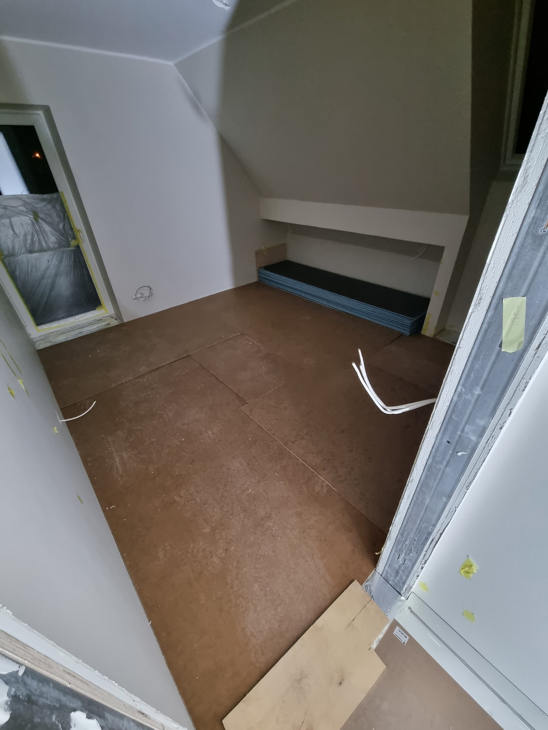 Parkett paigaldatakse kolme magamistuppa ja teise korruse esikusse. Vannituba ei ole töömahu sees. Magamistubades on ka kaldlagede alused niššid (piltidelt nähtavad). Tööde tegemise ajaks on ruumid puhastatud, kõik põrandad kaetud Novasound membraaniga, parkett ja liimitünnid teisele korrusele veetud.