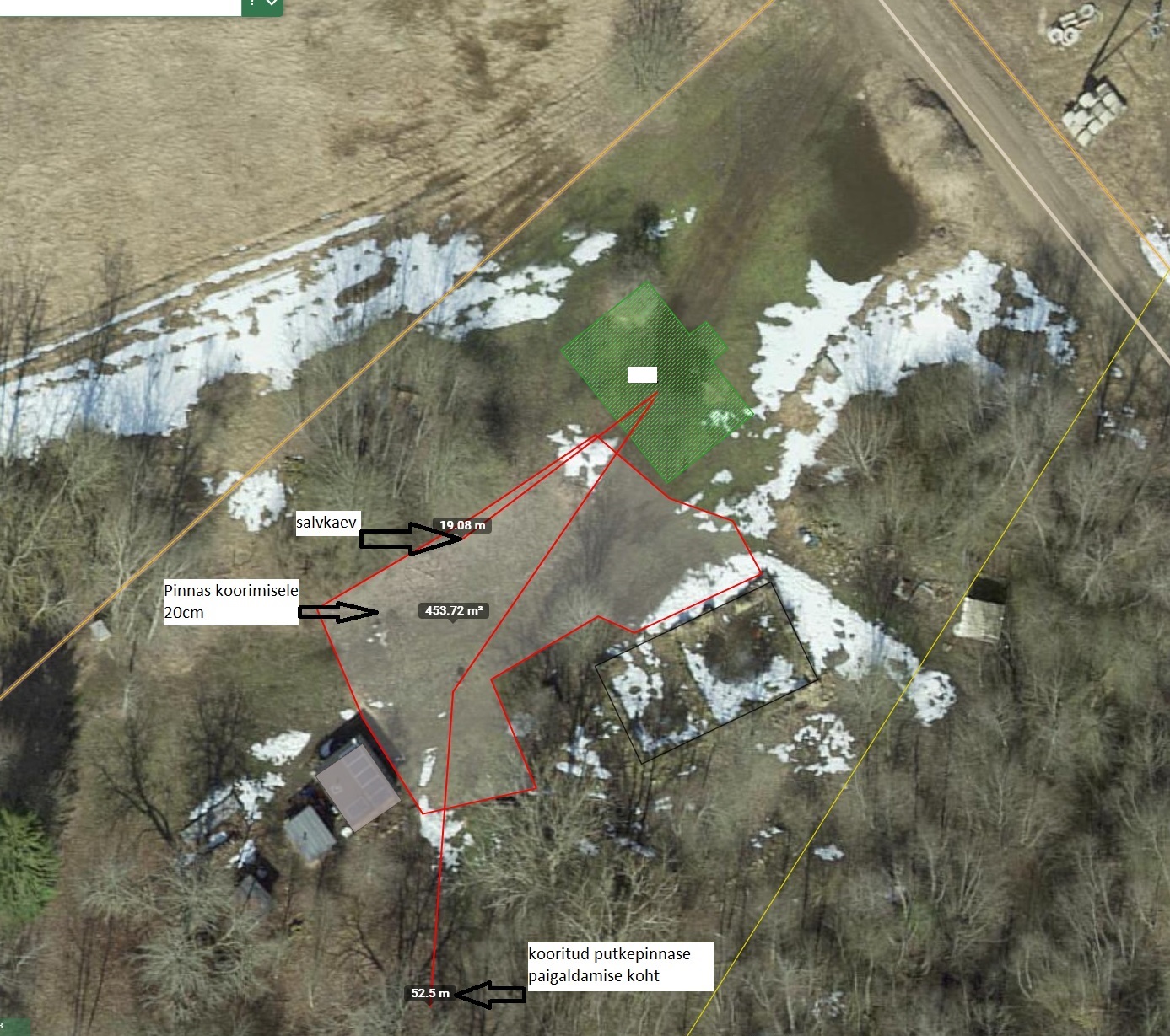 pildil "Pinnas koorimisele 20cm" ca 450m2 ala tuleks ära koorida 20cm kõrguselt ja teiseldada pildil "kooritud putkepinnase paigaldamise kohta"