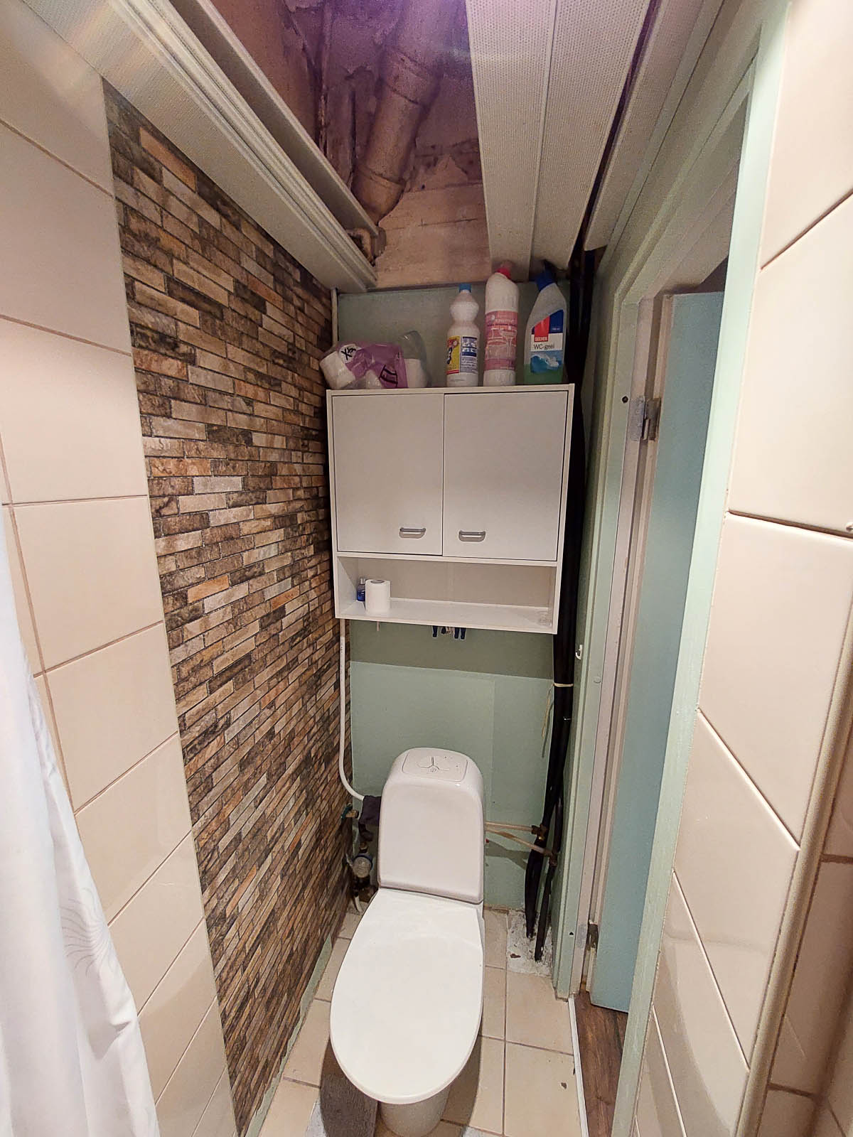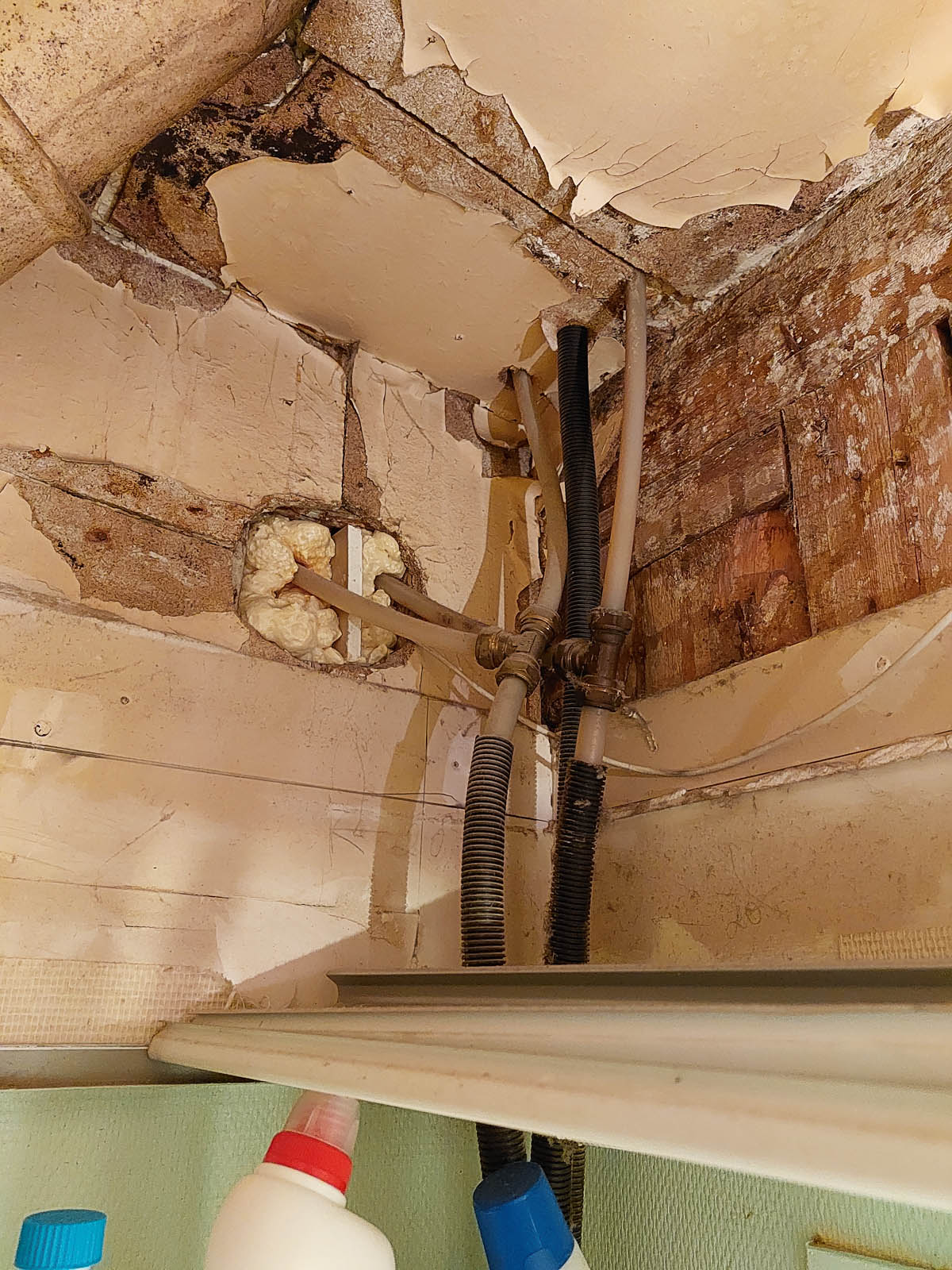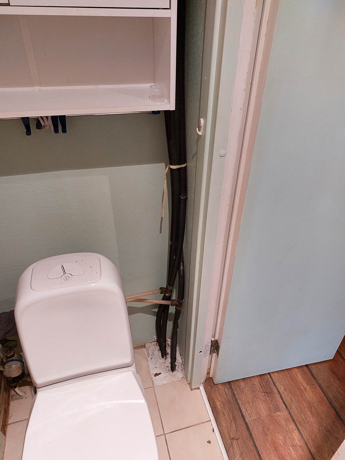 Uued veetorud üle lae mõõdikust dušši ja valamuni. Ülemisele korrusele viivatele torudele karp teenindusluugiga ümber.