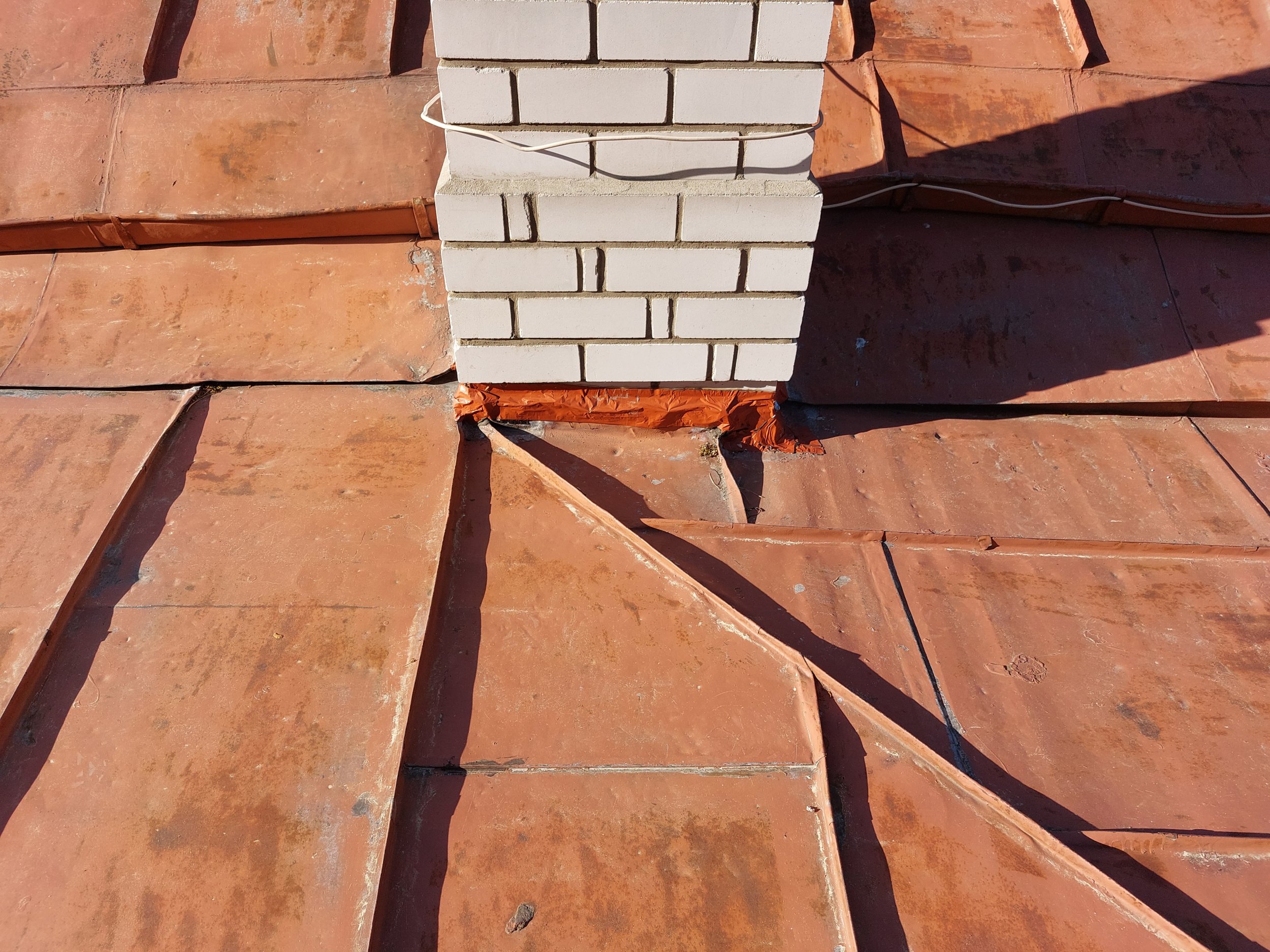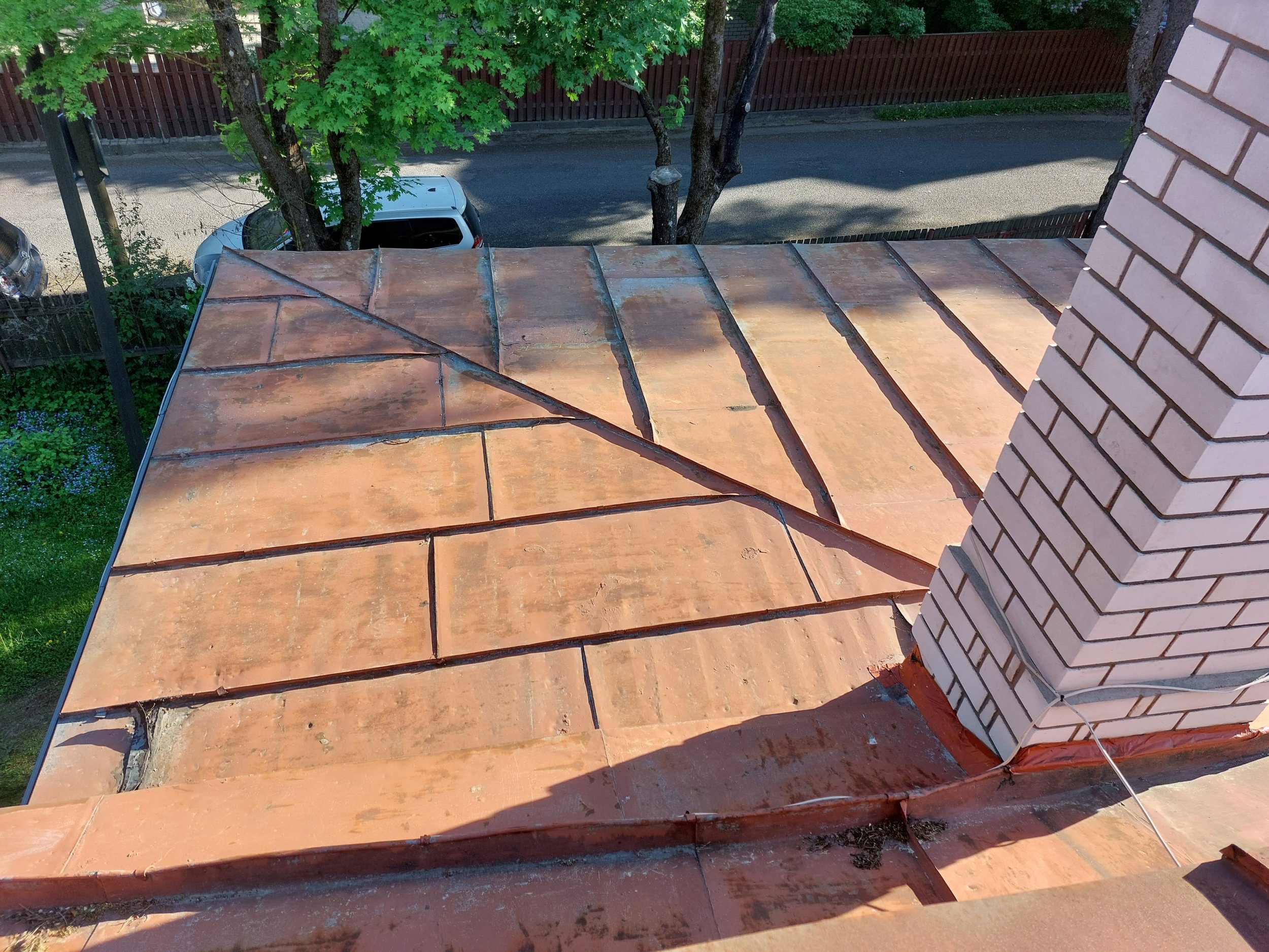 Meie maja katuse väiksem osa on lame valtsplekk-katus. Lamekatuse pindala on suurusjärgus 20-25 ruutmeetrit. Katus jookseb läbi, eelkõige siis kui katusel sulab lumi ja külmunud jää. Võib-olla jookseb läbi plekitahvlite liitekohtades ja võib-olla viilkatuse ja lamekatuse ülemineku kohast (vaata ka lisatud pilte). Töö alguses soovime saada selgituse, miks ja kuidas vesi katusest läbi jookseb. Töö käigus soovme viilkatuse ja lamekatuse ülemineku ning lamekatuse pleti katmist ja/või parandamistvett pidava ja ilmastikukindla materjaliga.