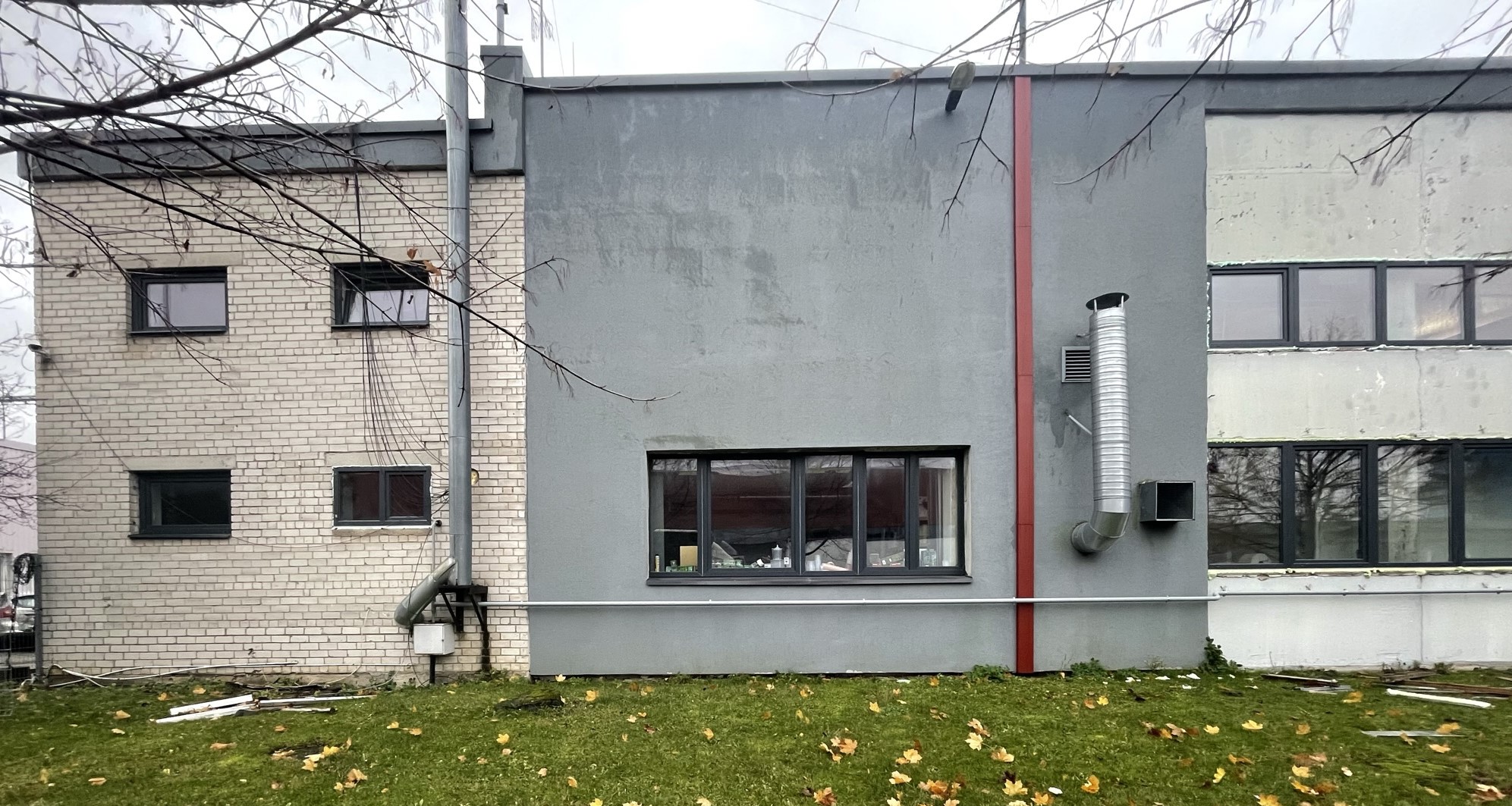 Hoone välissein on suurtest armeeritud (tuha)paneelidest, mis postide külge kinnitatud. Täna katab hoonet krohv. Enamus krohv hästi kinni, mõnes kohas lokaalselt krohv lahti, sealt tuleks krohv eemaldada.