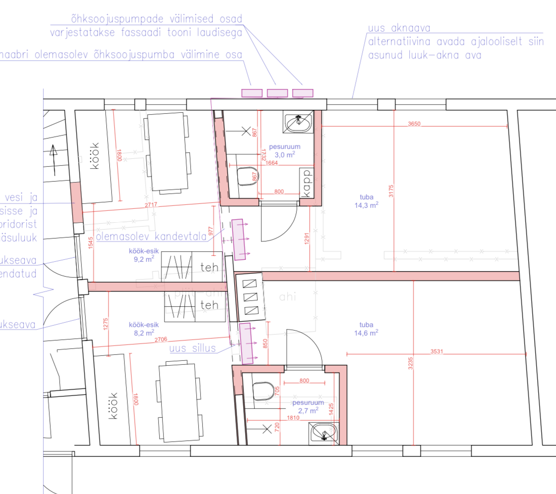*Mõlemale poole uued pesuruumide seinad (pesuruumide suurus tuleb umbes 1650x1400)
