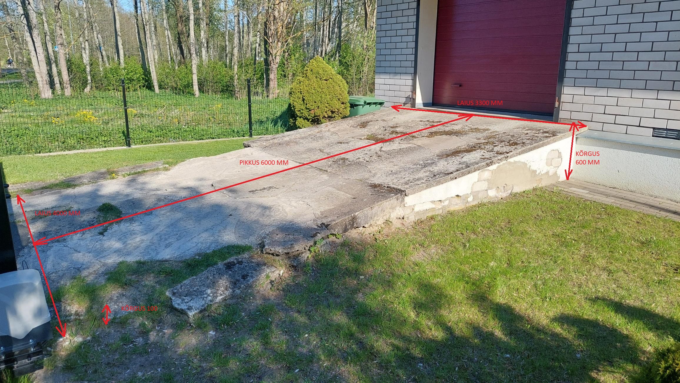 Hinnapakkumine kaldtee ehitusele! Hinnapakkumine sisaldab: 1.) Kaldtee väljalõhkumine ( lõhutakse suure plaanis 8cm pealt maha) 2.)külgede lahti kaevamine 15 cm murust alla poole (rohkem ei ole vaja). 3.)Uued küljed valatakse 10cm laiemaks mõlemalt poolelt. 4.) Rakketis ehitatakse uue või maksimaalselt 1 kord kasutatud vineerist mis eelnevalt puhastatakse. 5.)Faasiliistu paigaldust külgedele 15mm faasiliist. 6.) Armatuuri paigaldust 8mm armatuur 150x150 silmaga. 7.)L- kujuliste rangide paigaldus seina ja põranda ülemineku juurde (paigaldus samm300mm). 8.) Ukse alla sirge joone lõikamine (hälve +-3mm) 9.)Kaldtee valamine 10.)Kaldtee lihvimine 11.) Rakketise lahtivõtmine Hinnapakkumine ei sisalda pinnakõvendit kuna pinnakõvendi annab maksimaalselt välja sama survetugevuse kui 30/37 betoon. Hinnapakkumine sisaldab valget betooni ja muid materjale. Betoon ei jää päris lumi valge. Betoonimark 30/37 ,graniidiga ,dmax16 ,toodeldavus s4. Ilma värvilise betoonita tehes on hind 400+km soodsam. Saaksime hinda veel allapoole tuua kui lõhuksime mõlemast kaldtee otsast maha kuskil meetri ning valaksime kaldtee alguse ja lõppu 1.5 cm kaldega ning ülejäänud kopeeriks suures plaanis alumise põrandaga .(-300 eurot ) Parimate soovidega Indrek |