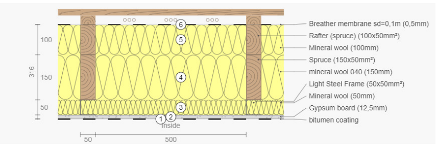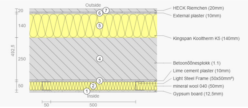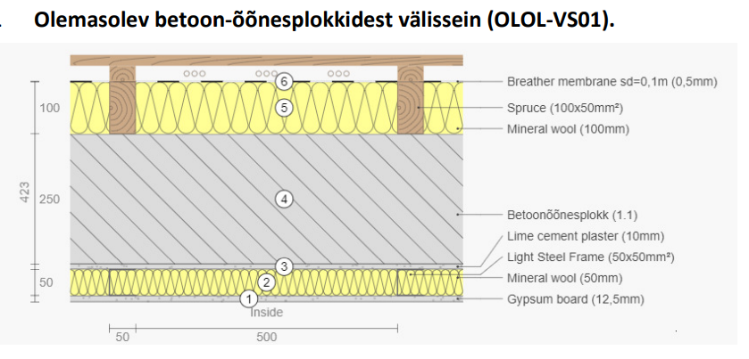 Olukord: Olemasoleva betoon-õõnesplokkidest seina konstruktsiooni vaata Joonis 1 ning sauna seina puitkonstruktsiooni vaata Joonis 2.