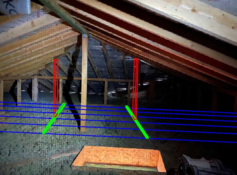 Käesoleva töö käigus on arvamuse koostaja projekteerinud lahenduse roodsarikate tugevdamiseks. Lahendus seisneb täiendavate puitelementide paigaldamisel pööningul kõikide roodsarikate alla, mille eesmärk on vähendada roodsarikate arvutuslikku sildeava ja sellest tulenevalt vähendada ka nendes mõjuvaid sisejõude ning toereaktsioone. Iga roodsarika alla tuleb paigaldada puitpost ristlõikega 100x100 mm ja selle alla omakorda horisontaalne puittala samuti ristlõikega 100x100 mm (puitmaterjalide tugevusklass C22). Horisontaaltala tuleb toetada vahetult vahelaetalade ülapinnale (selleks tuleb eelnevalt lokaalselt eemaldada puistevill talade pealt), nende suunaga risti, et koormus jaotuks ühtlasemalt vahelaele ringi. Posti asukoht roodsarika all tuleb valida nii, et see jääks sarika harjapoolse sildeava suhtes võimalikult keskele (vt ka allolev mudel).