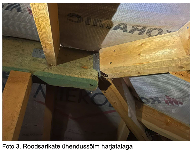 Ekspertiisis välja toodud roodsarikate ja harjatala ühendussõlme mittevastavus nõuetele on sisuliselt õige tähelepanek, sest mitmed konstruktiivsed nõuded ei ole täidetud. Sellest tulenevalt tuleb iga roodsarika kinnitussõlmes harjatalale paigaldada täiendavad naelutusplaadid talade külgpindadele ning paigaldada 4+4 d4 naela min 50 mm kaugusele elementide otstest (4 naela harjatalas, 4 naela roodsarikas).