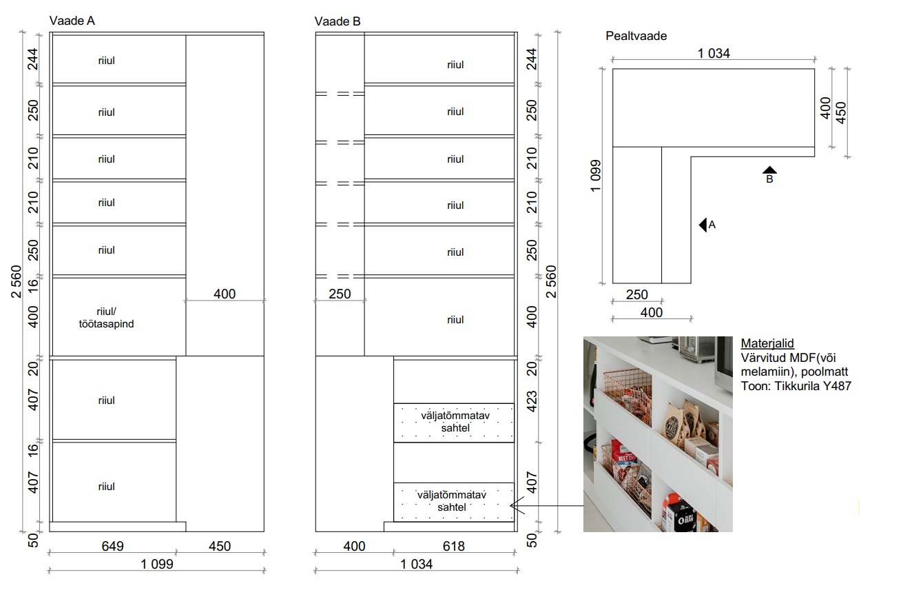 Soovin leida partnerit sahvri riiulite ehitamiseks. Manuses on ehituse alguses loodud joonis, reaalse koostöö võimalusel peaksime kohapeal kohtuma ja objekti üle mõõtma. Sooviksin orienteeruvat hinnapakkumist tootele.