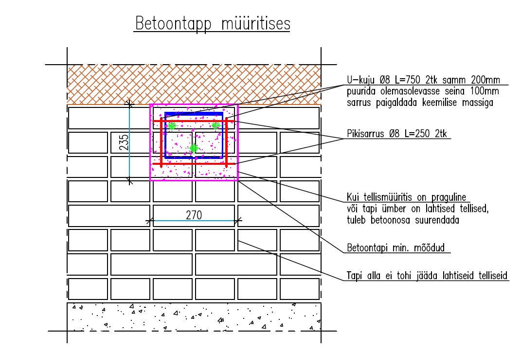 Põhja Tallinnas asuva kortermaja soklisse tuleb ette tehtud aukudesse valada 108tk betoontappe. Betoontapid tuleb tugevdada U ja pikisarrustega mis ankurdatakse keemilise ankrumassiga. Võimalusel pakkuda tööd koos kõikide vajalike materjalidega. Võib pakkuda ka ainult töö tegemist. Augud 108tk soklis on ettevalmistatud tellija poolt.