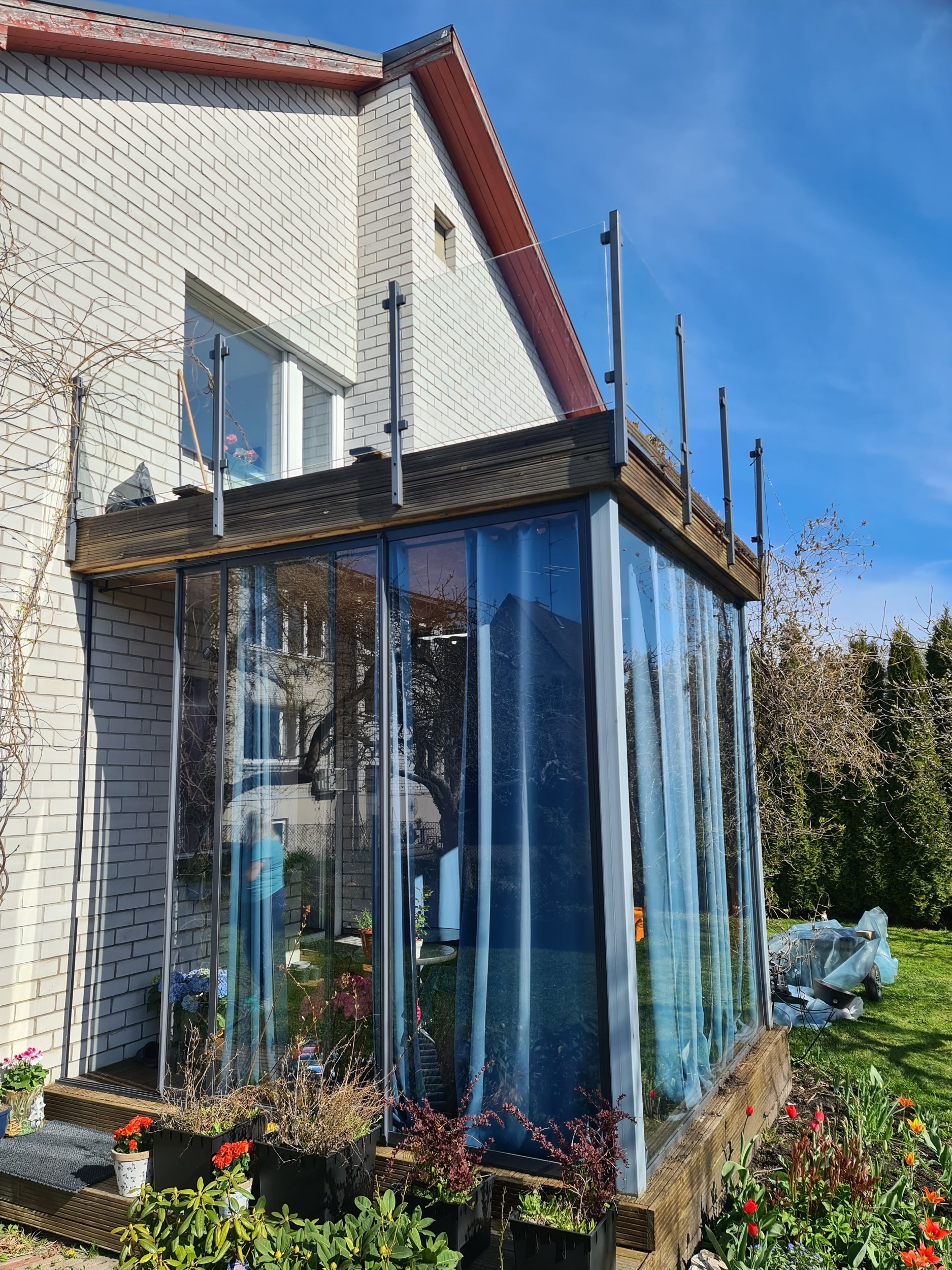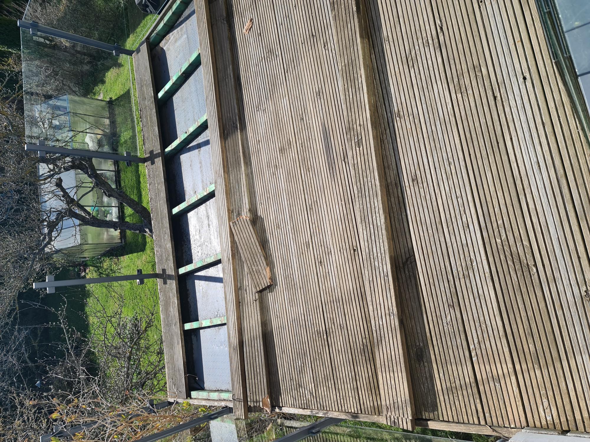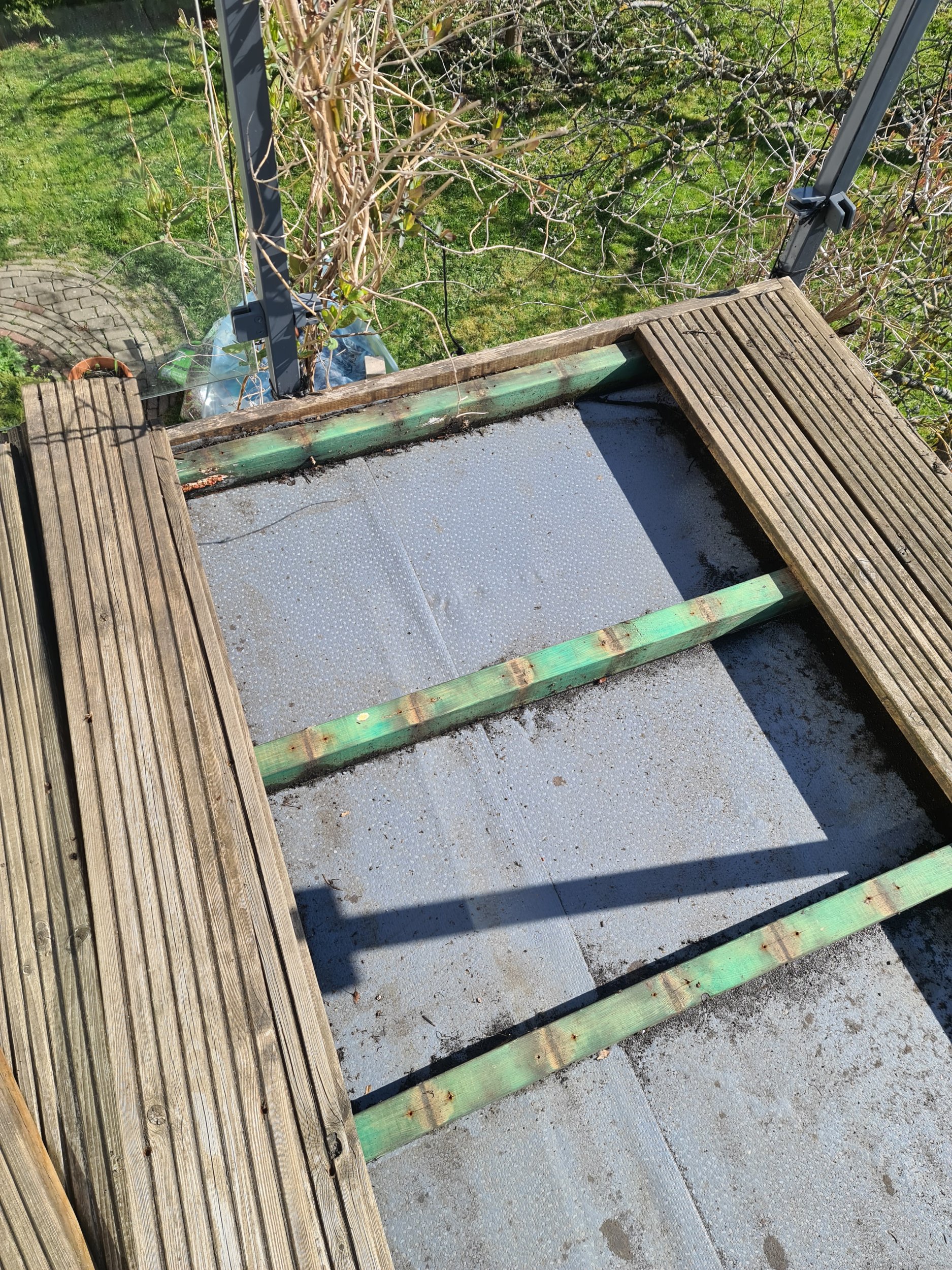 Ilmselt on rõdu ja terrass (vt. pildid) pisut vajunud ning vee äravool pidurdus. Seisma jäänud vesi tekitas läbijooksu ning vesi on kahjustanud ka rõdu puittalasid. Vaja oleks kogu rõdu laudis (nii rõdu tasapind kui väline vooderdis) välja vahetada ning tõenäoliselt uuendada ka talad, mis pildil näha. Ühel on näha seenkahjustust. Vaja oleks lisada ka vihmavee renn, et vesi ei jookseks lillepeenrasse ja terrassi äärele.