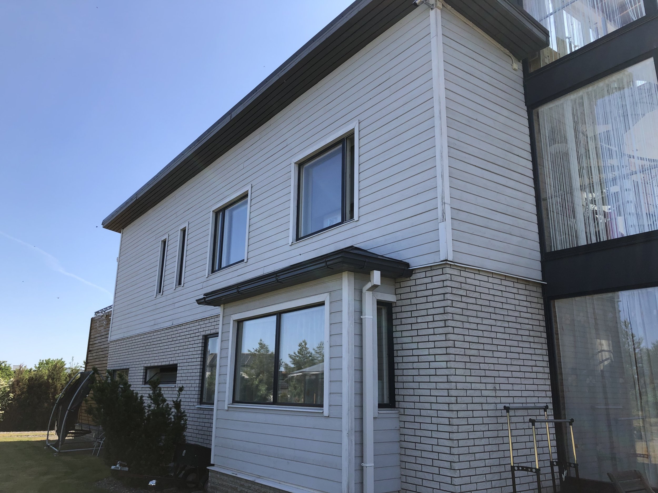 2. Korruse välisseinte ja tuulekasti hooldusvärvimine linaôlivärvidega ja nurgalaudade vahetus 2k. (3 nurka) ja 1.k (2nurka). Ligipääs ja manööverdamisruum autoga/tôstukiga olemas, muru on sile ja kannab hästi. Seinapindade maht ca 60+6+3m2, nurkasid ca 17jm, tuulekaste ca 17jm. Voodrilaudade lokaalne vahetus vajaduse korral eraldi kokkuleppel. Värvid ja lauad tegija poolt, värvikoodid olemas.