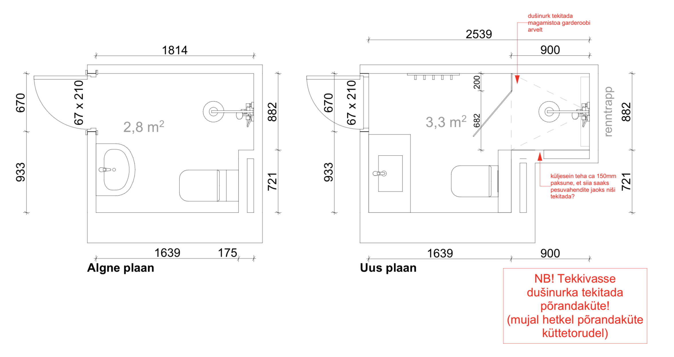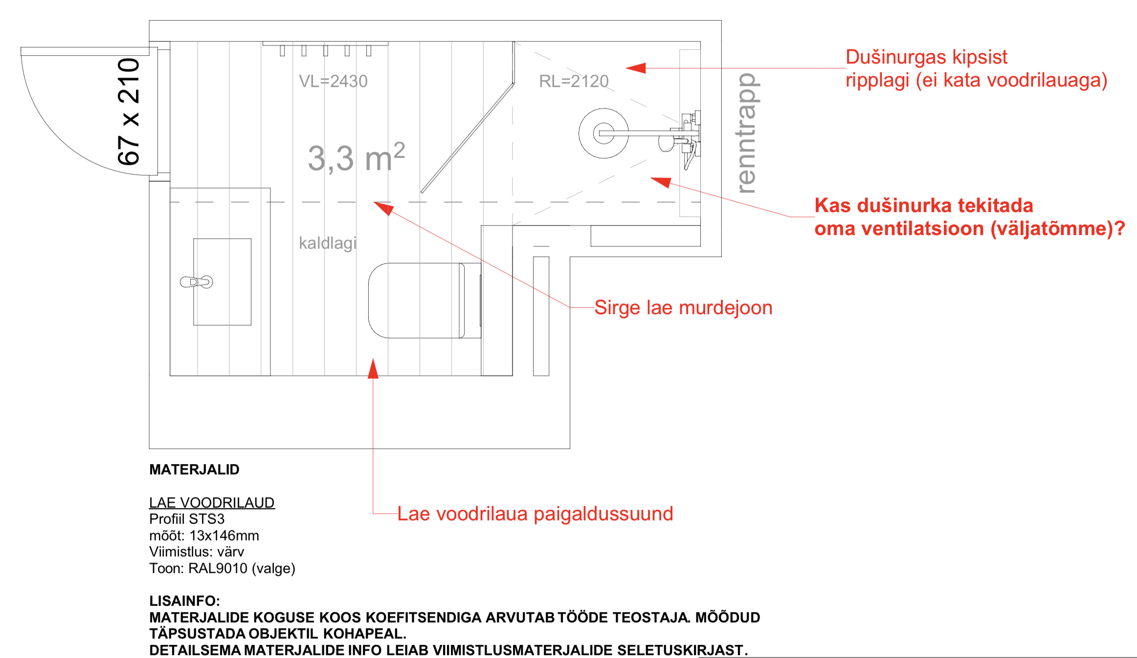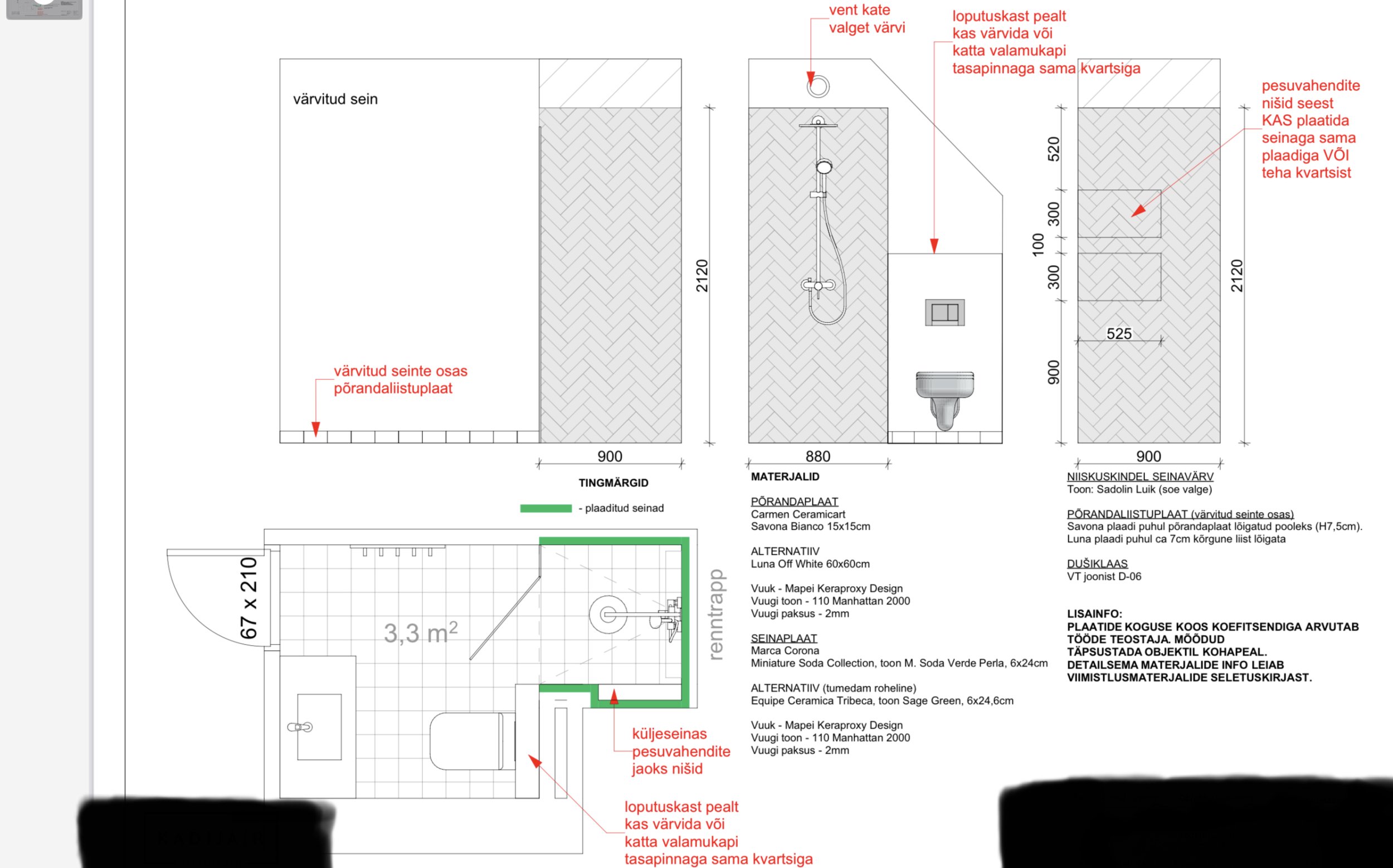 Olemasolevad plaadid ja santehnika eemaldan ja utiliseerin ise. Materjalid ja santehnika suures osas olemas. Kõik tööd vastavalt joonistele.