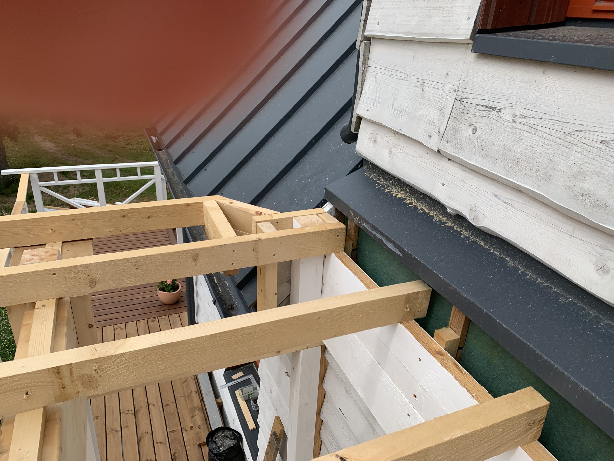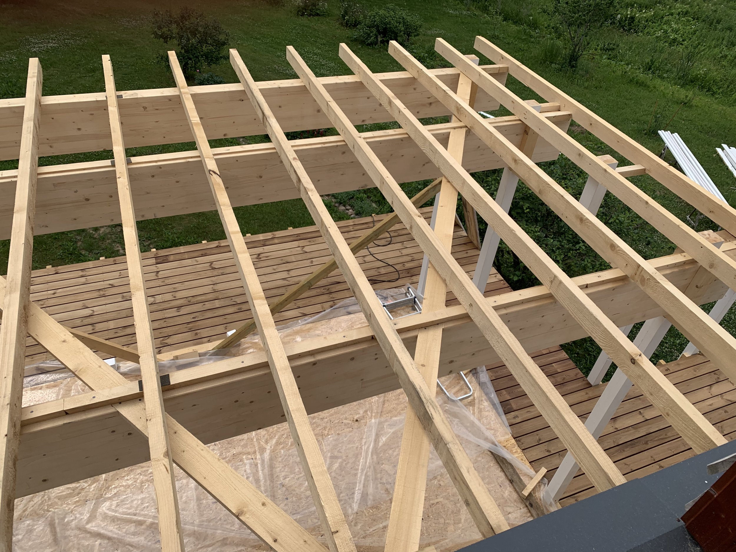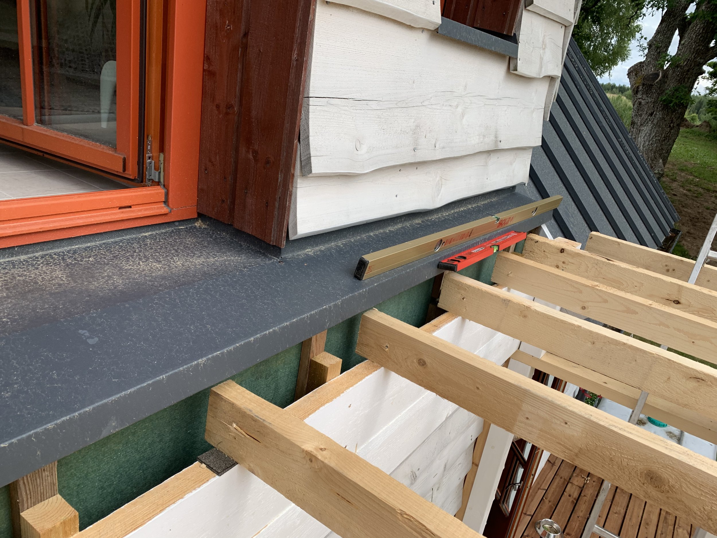 PVC katusekatte paigaldamine veranda katusele, mis on ühtlasi II korruse rõdu põrandaks. Katuse mõõdud 5100x3500. Valmidus ka piirete paigaldamiseks. Hetkel piltidel ehitus pooleli, aga kate tuleb OSB plaadile, mis on eelnevalt paigaldatud.