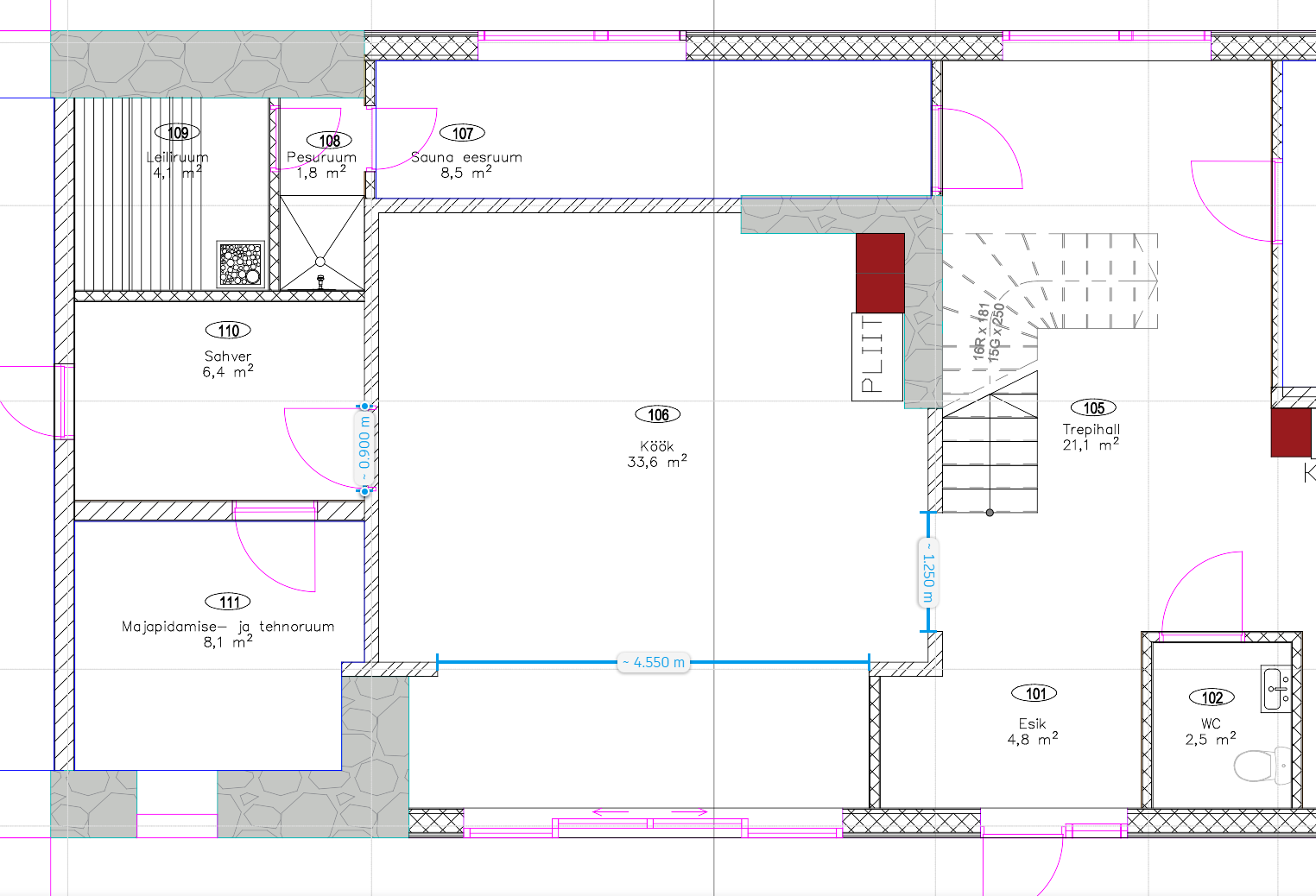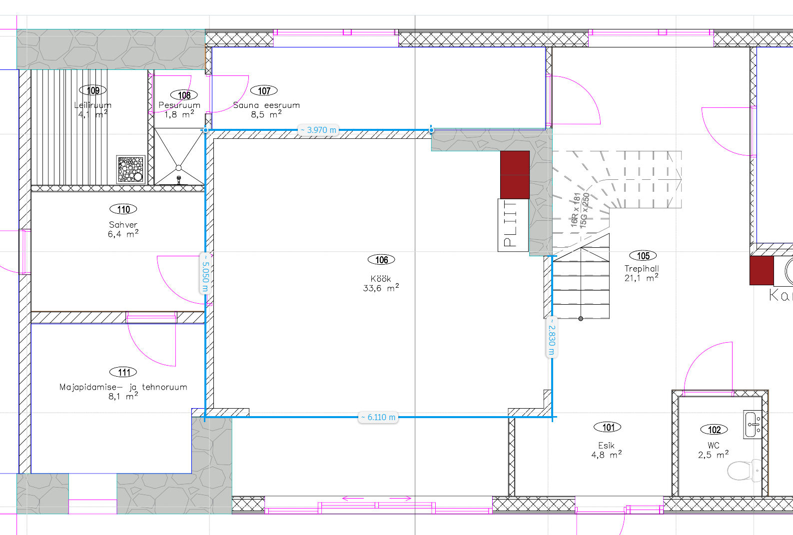 - Pikkuste mõõdud joonistel. Seinte kõrgus 2.6m.