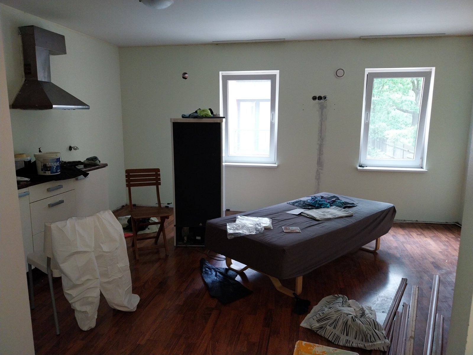Маленькая квартира, 37м2. Нужно покрасить стены, положить новые плинтуса, засиликонить заднюю стенку кухни, повесить потолочную лампу, поставить новую раму межкомнатной двери.
