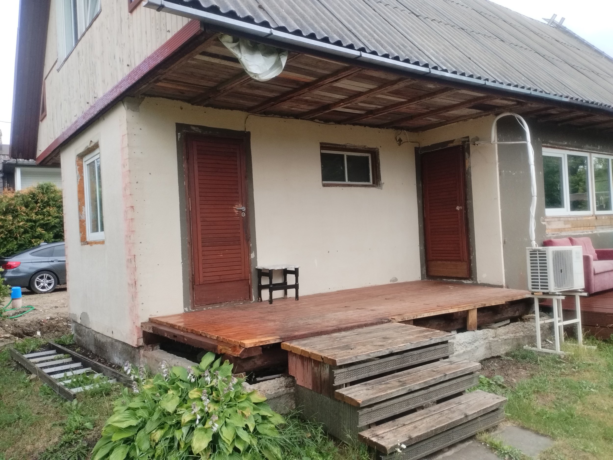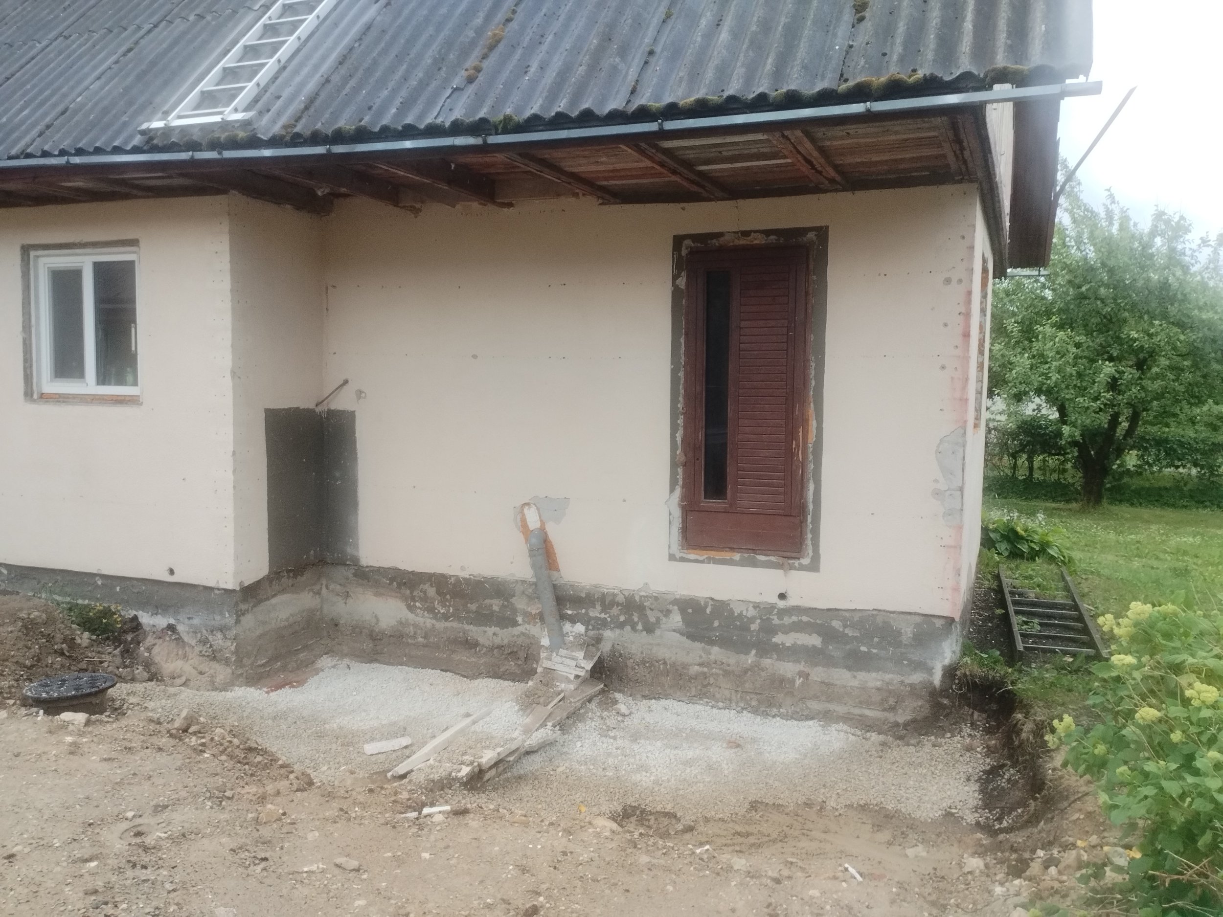 Ühel poolel lahti kaevatud ning killustikuga alt täidetud, teisel poolel vaja vana vundament üle valada (Terrassilauad eemaldan eelnevalt ise, mis fotol näha). Idee poolest ühele (kaevatud) poolele lint alla ja plaat peale ja teisel pool vana üle valada ning plaat.