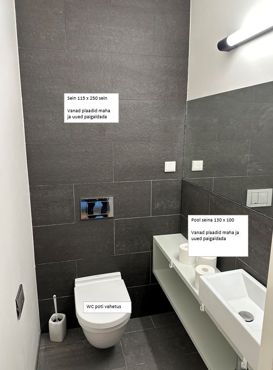- 115cm laiusest ja 250cm kõrgusest seinast vanade plaatide eemaldamine ja uute plaatide paigaldamine.