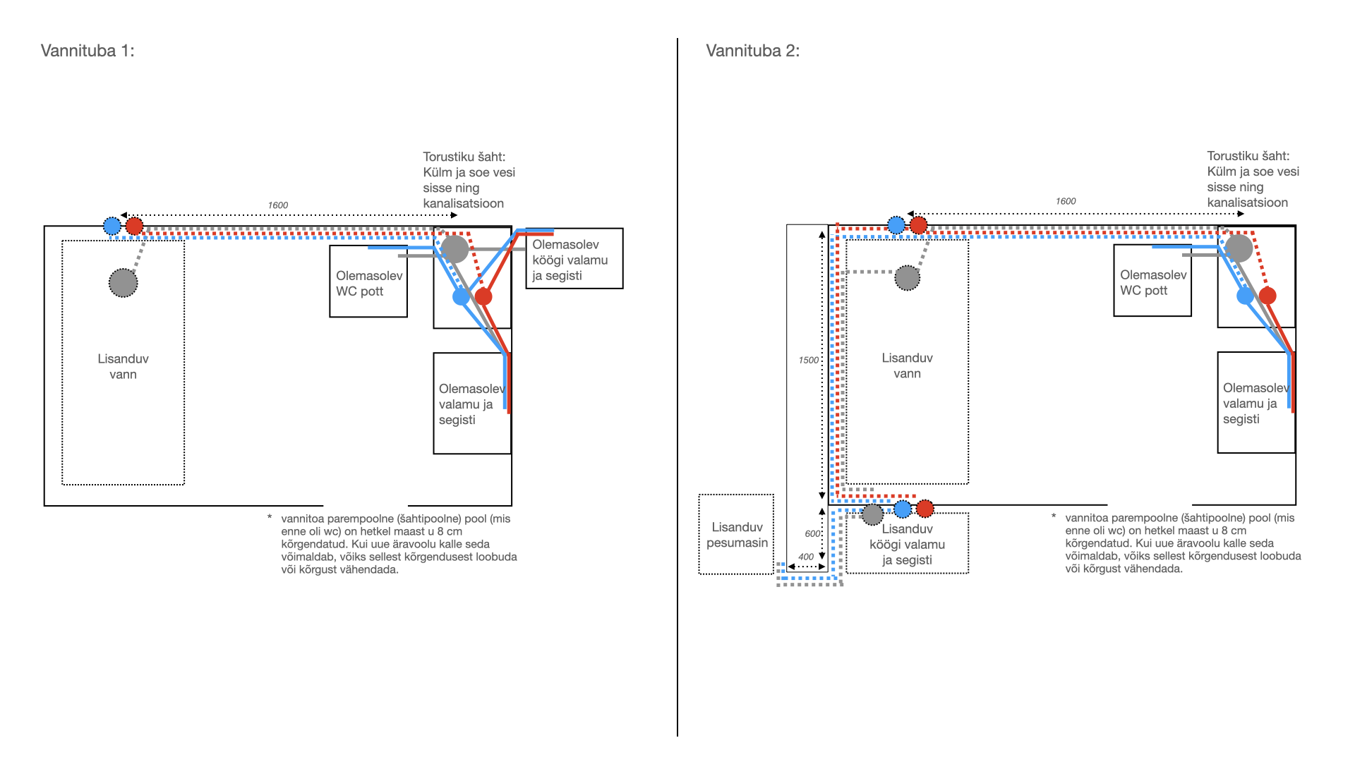 * Vannitoa parempoolne (šahtipoolne) pool (mis enne oli wc) on hetkel maast u 8 cm kõrgendatud. Kui uue äravoolu kalle seda võimaldab, võiks sellest kõrgendusest loobuda või kõrgust vähendada.