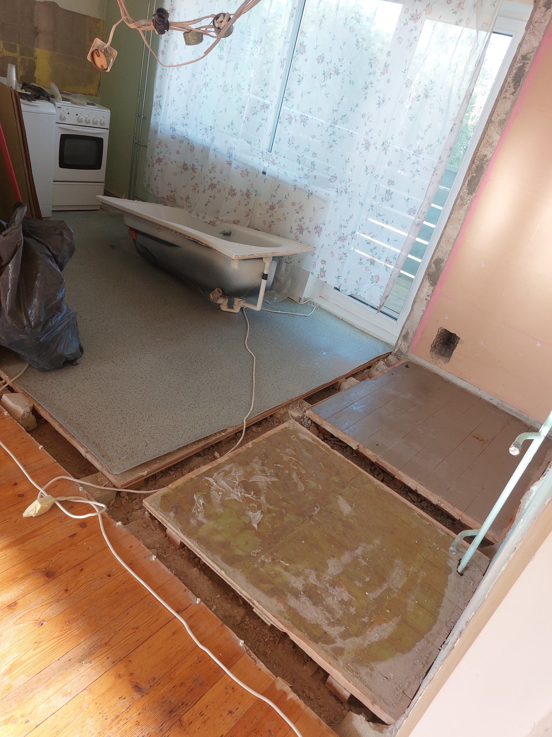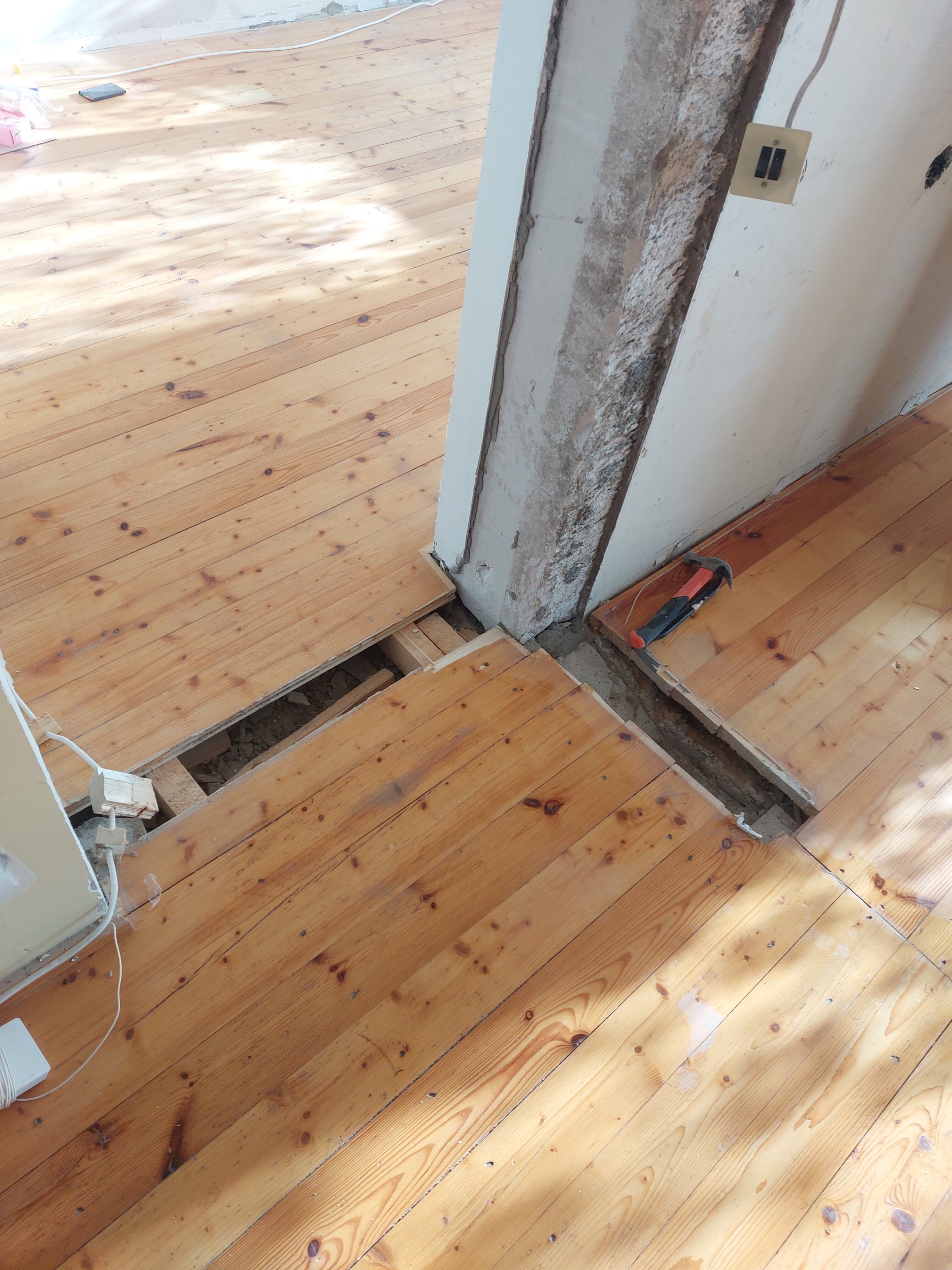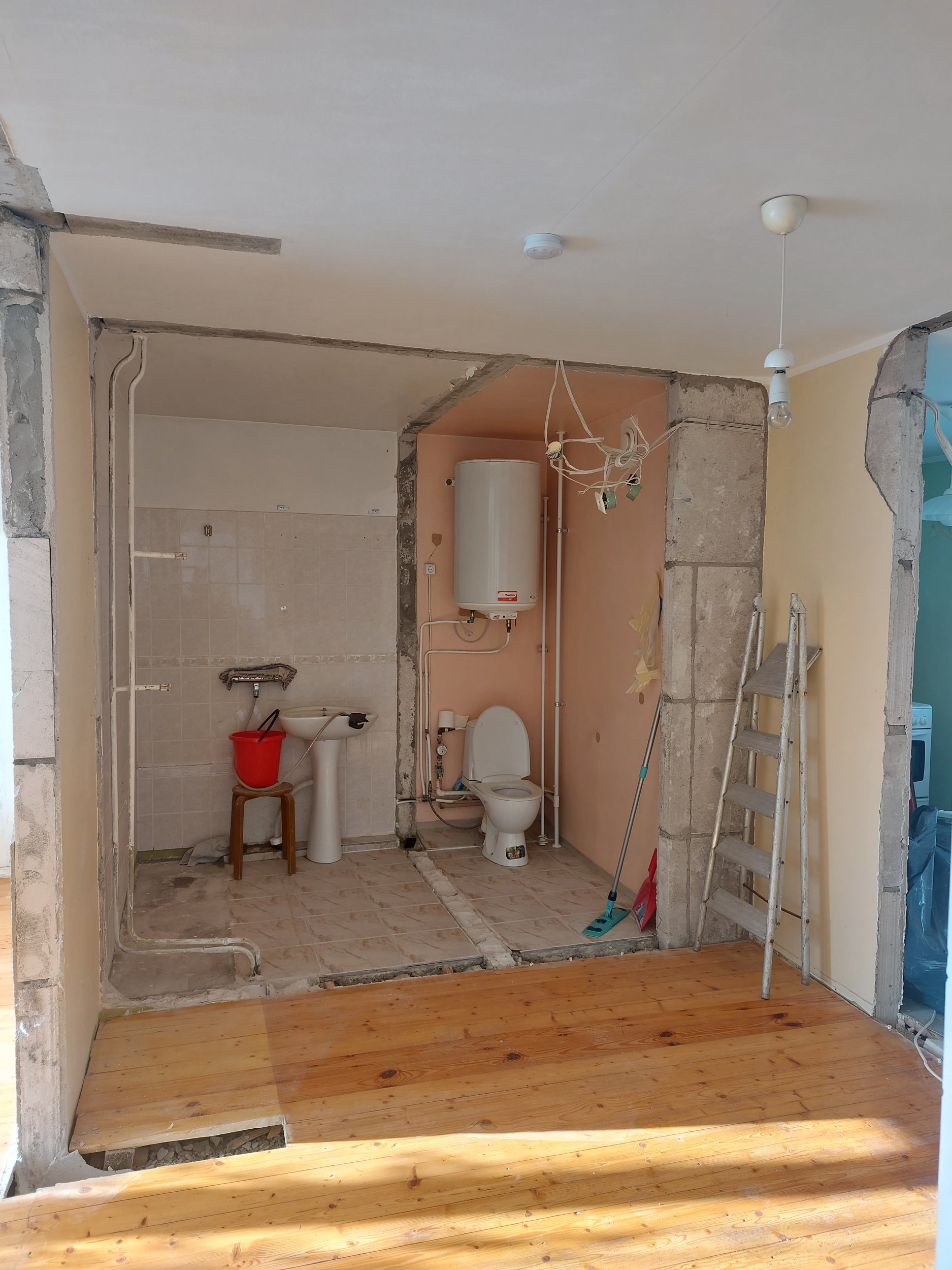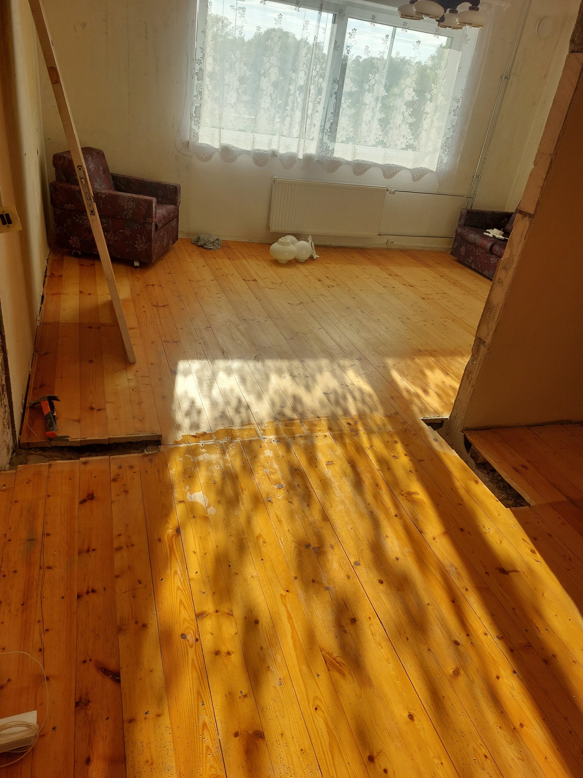 Lammutatud seinte osas uue põranda konstruktsiooni ehitus, eri kõrguste tasandamine , 35m2 laminaadi paigalus, 10m2 plaatimist. Liistude paigaldamine.